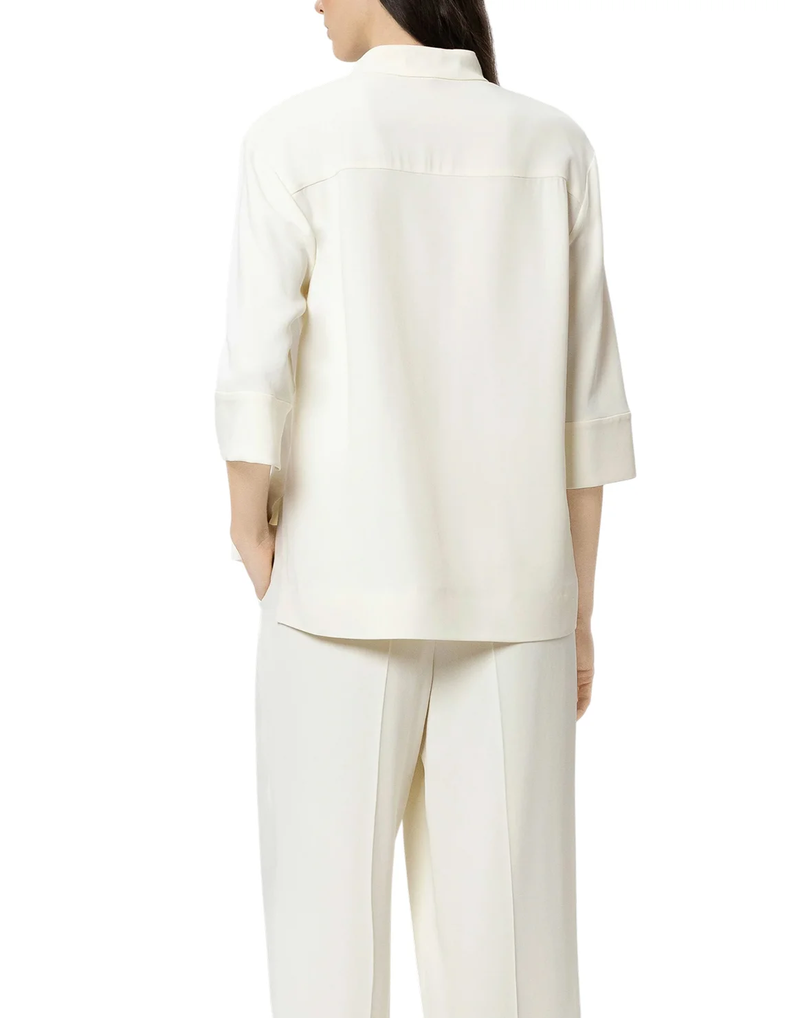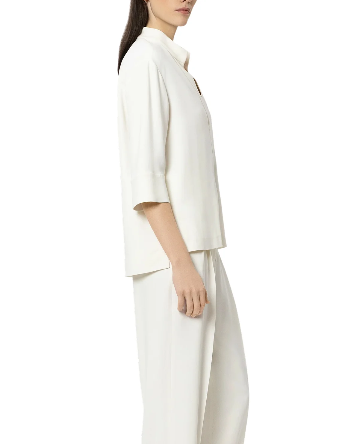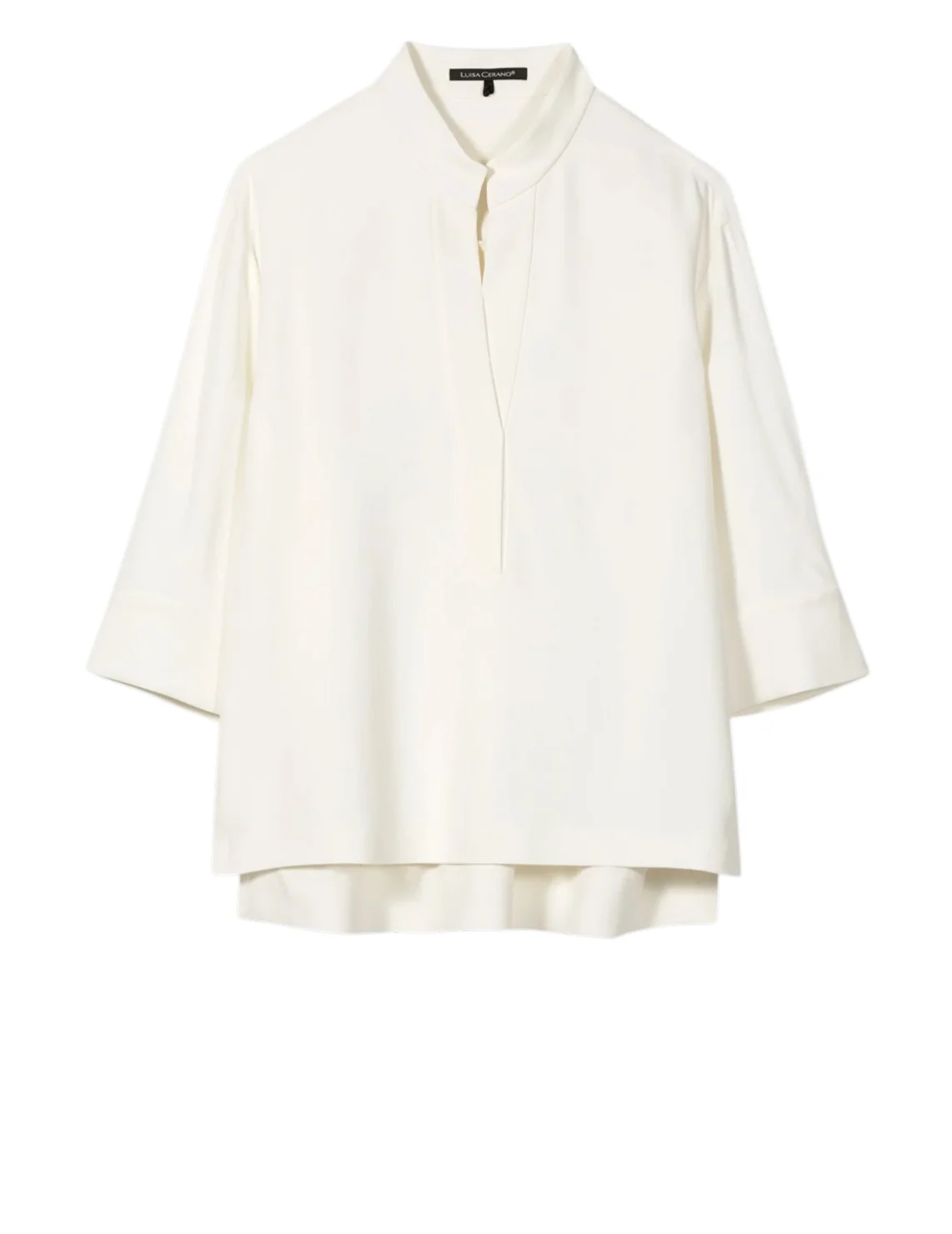 Блуза изготовлена из вискозы и эластана. Модель выполнена в прямом крое. Имеет воротник-стойку, V-образный вырез горловины, асимметричный подол, боковые разрезы и рукава длиной 3/4 с манжетами.