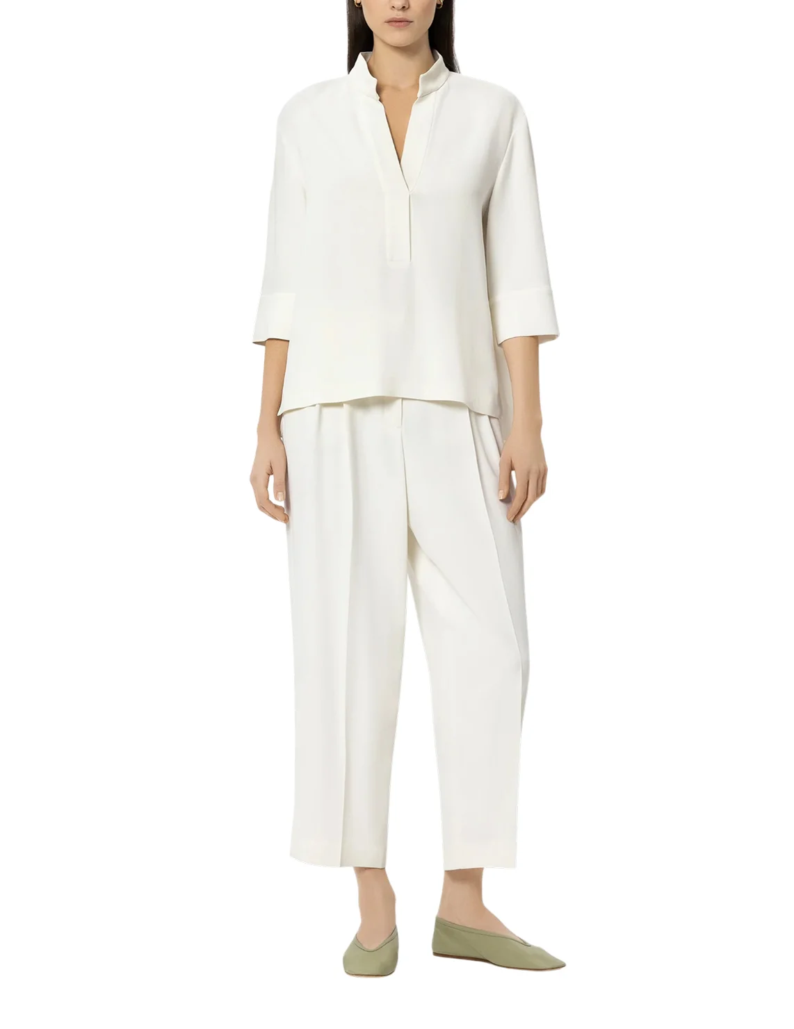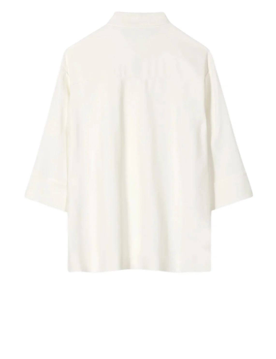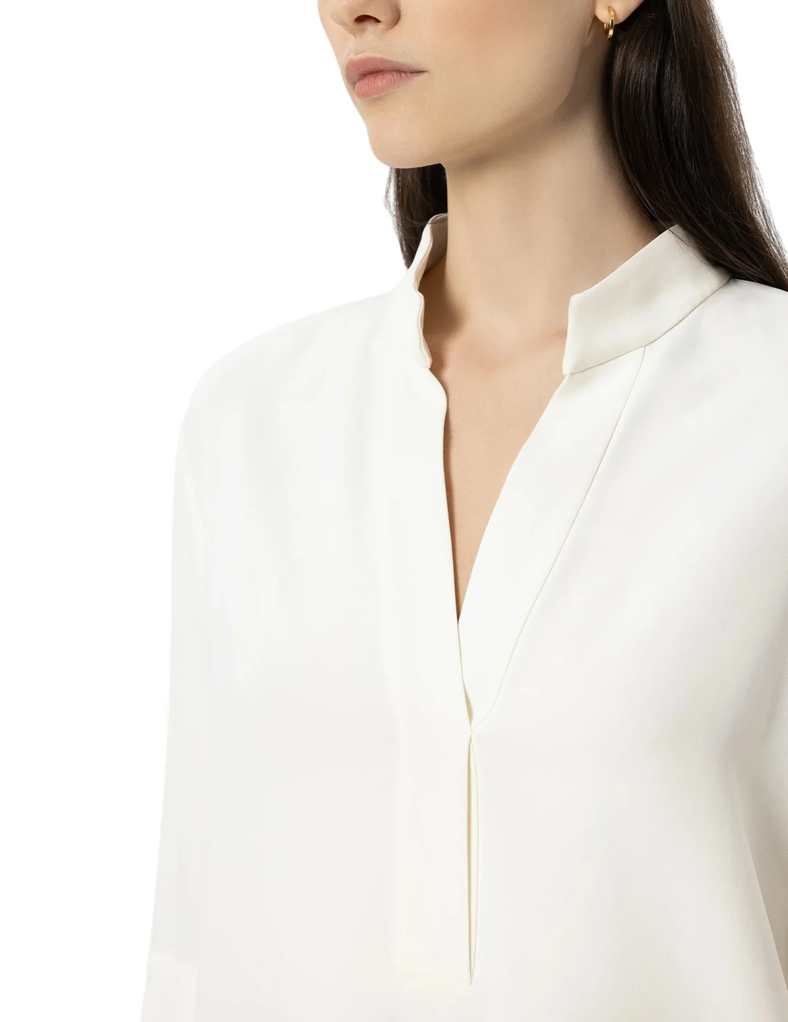 Блуза изготовлена из вискозы и эластана. Модель выполнена в прямом крое. Имеет воротник-стойку, V-образный вырез горловины, асимметричный подол, боковые разрезы и рукава длиной 3/4 с манжетами.