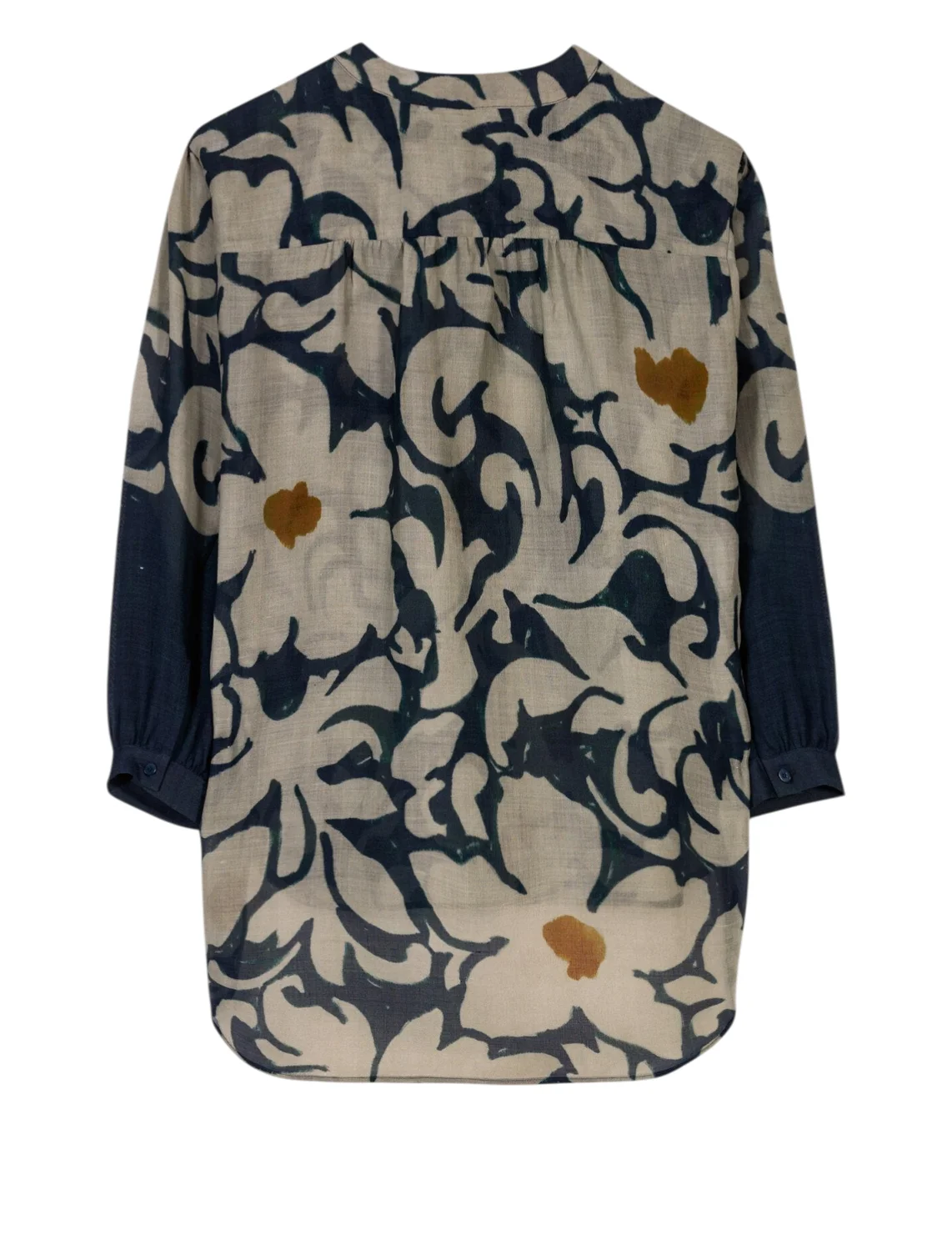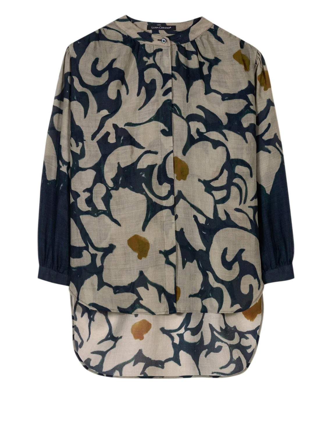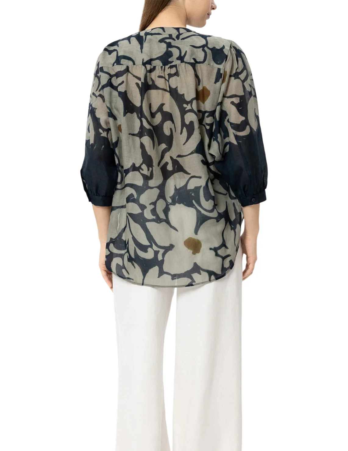 Блуза изготовлена из лиоцела и рами. Модель выполнена в широком крое. Имеет круглый вырез горловины, манжеты с пуговицей на широких рукавах длиной 3/4, а также удлиненная сзади. Застёгивается на скрытую планку с пуговицами. Декорирована эксклюзивным цветочным узором.
