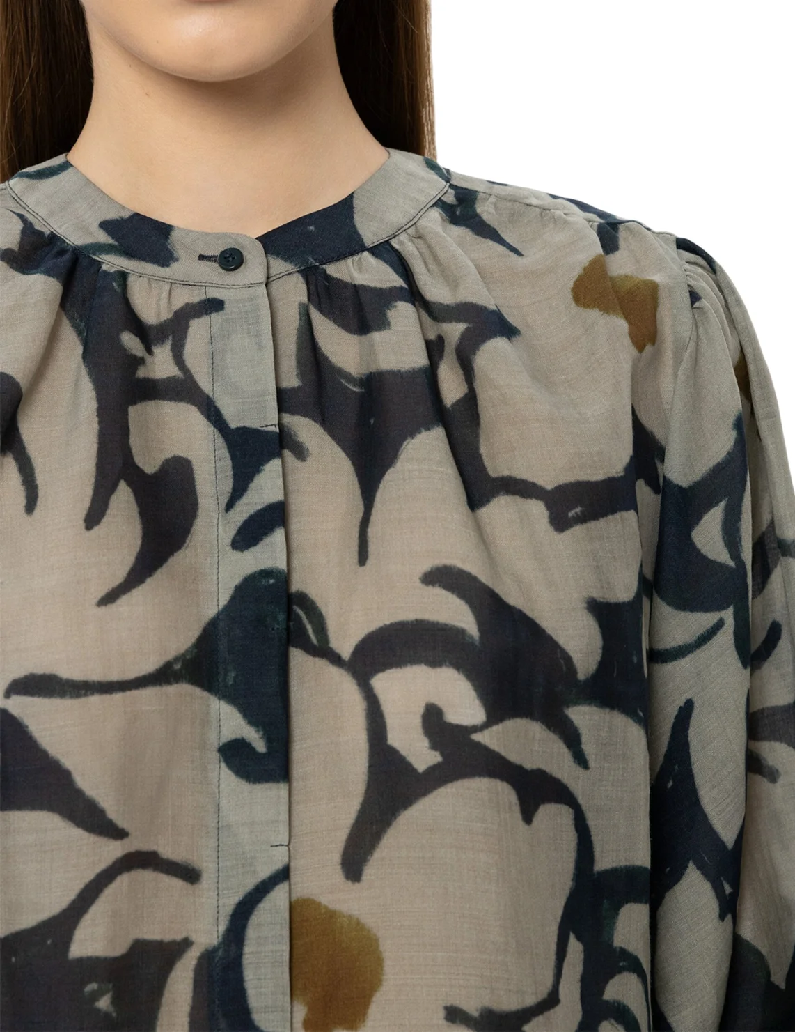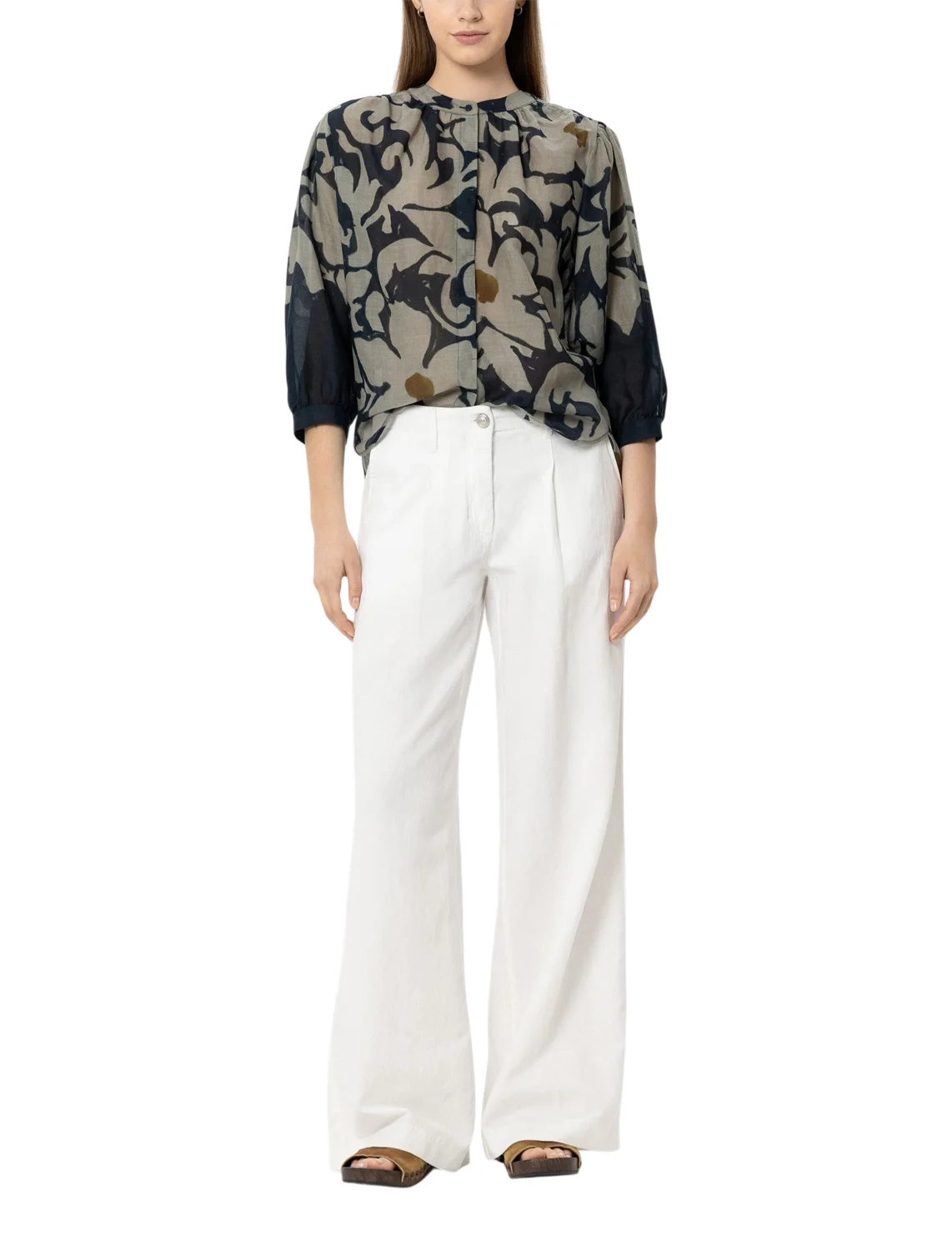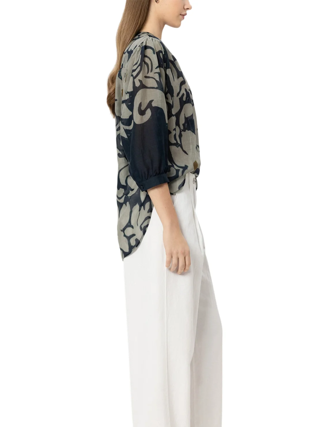 Блуза изготовлена из лиоцела и рами. Модель выполнена в широком крое. Имеет круглый вырез горловины, манжеты с пуговицей на широких рукавах длиной 3/4, а также удлиненная сзади. Застёгивается на скрытую планку с пуговицами. Декорирована эксклюзивным цветочным узором.