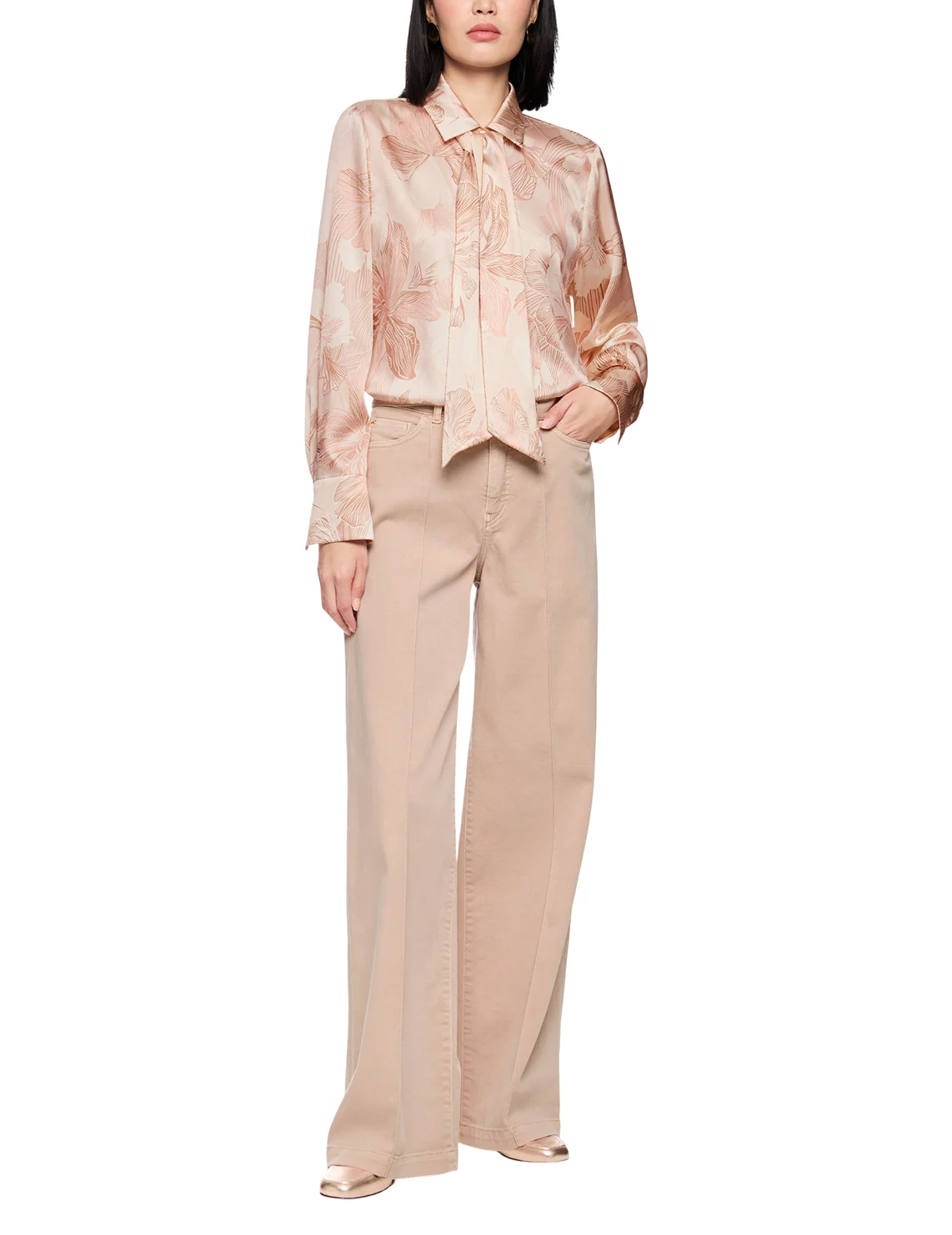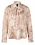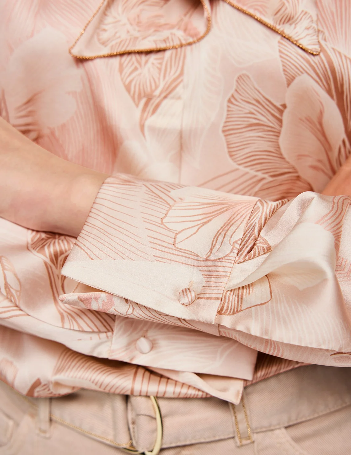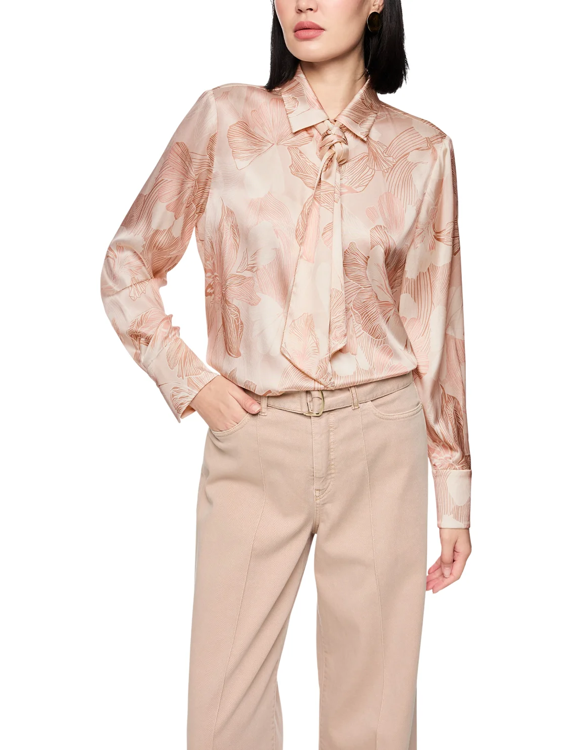 Блуза изготовлена из шелка и эластана. Модель выполнена в свободном крое. Имеет отложной воротник, скрытую планку с пуговицами, боковые разрезы и длинные рукава с манжетами. Декорирована бантом и цветочным принтом.