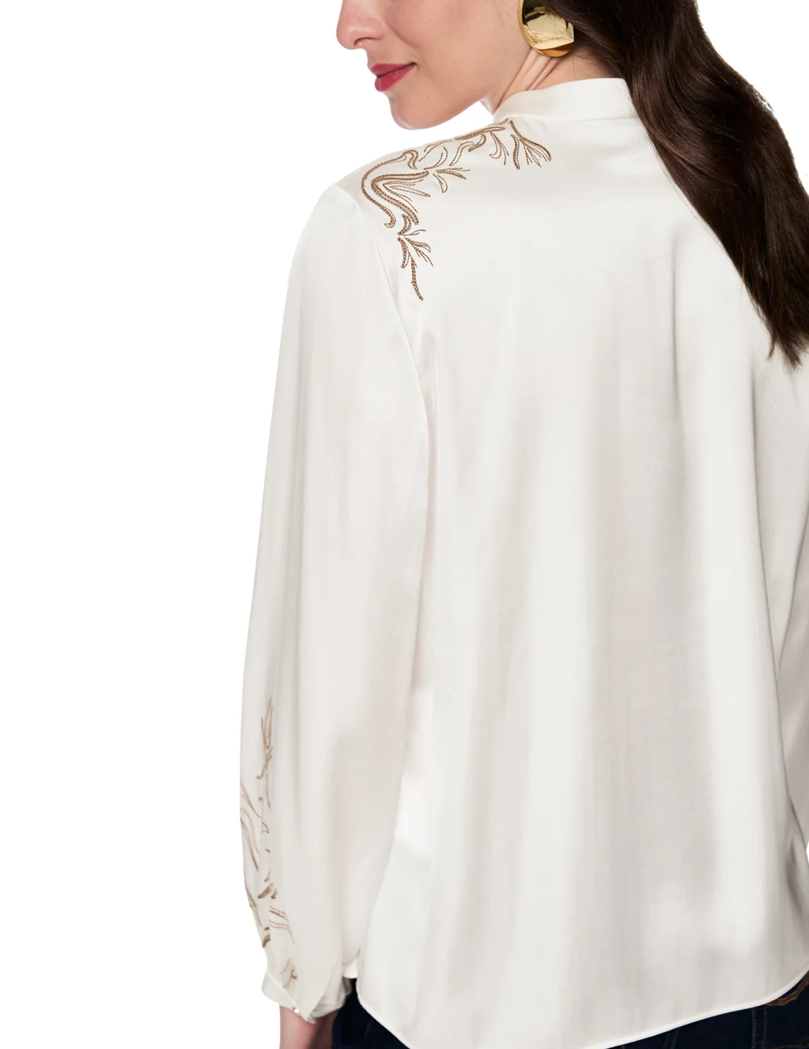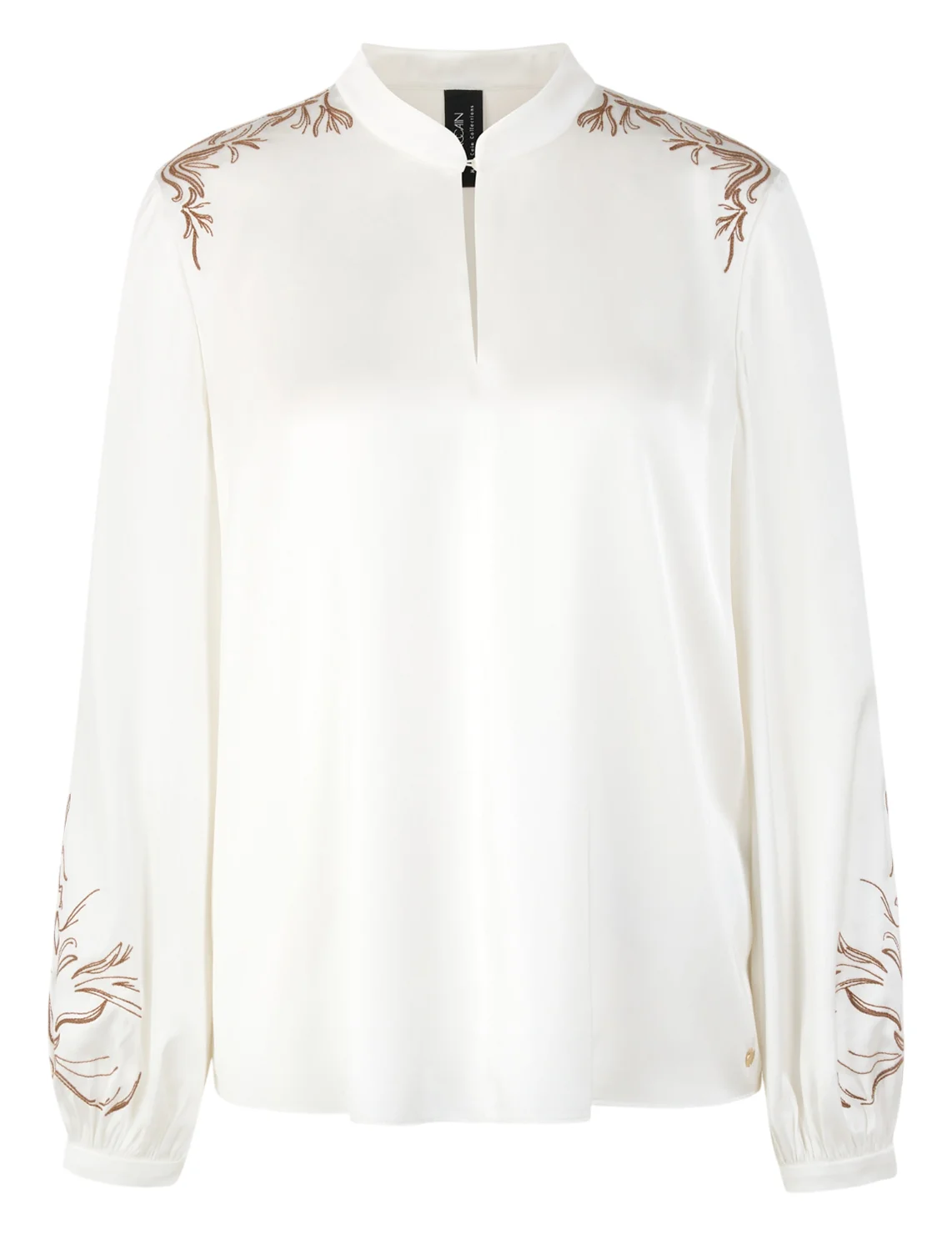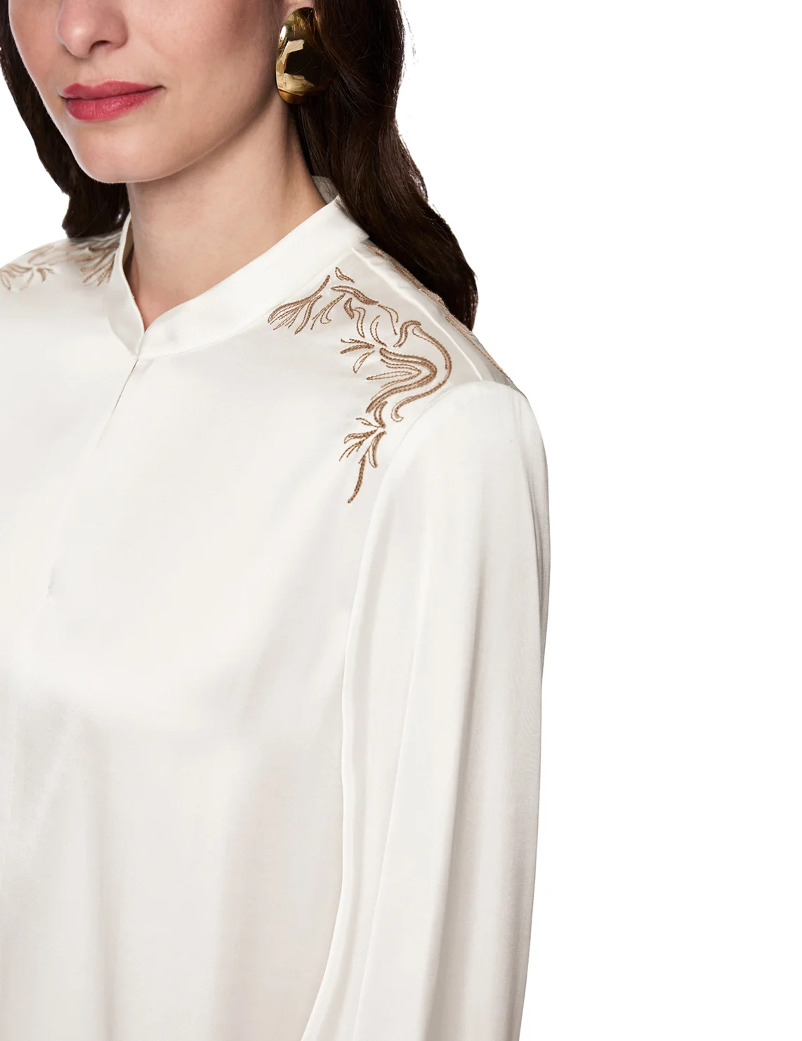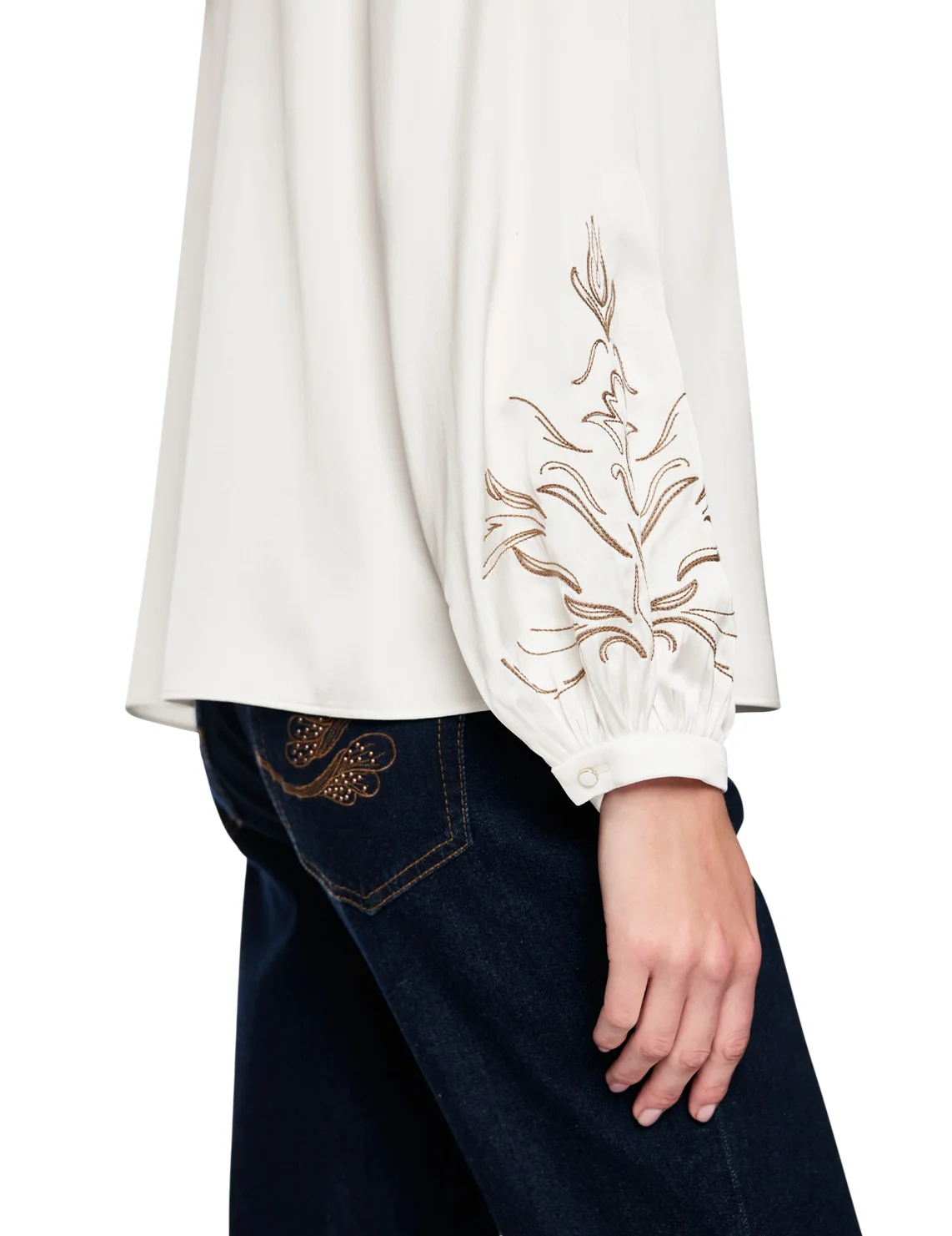 Блуза изготовлена из вискозы и полиэстера. Модель выполнена в свободном крое. Имеет воротник-стойку, застежку на пуговицу и длинные рукава с манжетами. Декорирована вышивкой.