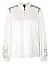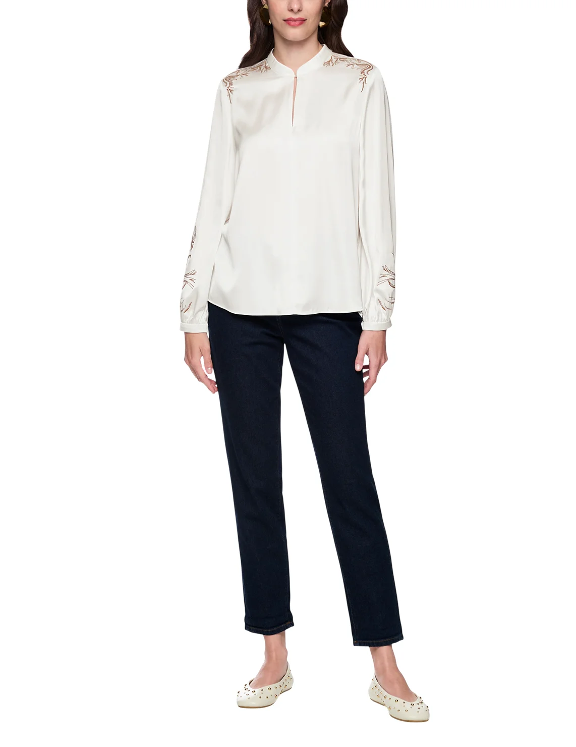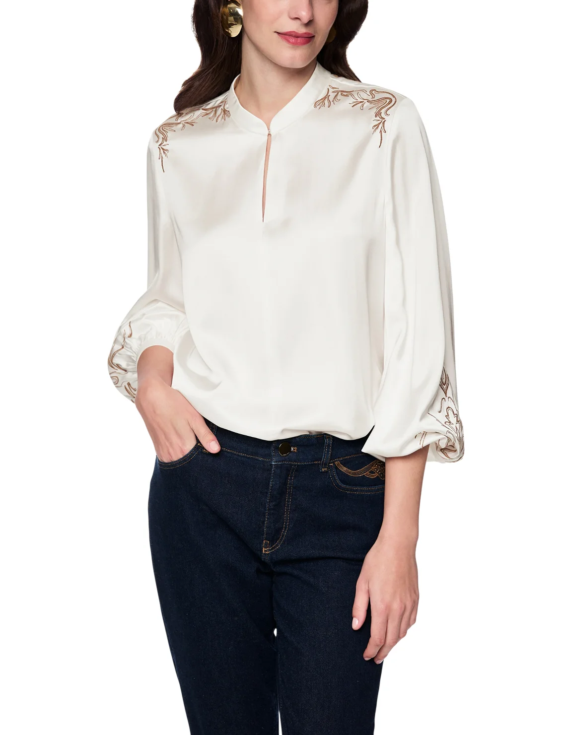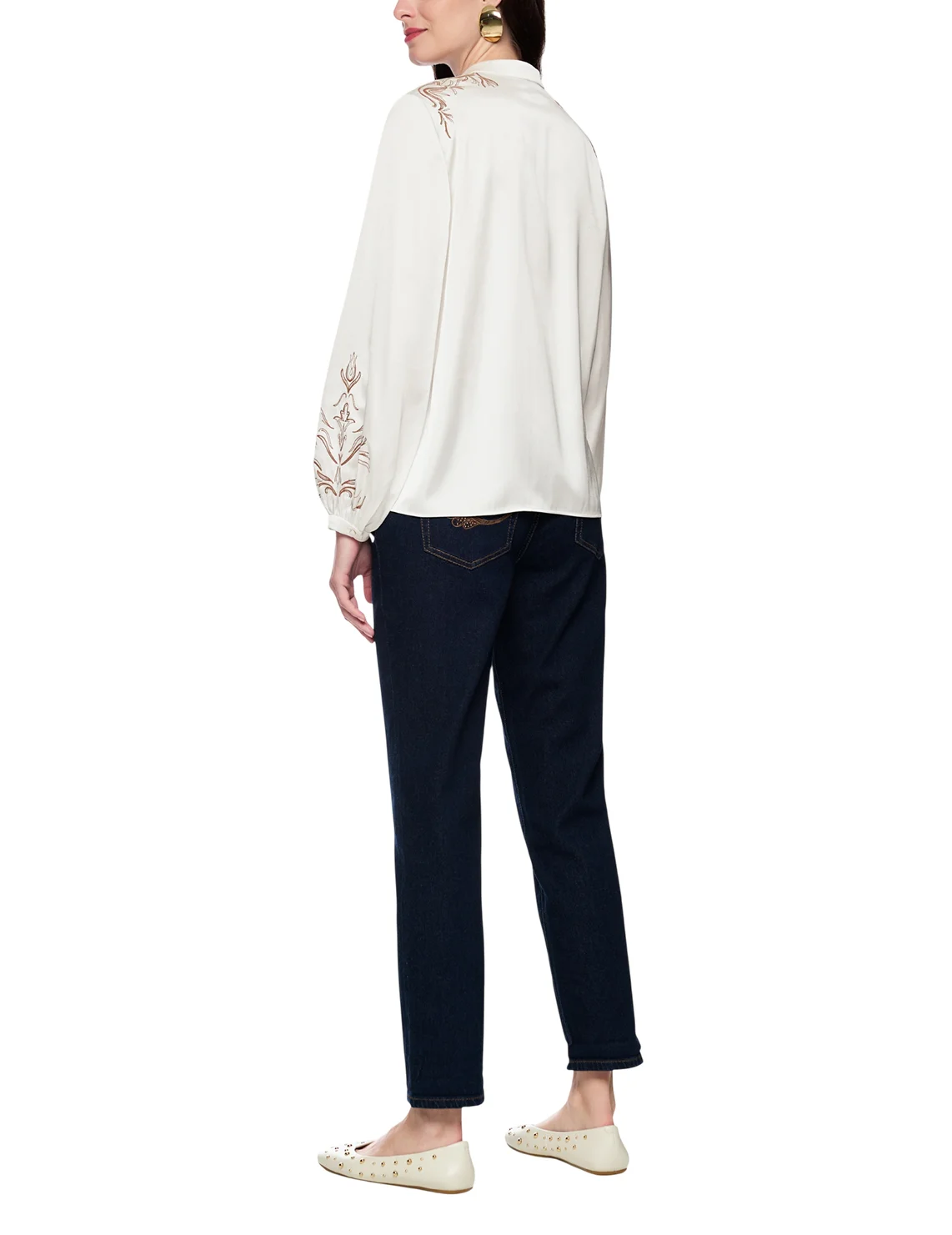 Блуза изготовлена из вискозы и полиэстера. Модель выполнена в свободном крое. Имеет воротник-стойку, застежку на пуговицу и длинные рукава с манжетами. Декорирована вышивкой.