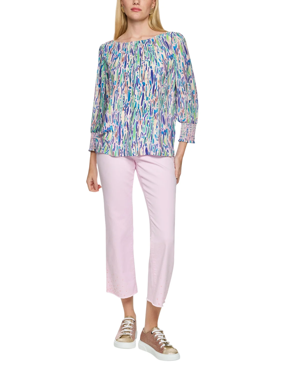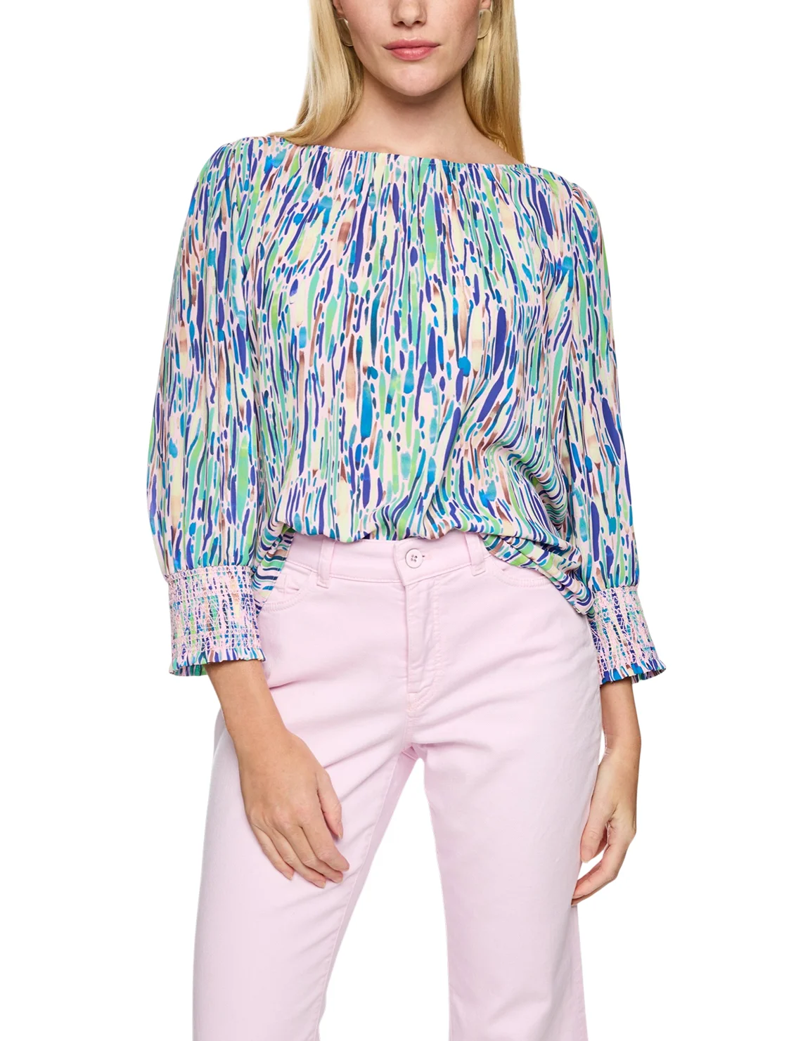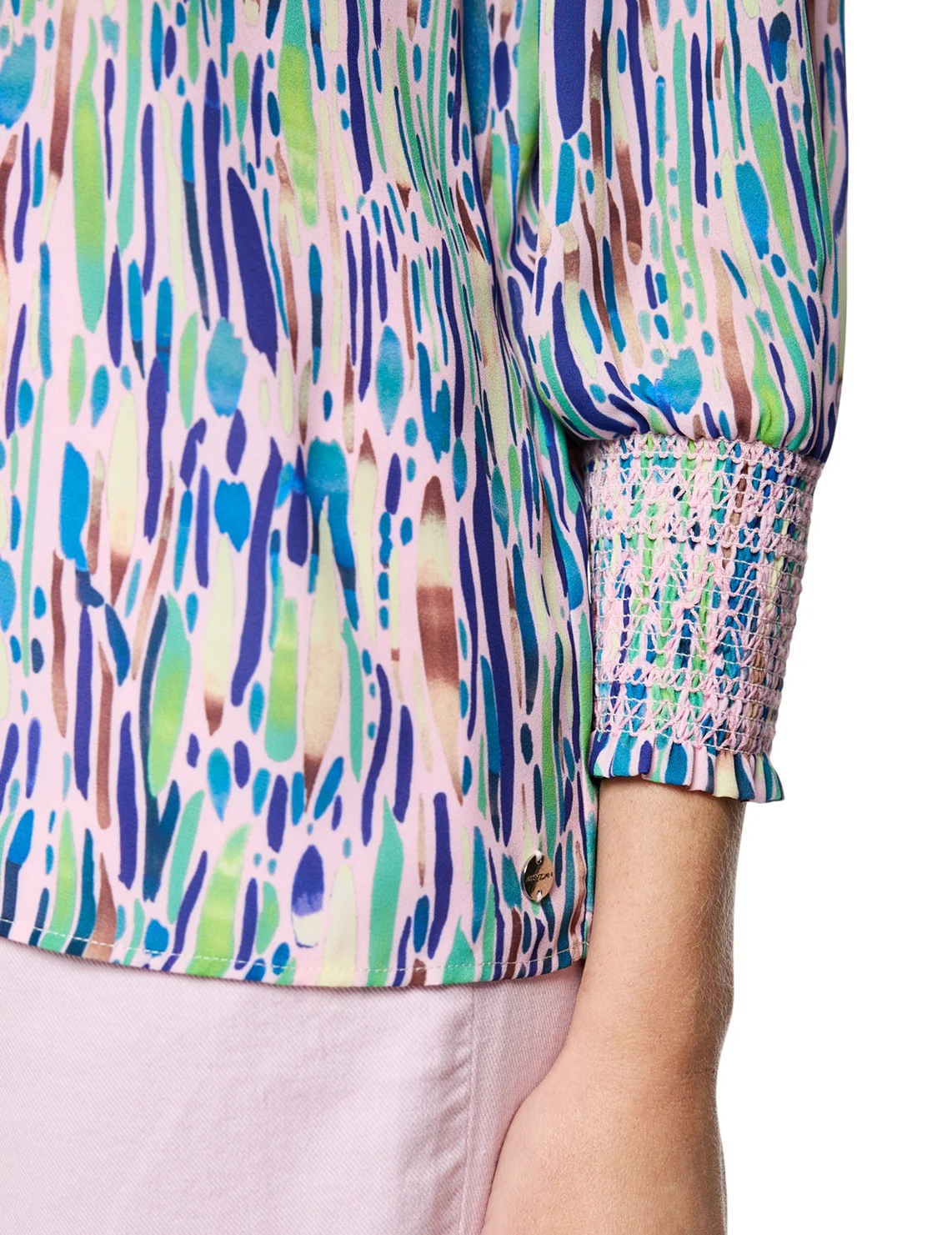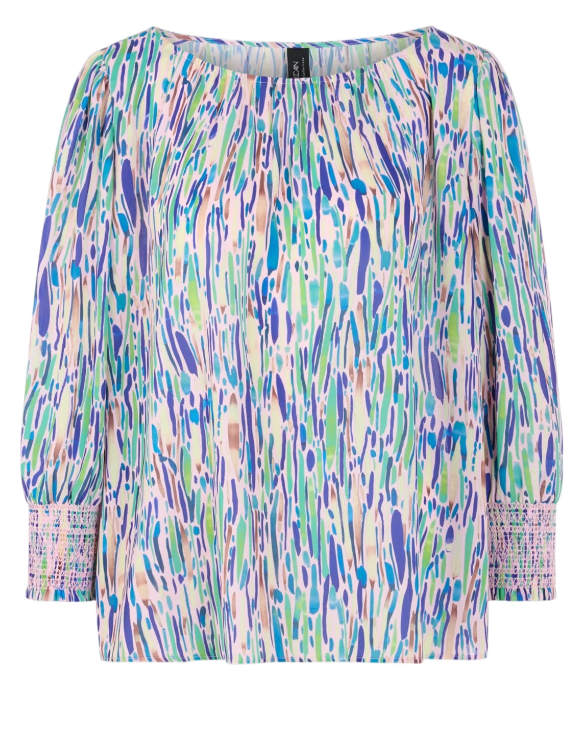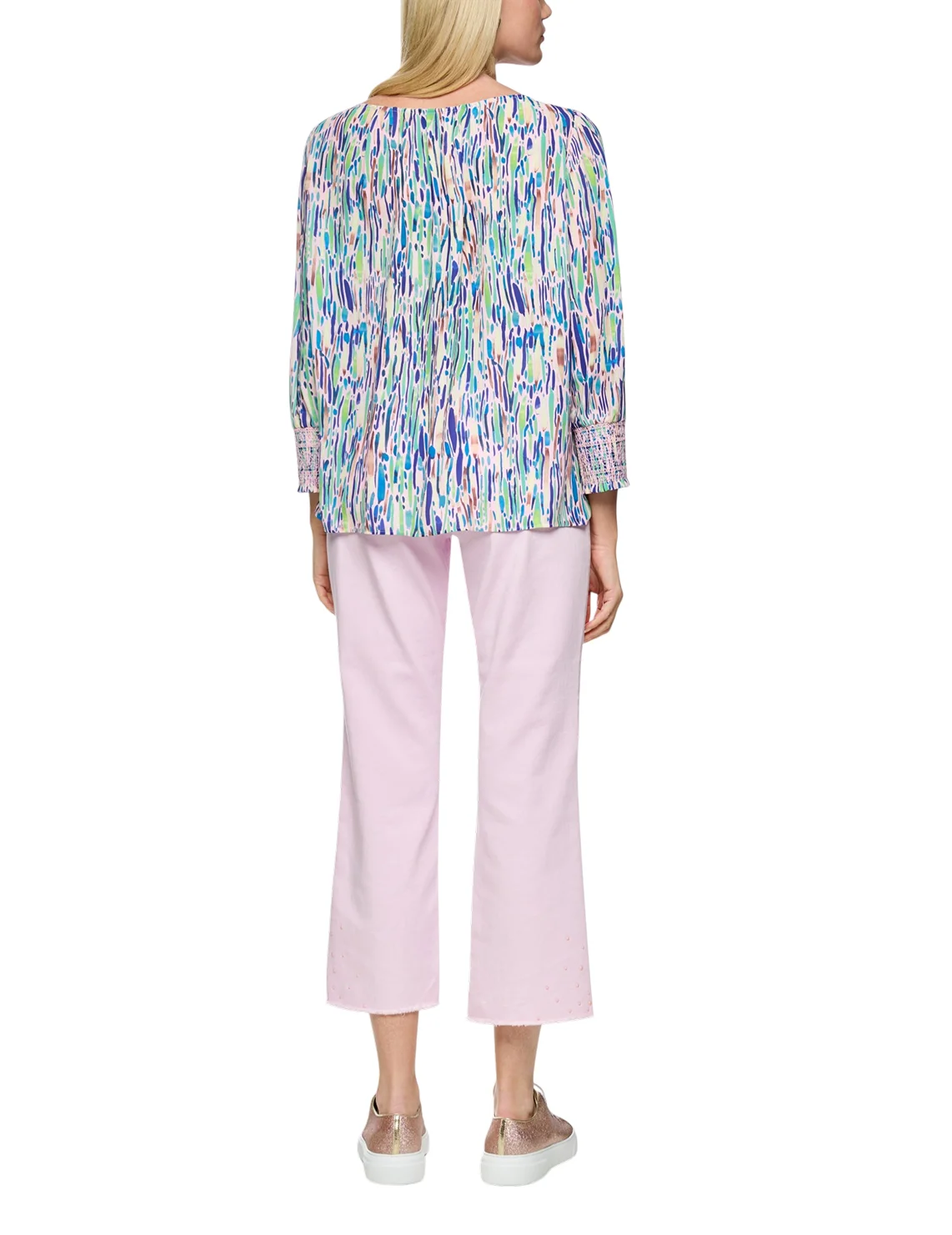 Блуза изготовлена из полиэстера высокого качества. Модель выполнена в свободном крое. Имеет круглый вырез горловины и рукава длиной 3/4 с манжетами. Декорировано абстрактным принтом.