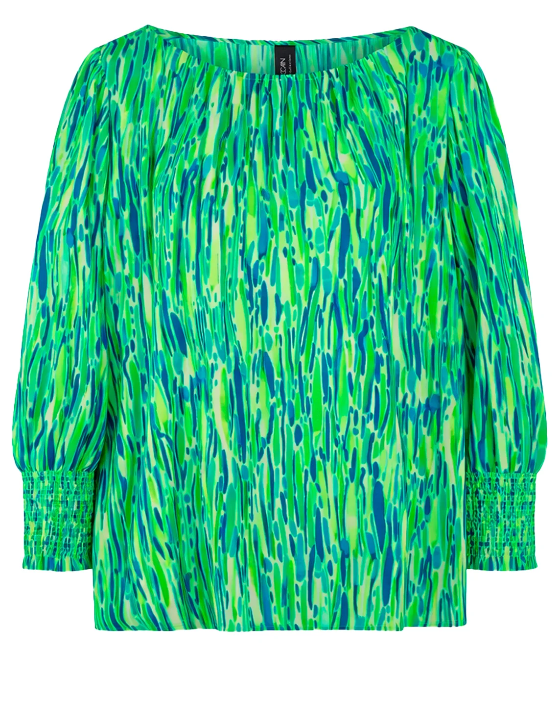 Блуза изготовлена из полиэстера высокого качества. Модель выполнена в свободном крое. Имеет круглый вырез горловины и рукава длиной 3/4 с манжетами. Декорировано абстрактным принтом.
