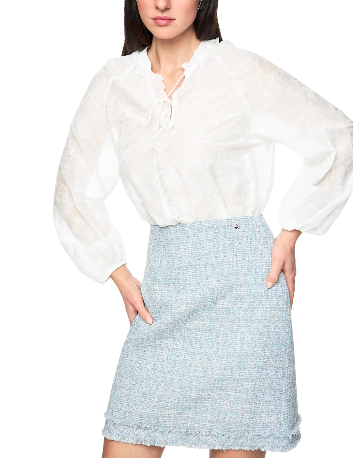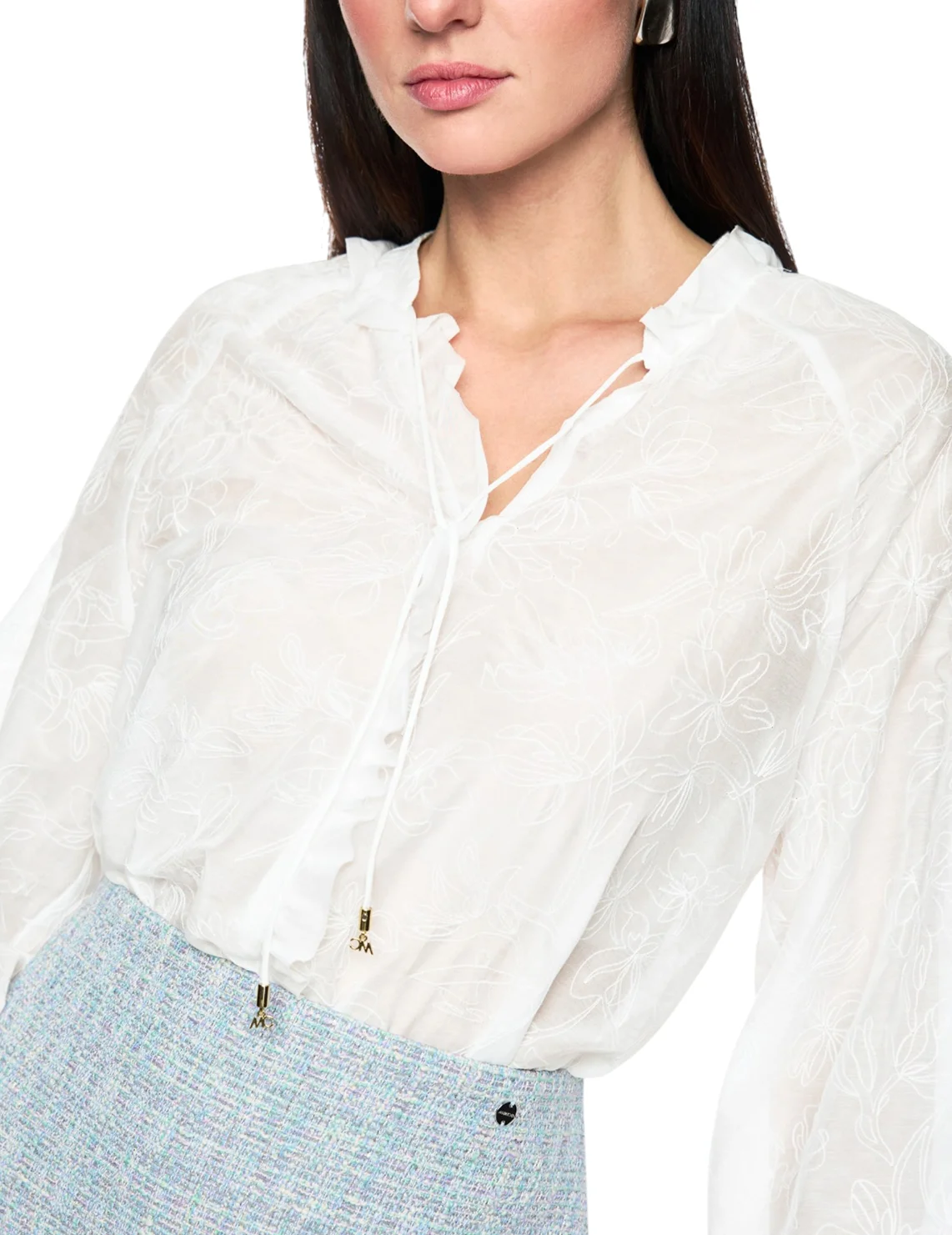 Блуза изготовлена из хлопка и шелка. Модель выполнена в свободном крое. Имеет длинные рукава с манжетами, воротник-стойку с оборками и завязками. Декорирована цветочной вышивкой.