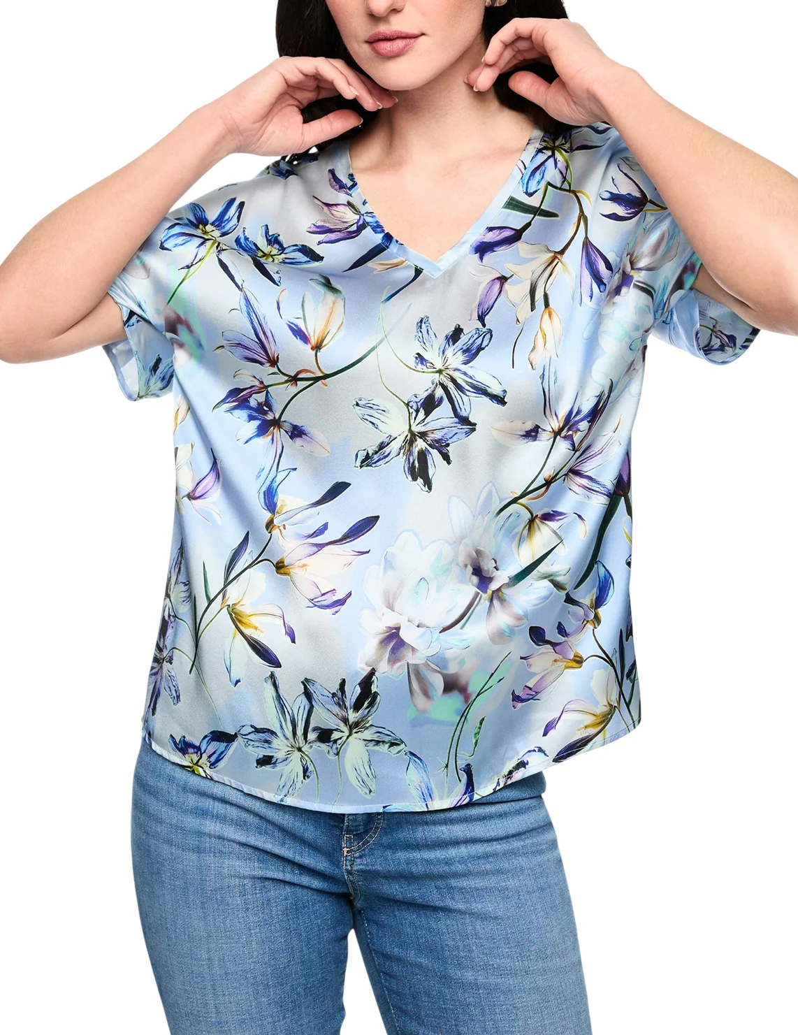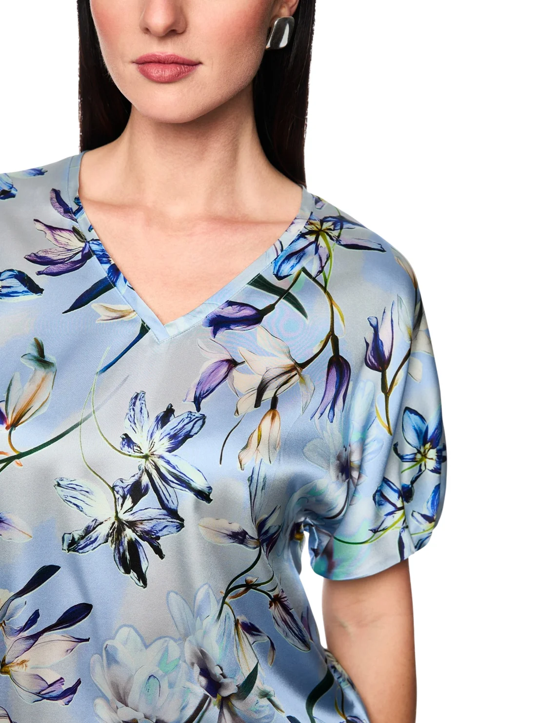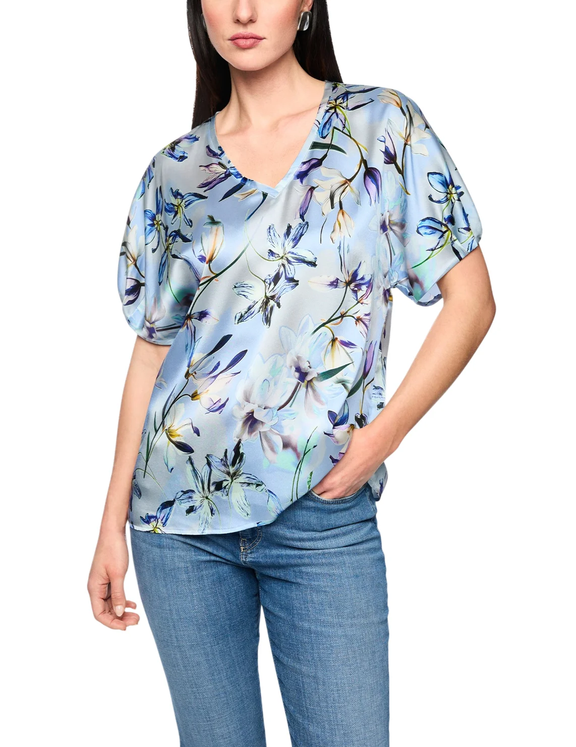 Блуза изготовлена из шелка и эластана. Модель выполнена в свободном крое. Имеет V-образный вырез горловины и короткие рукава с манжетами. Декорирована цветочным принтом.