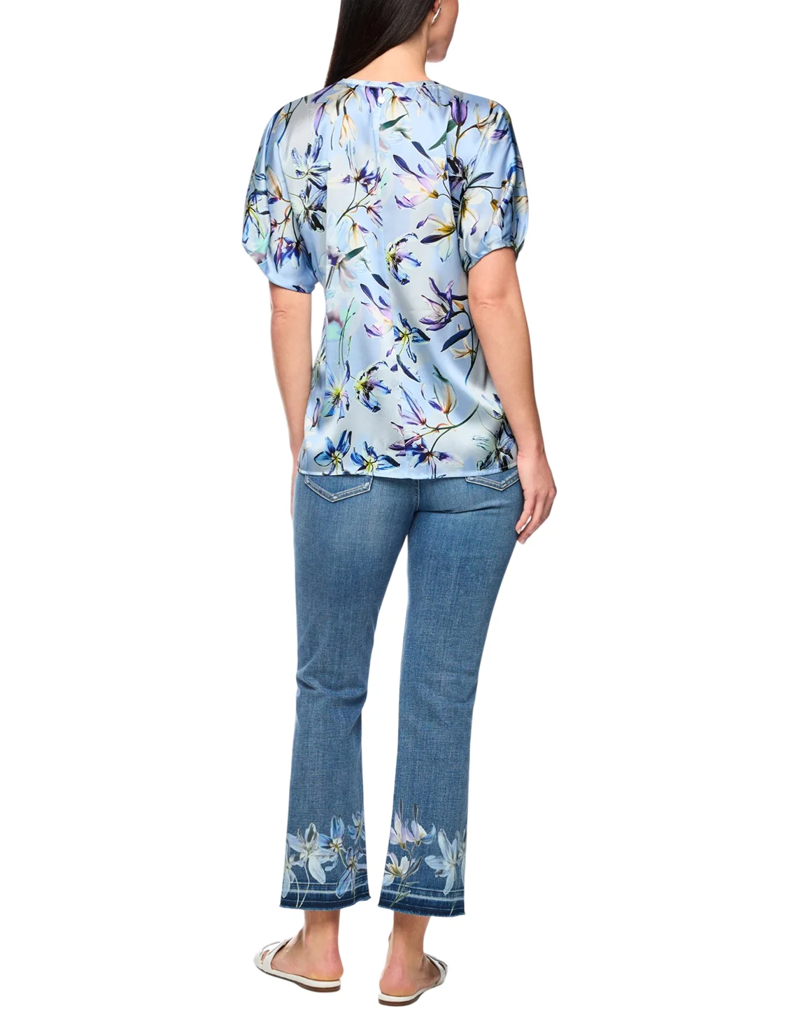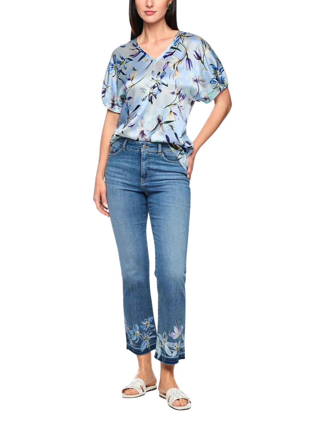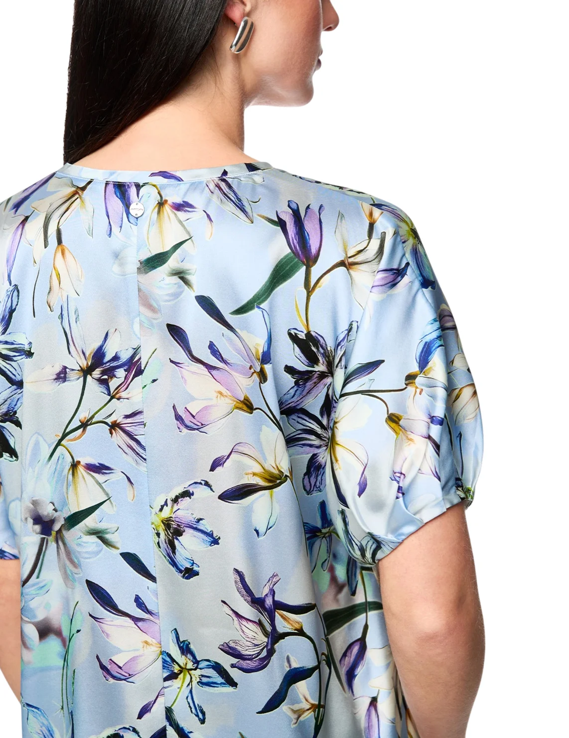 Блуза изготовлена из шелка и эластана. Модель выполнена в свободном крое. Имеет V-образный вырез горловины и короткие рукава с манжетами. Декорирована цветочным принтом.
