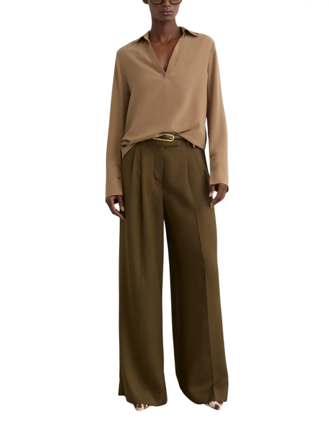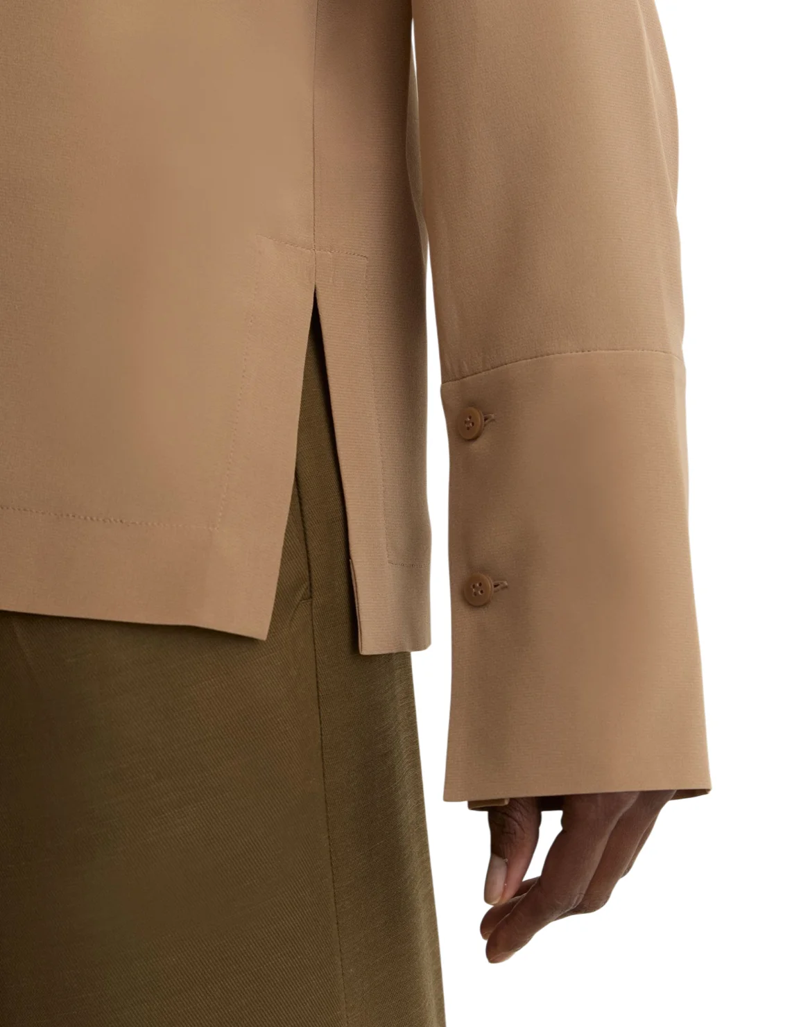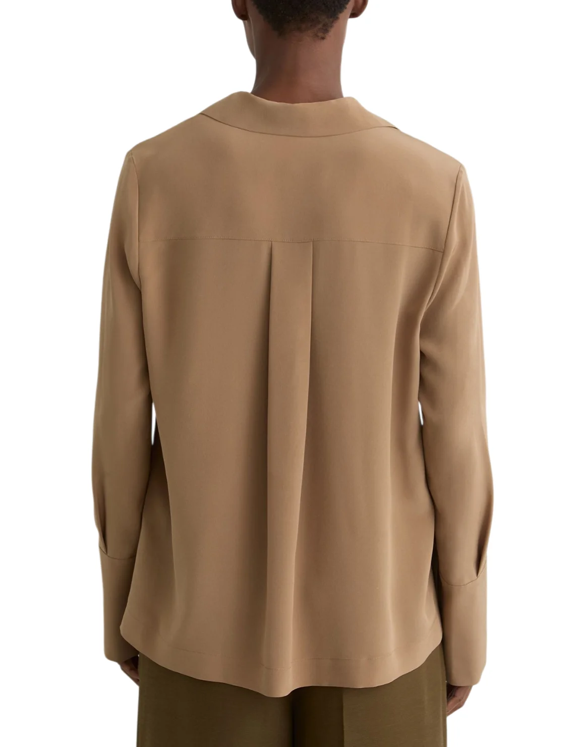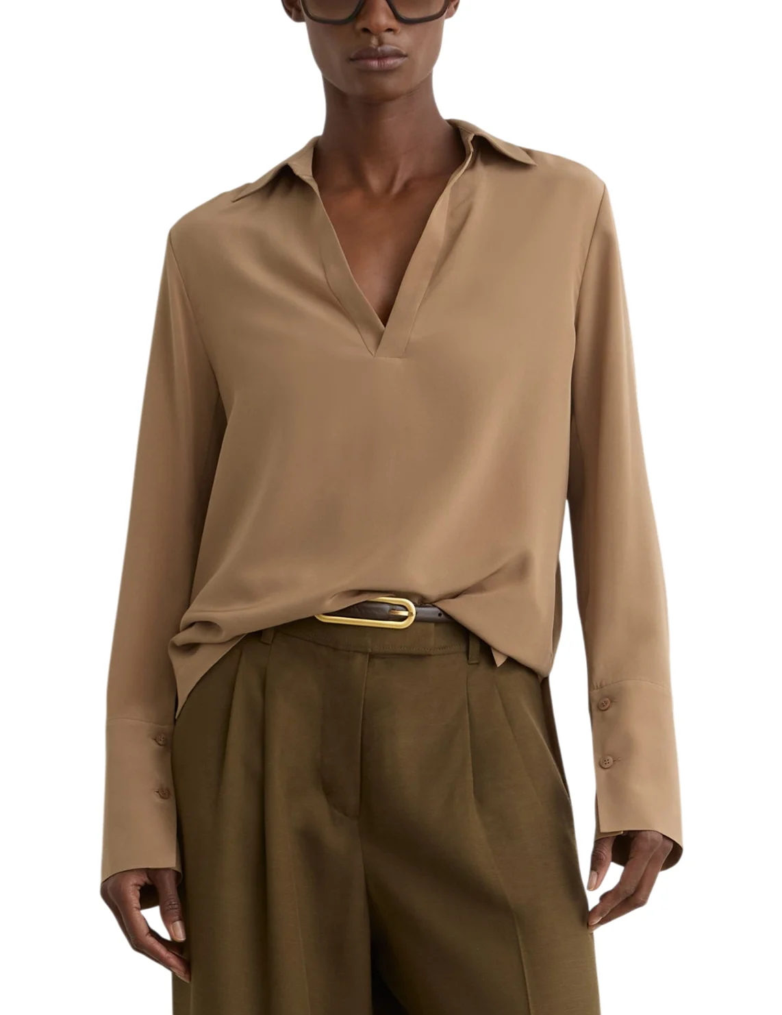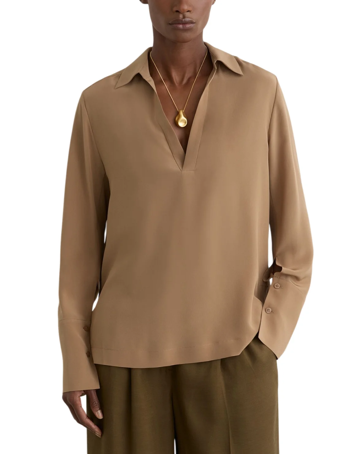 Блуза изготовлена из 100% шелка высокого качества. Модель выполнена в прямом крое. Имеет отложной воротник, V-образный вырез горловины, боковые разрезы, длинные рукава с манжетами и складки сзади.