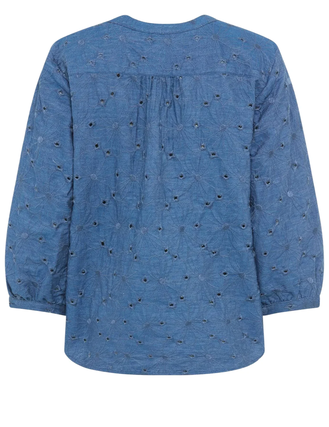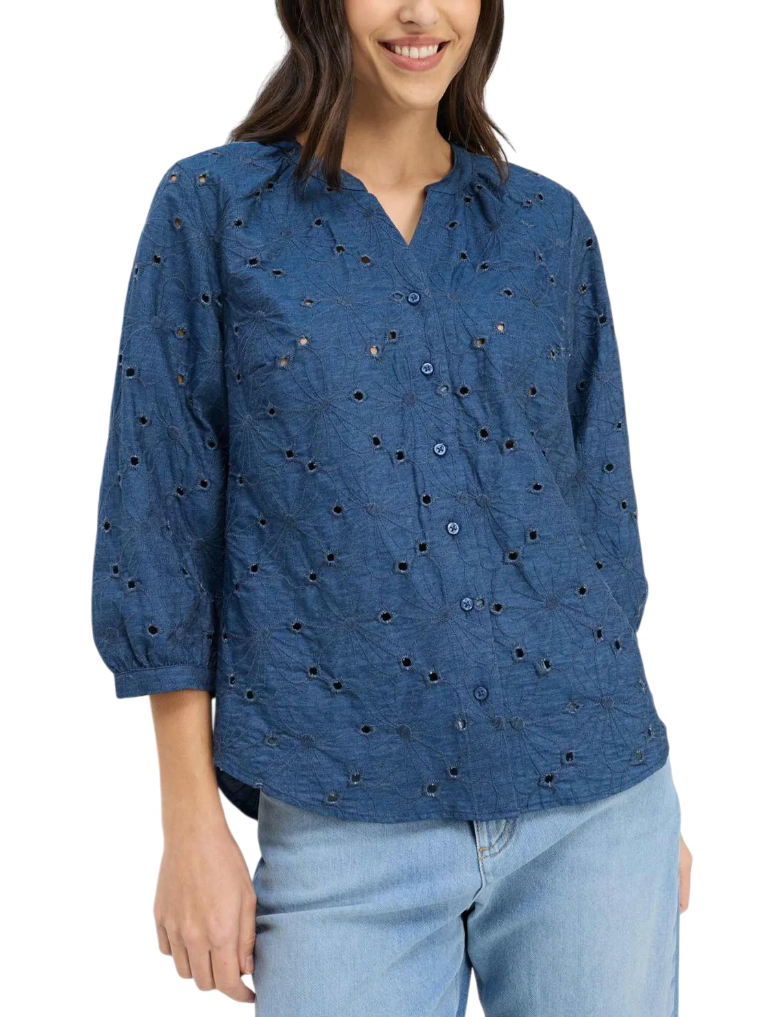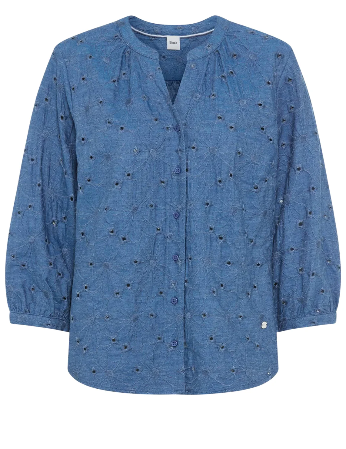 Блуза изготовлена из 100% хлопка. Модель выполнена в широком крое. Имеет круглый вырез горловины, широкие рукава 3/4 длиной с манжетами. Застёгивается на планку с пуговицами. Декорированная перфорацией.
