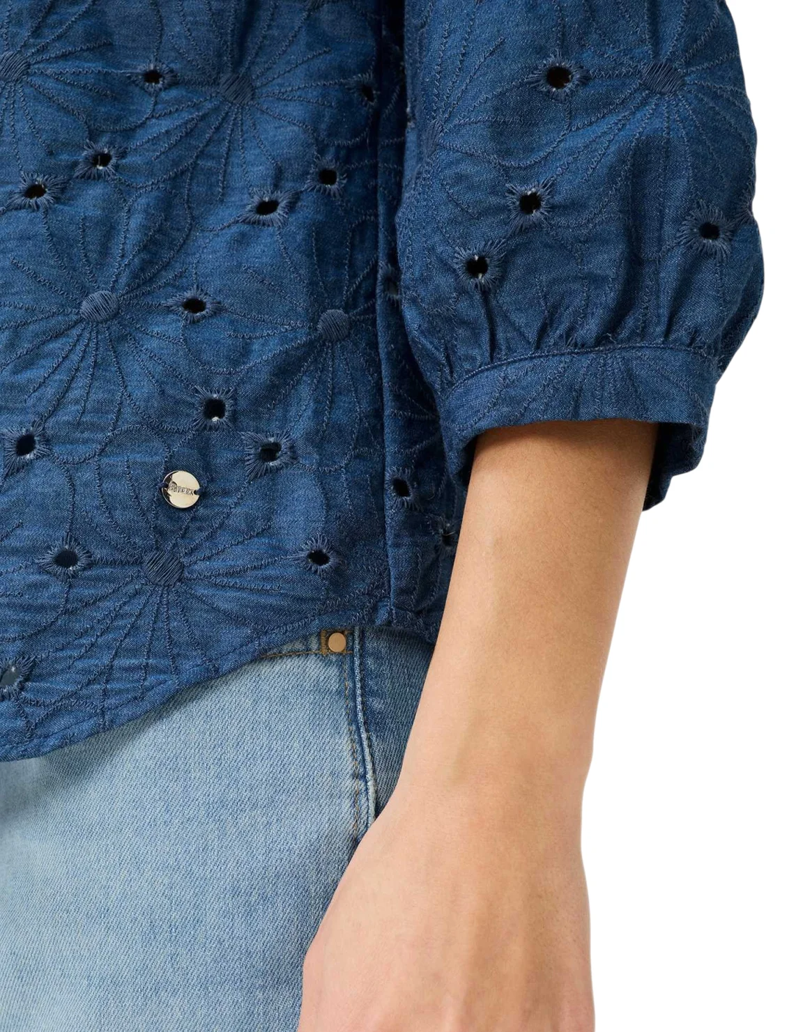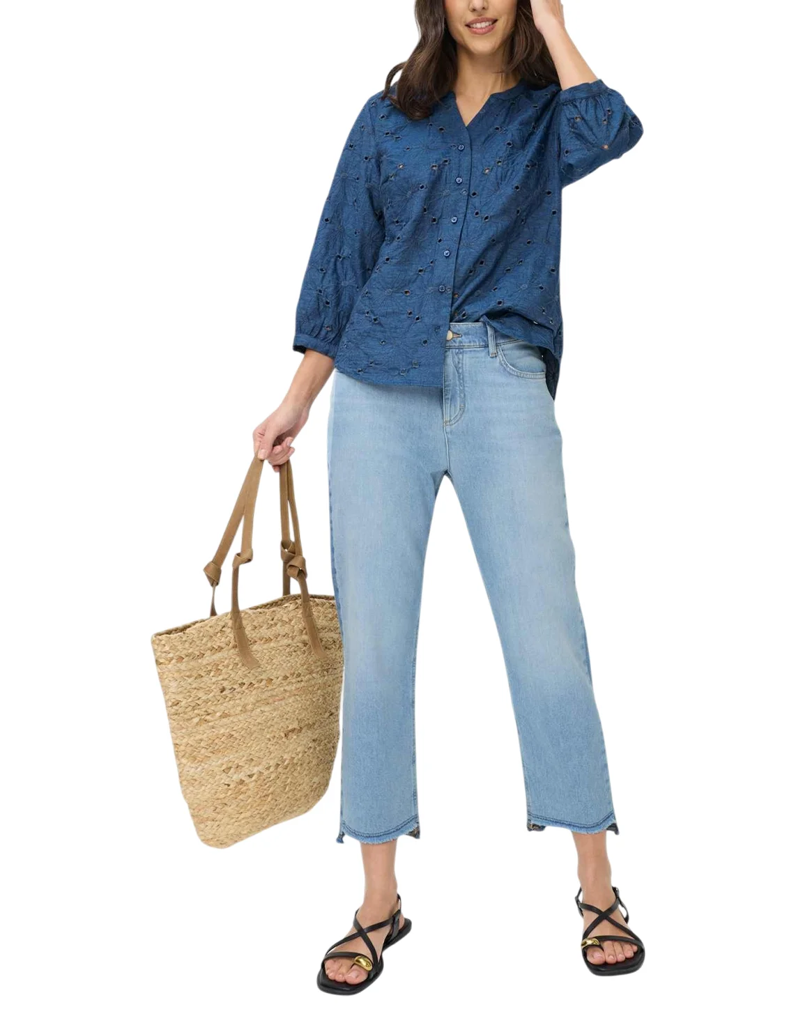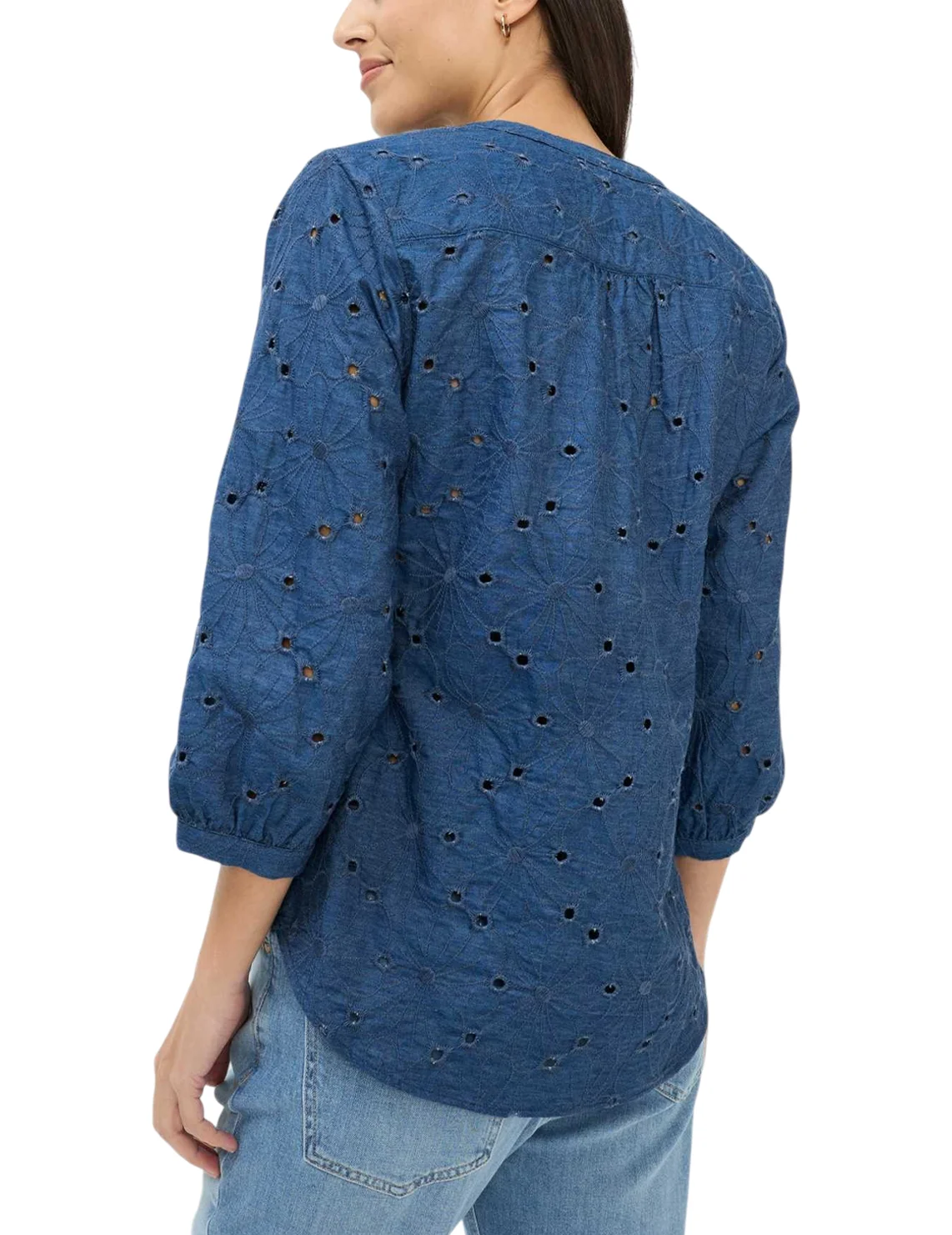 Блуза изготовлена из 100% хлопка. Модель выполнена в широком крое. Имеет круглый вырез горловины, широкие рукава 3/4 длиной с манжетами. Застёгивается на планку с пуговицами. Декорированная перфорацией.