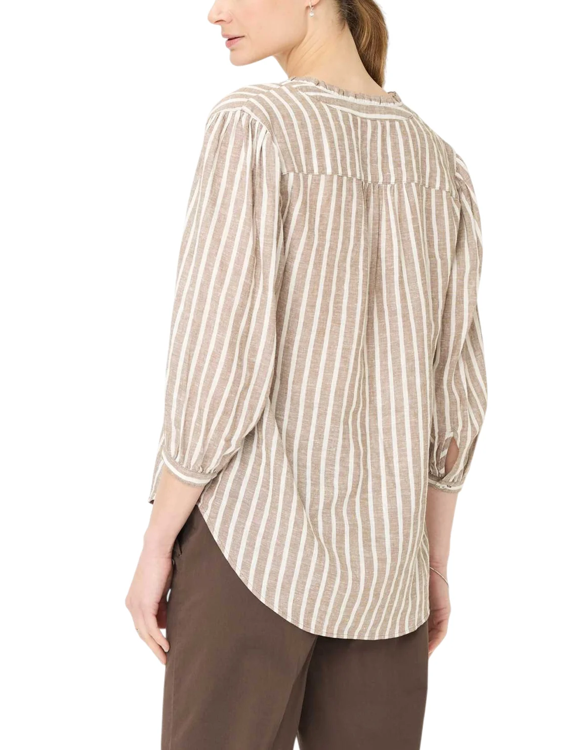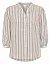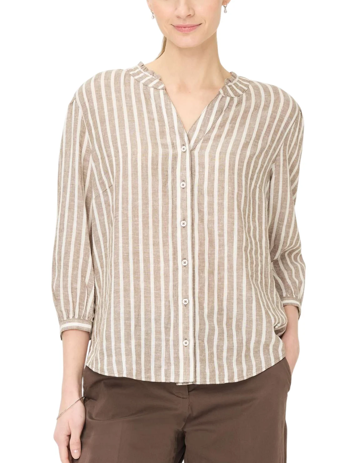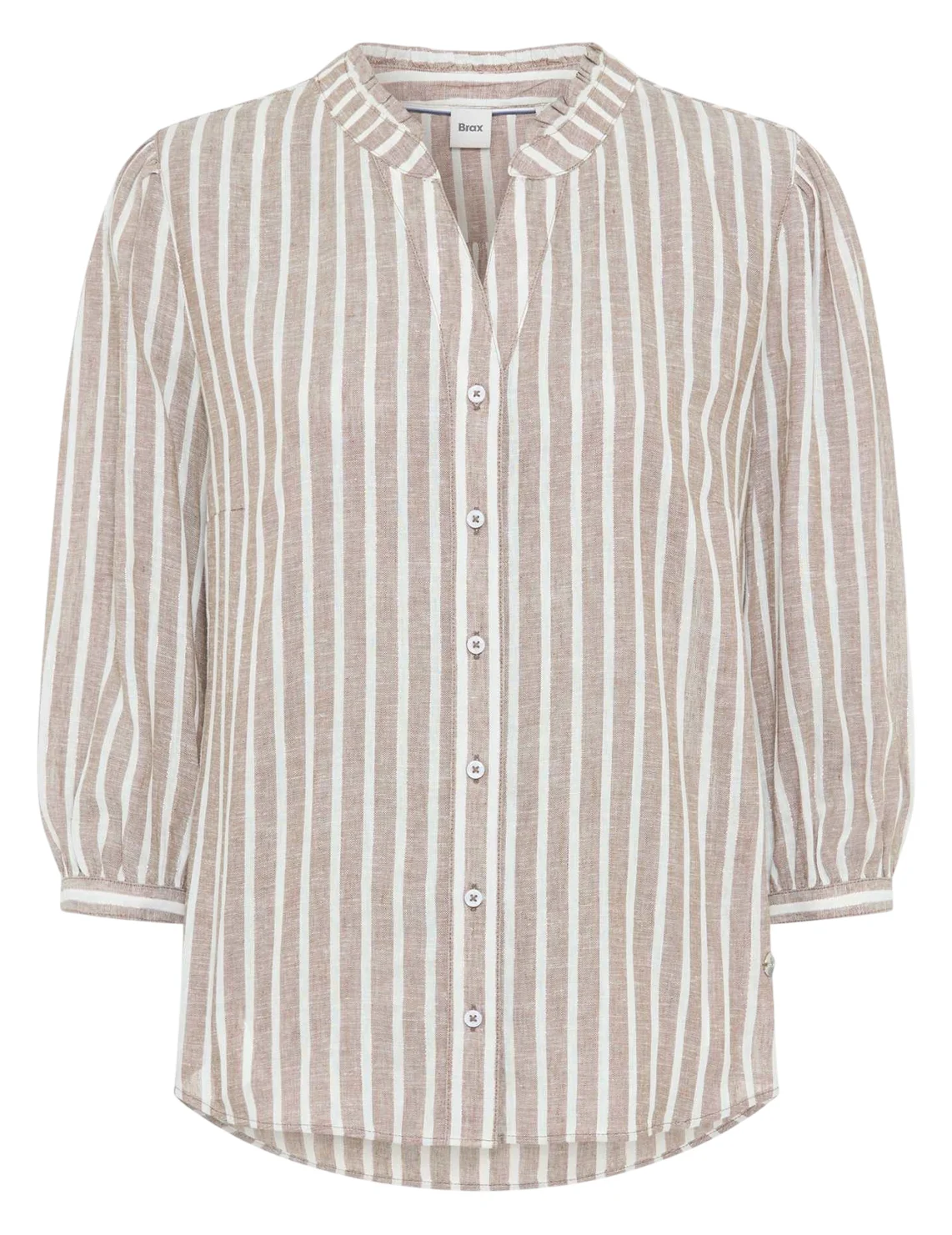 Блуза изготовлена из льна, вискозы, а также с использованием металлизированной нити. Модель выполнена в свободном крое. Имеет круглый вырез горловины, рукава длиной 3/4 с разрезами и пуговицами. Декорирован плиссировкой на воротнике и принтом в вертикальную полоску.Застёгивается на планку с пуговицами.