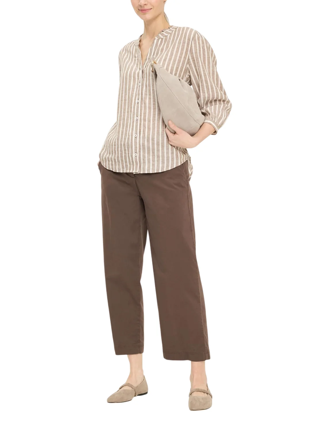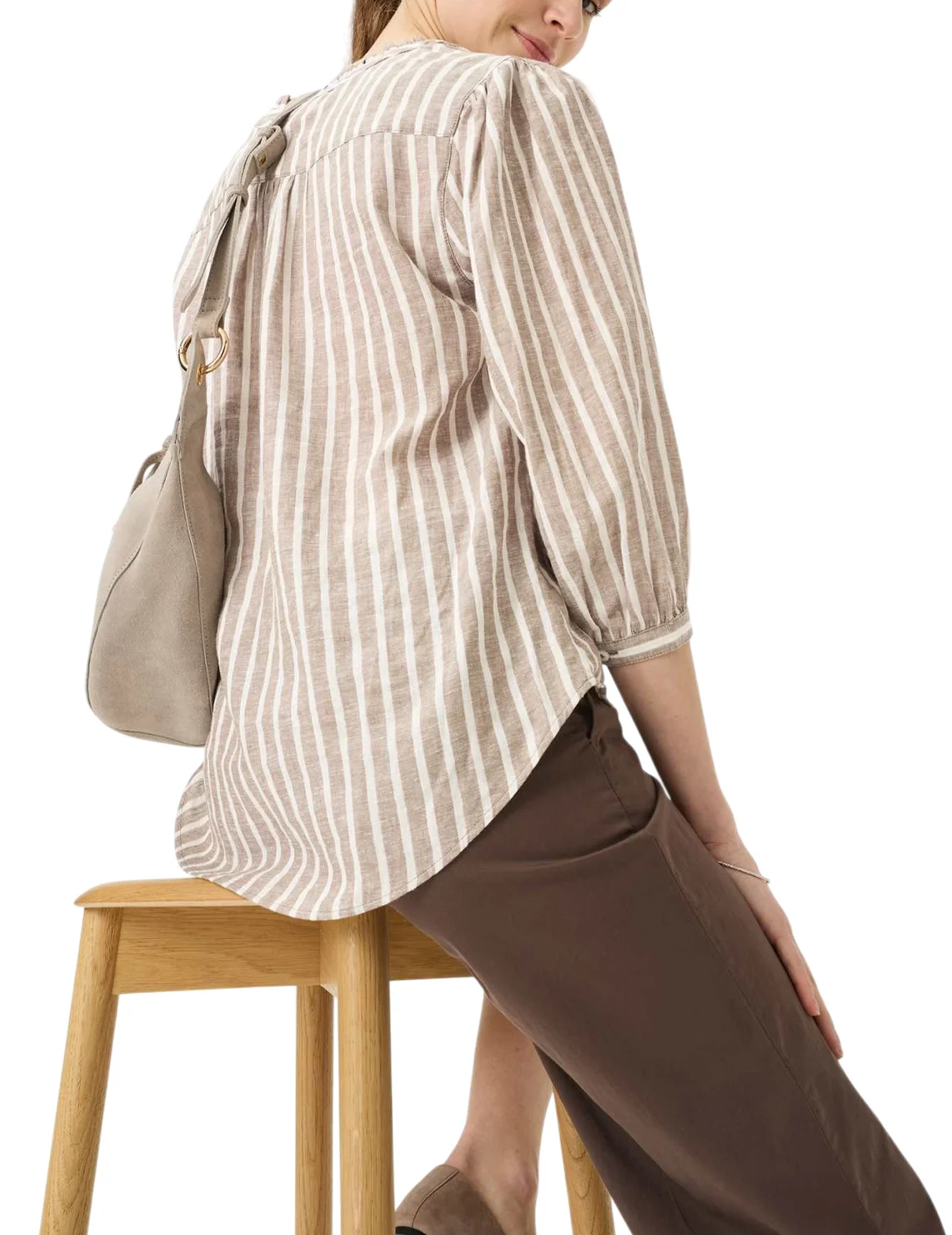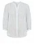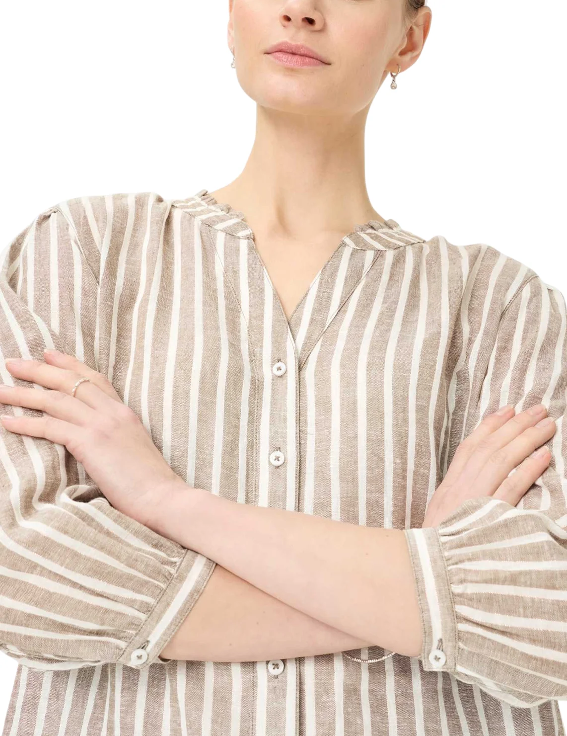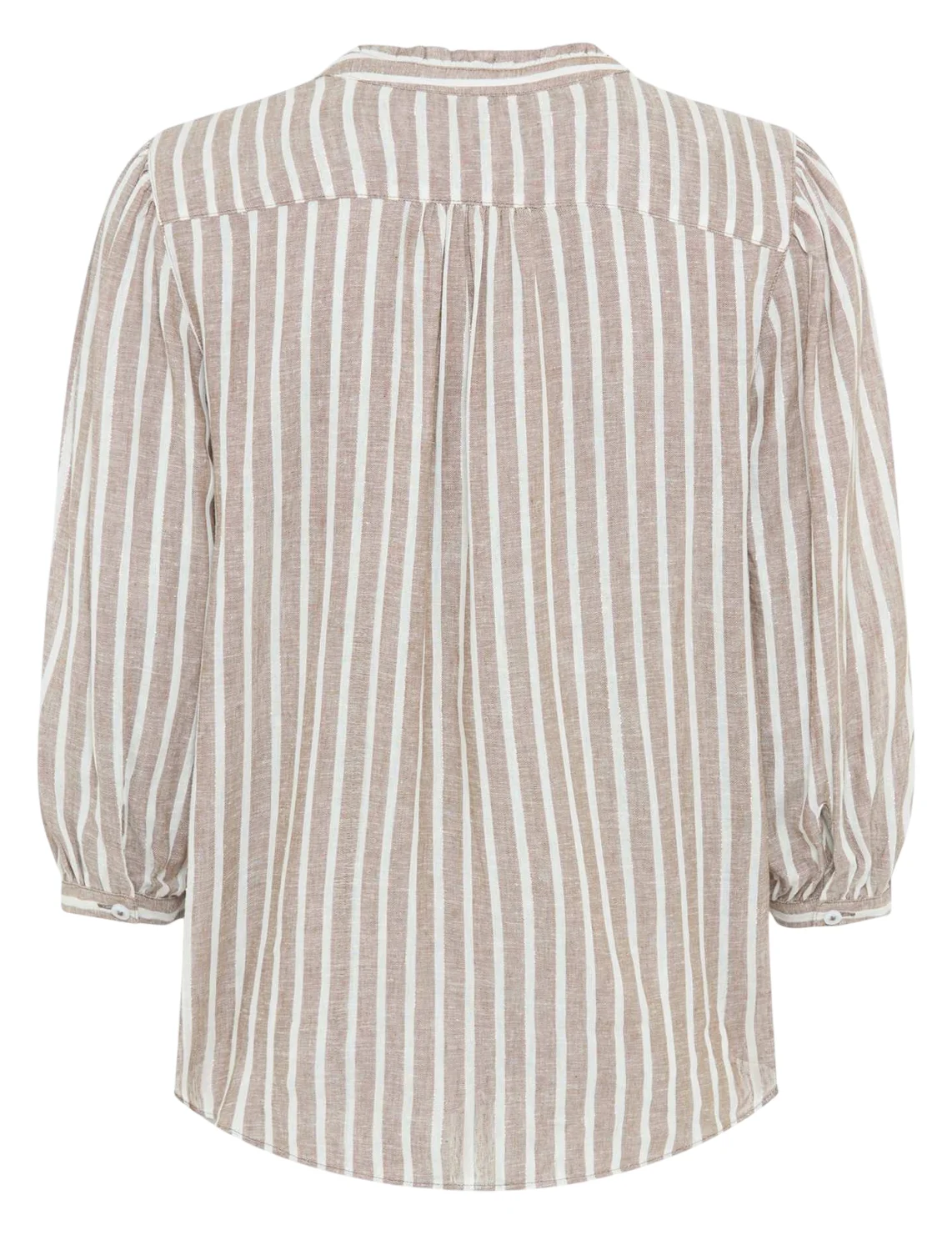 Блуза изготовлена из льна, вискозы, а также с использованием металлизированной нити. Модель выполнена в свободном крое. Имеет круглый вырез горловины, рукава длиной 3/4 с разрезами и пуговицами. Декорирован плиссировкой на воротнике и принтом в вертикальную полоску.Застёгивается на планку с пуговицами.