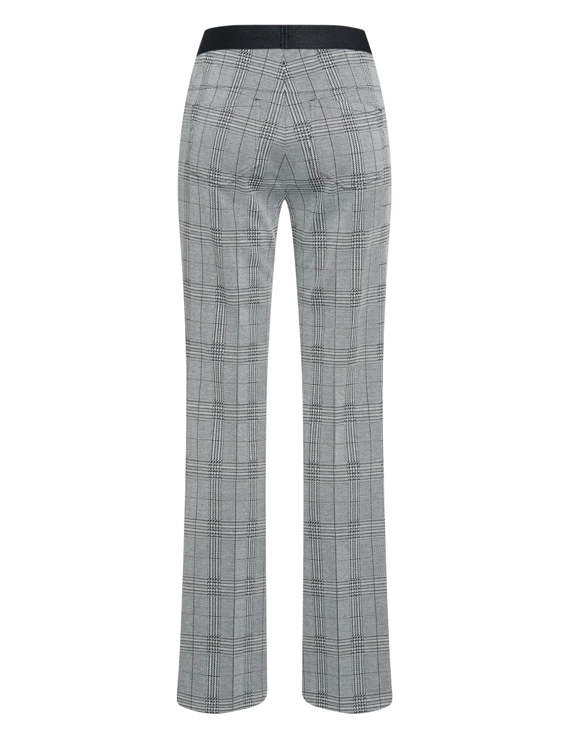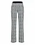 Брюки изготовлены из полиэстера, вискозы, металлизированной нити и эластана. Модель выполнена в расклешенном крое. Имеет эластичный пояс, накладные задние карманы и принт в клетку.
