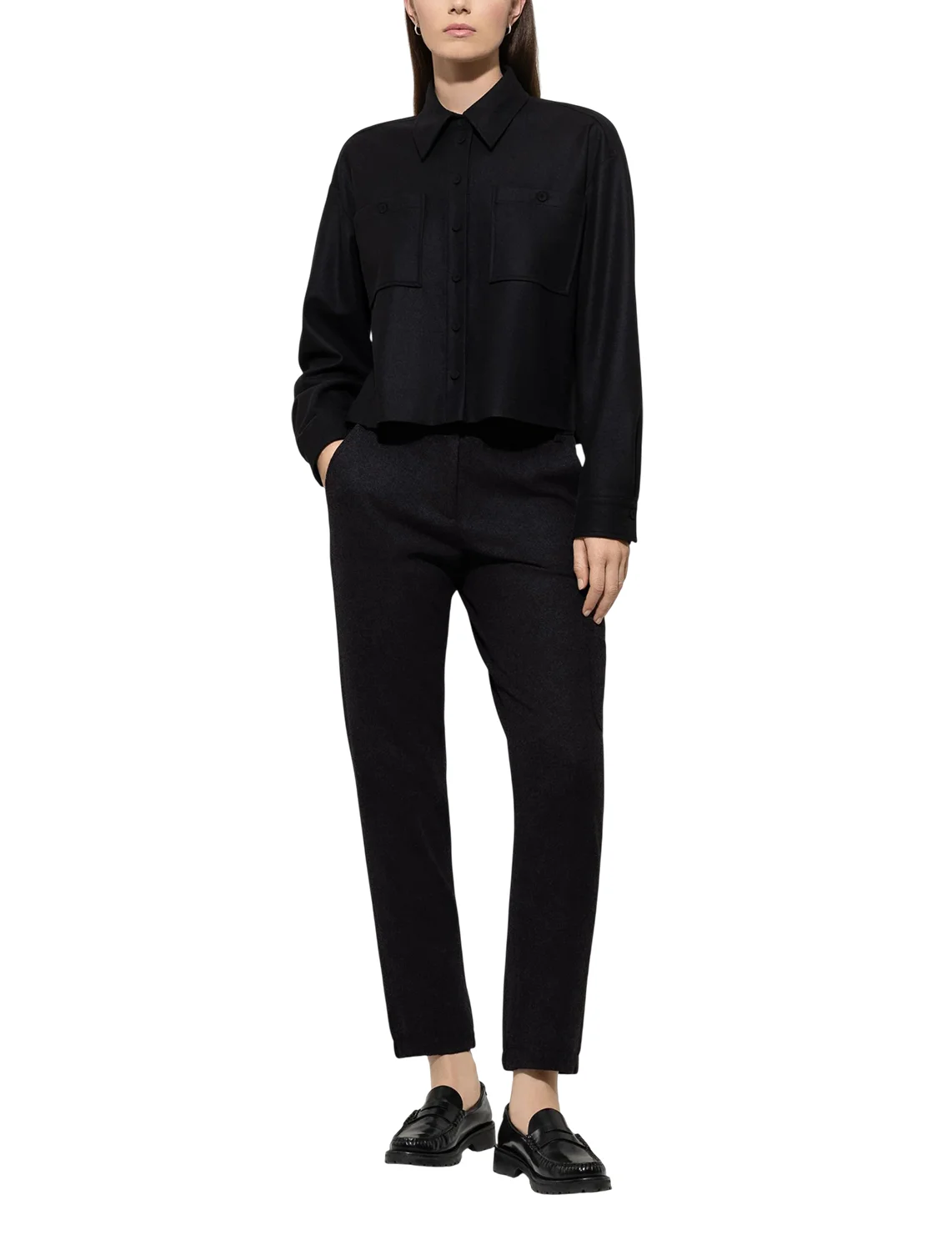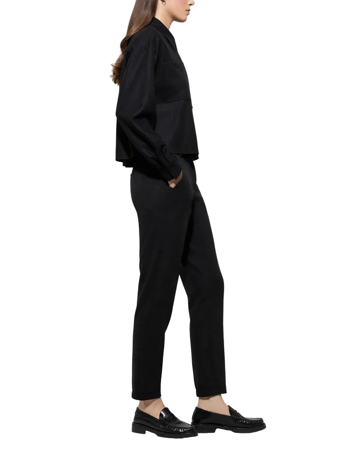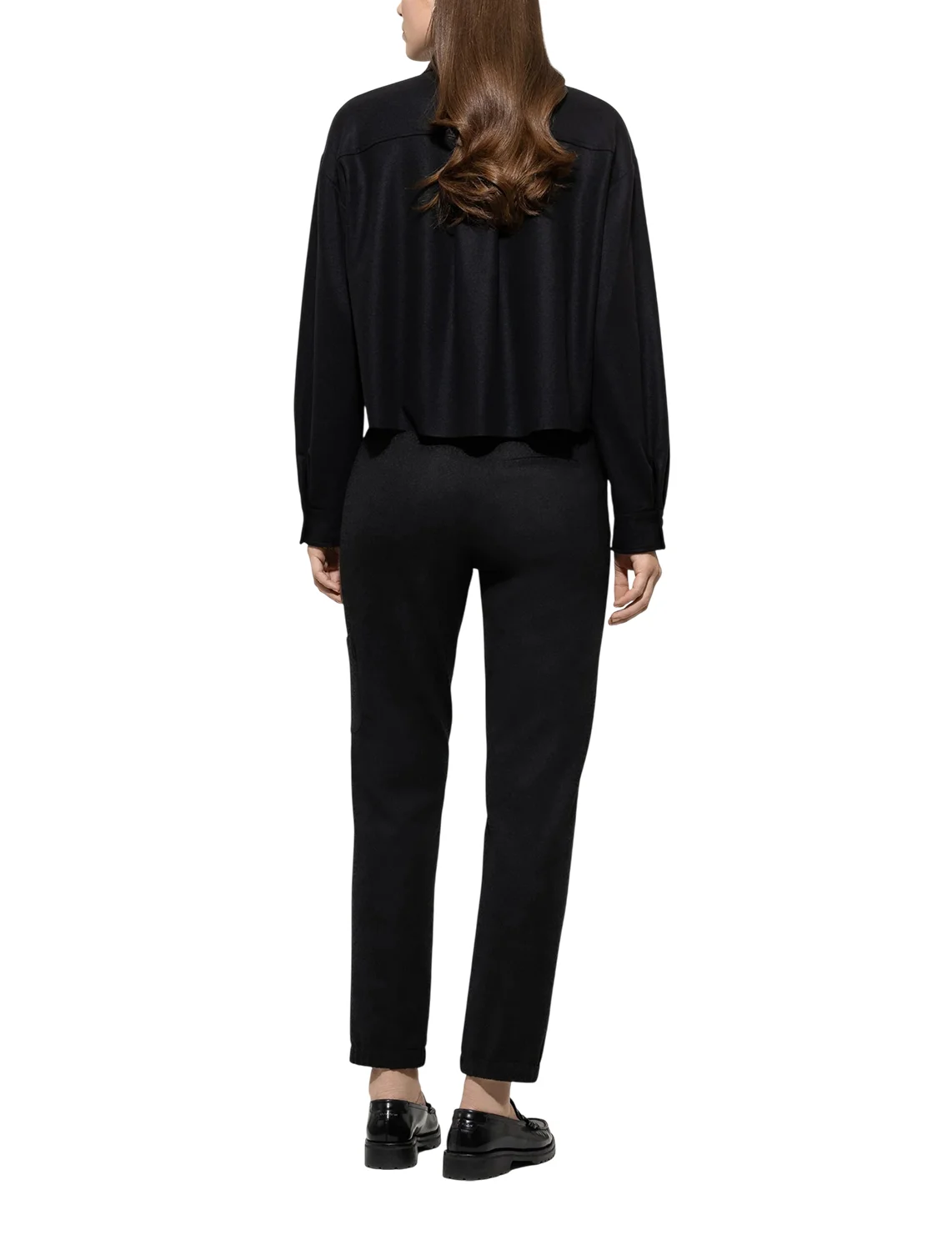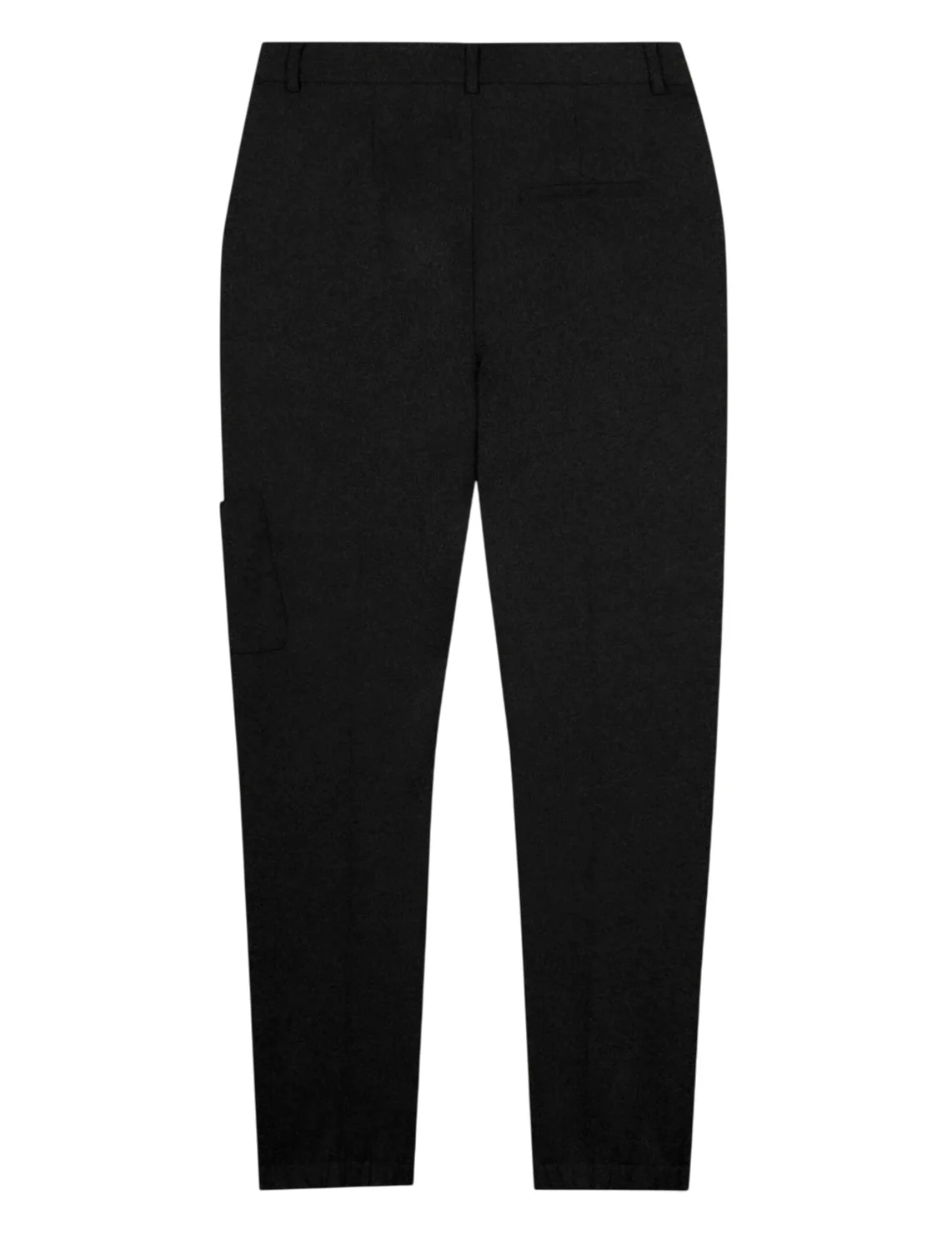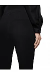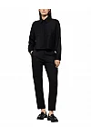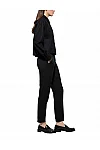 Брюки изготовлены из шерсти, полиамида и эластана. Модель выполнена в зауженном крое. Имеет шлевки для ремня, потайную застежку-молнию с крючком, прессованные стрелки, манжеты по низу штанин, два боковых прорезных кармана, один прорезной задний карман и один боковой накладной карман на штанине.