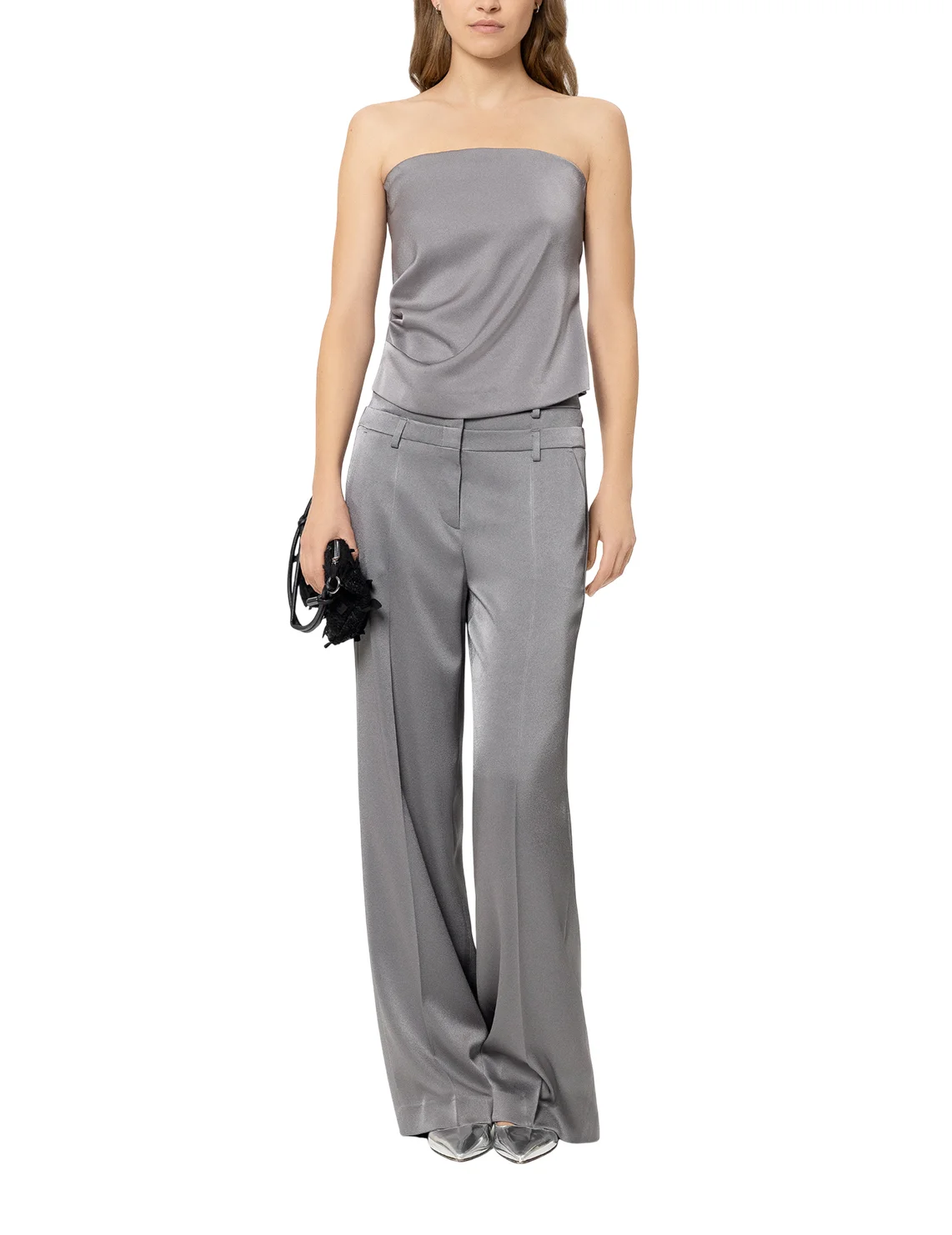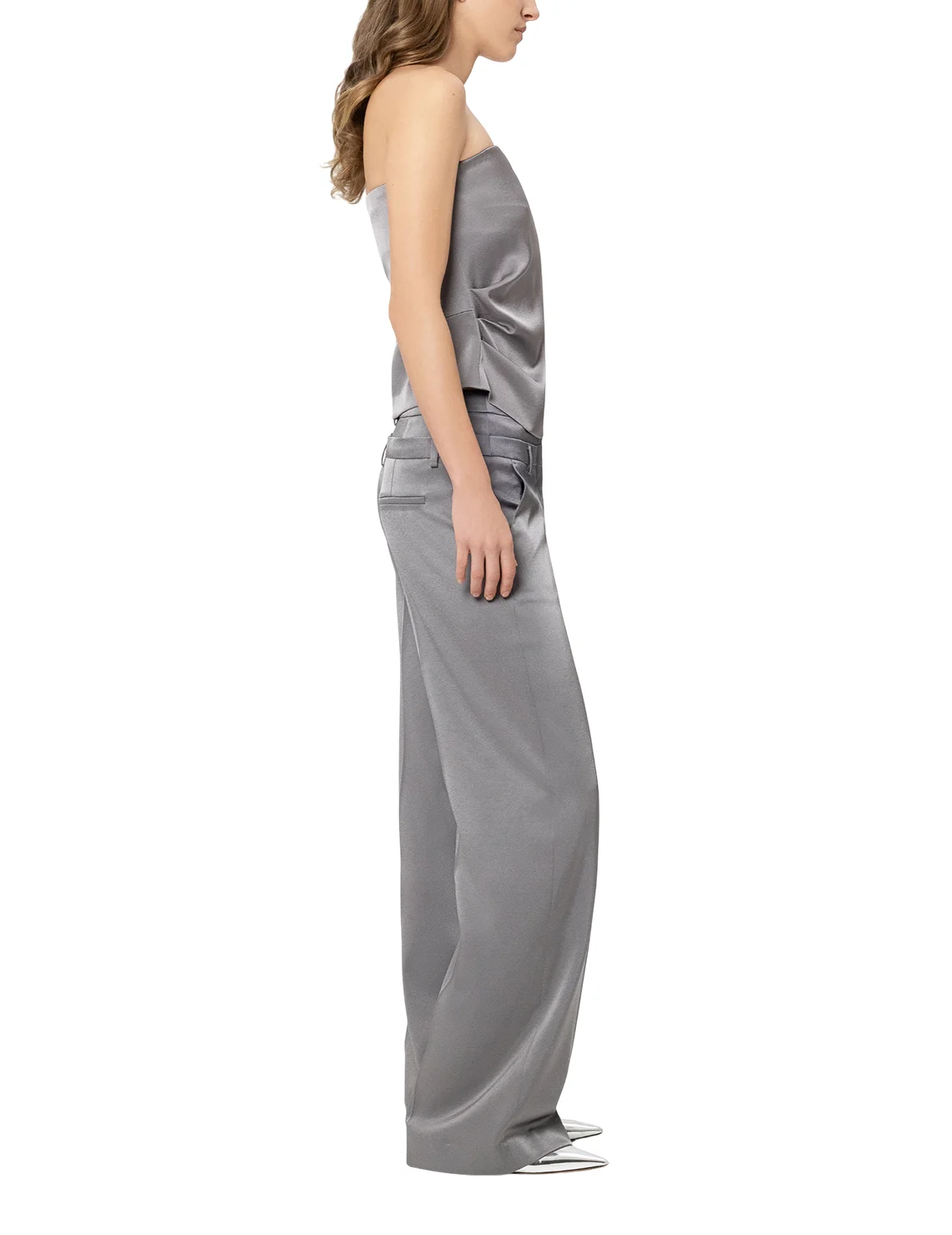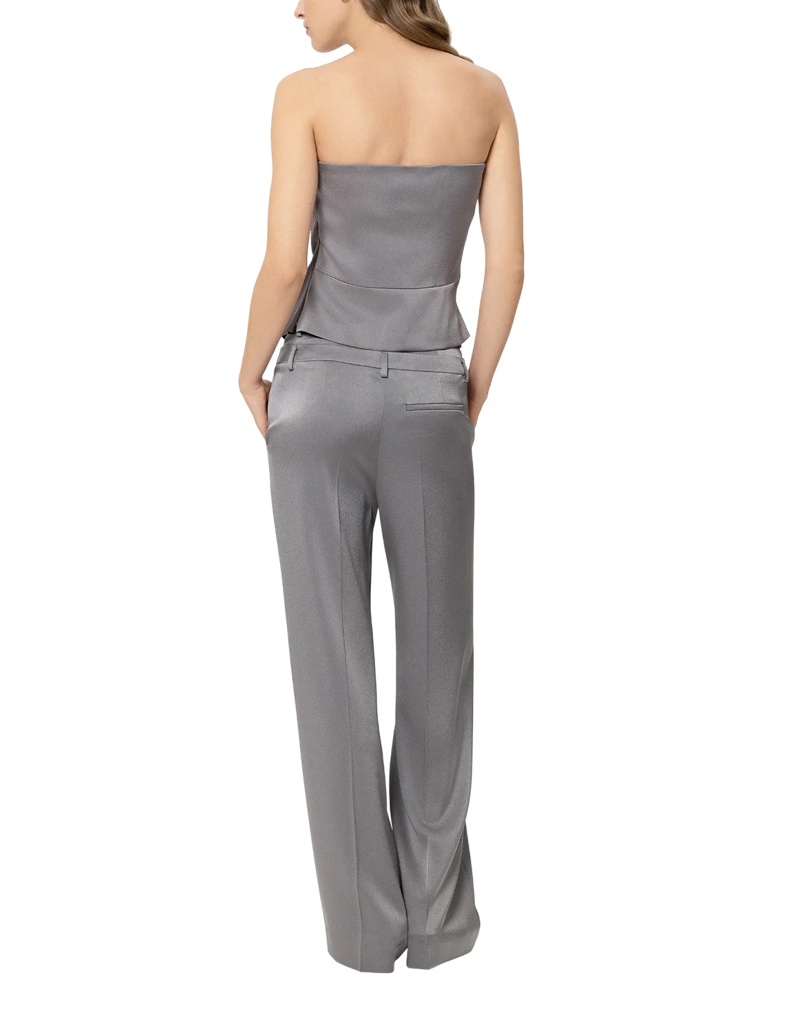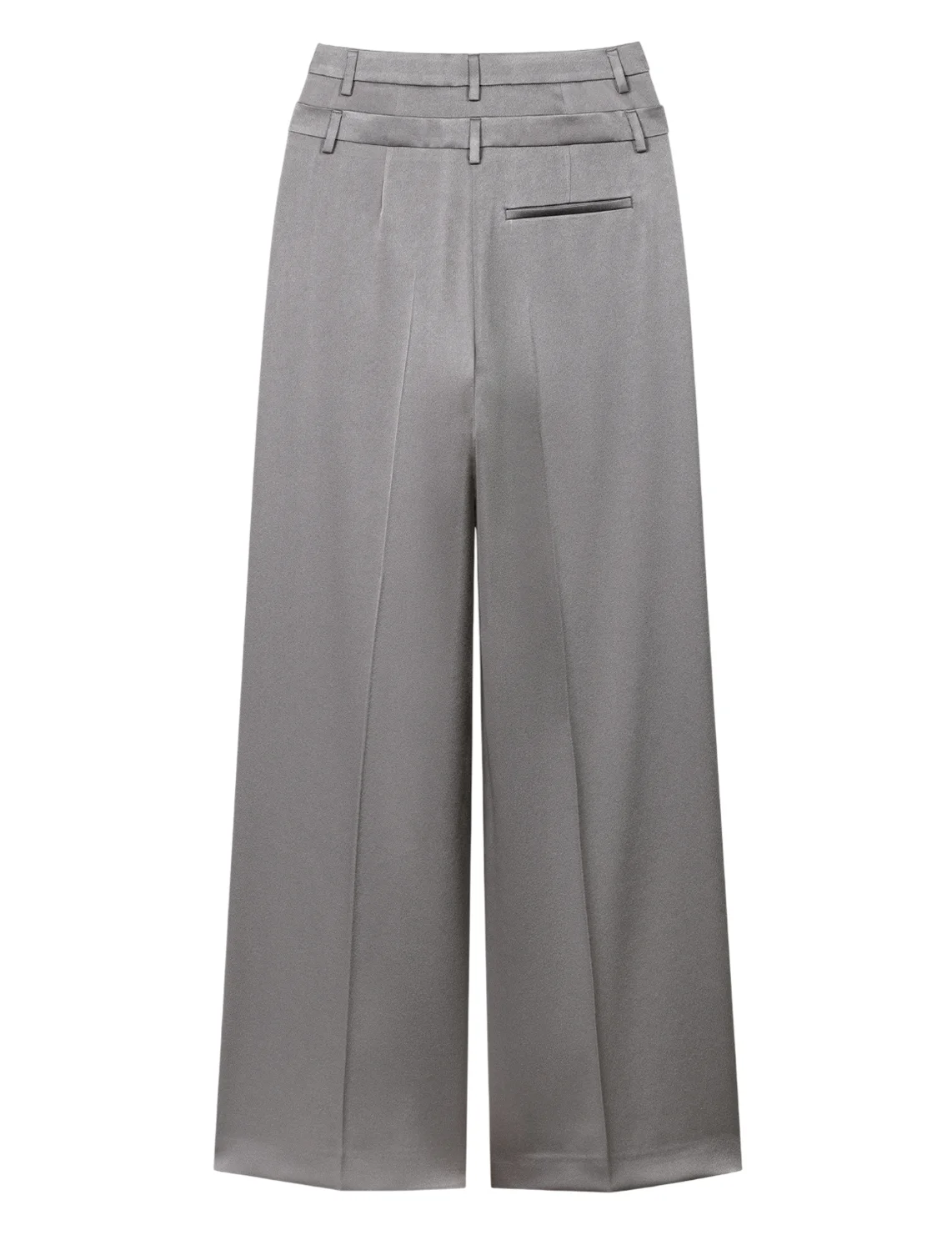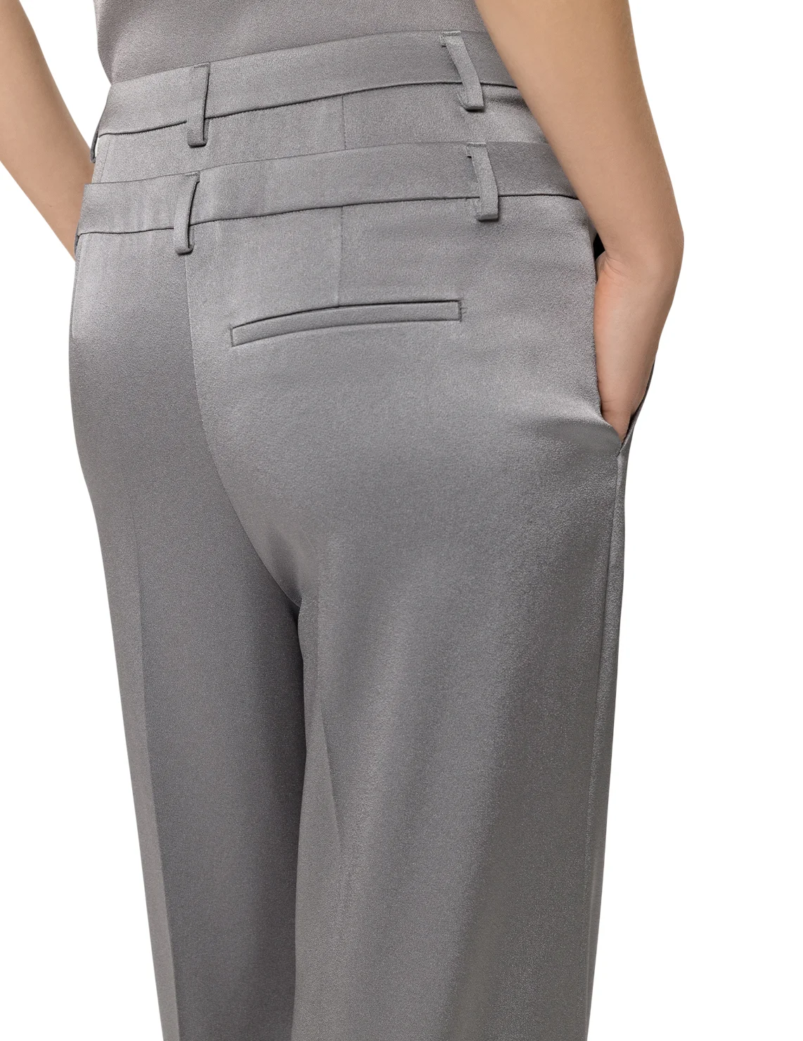 Брюки изготовлены из триацетата и полиэстера. Модель выполнена в свободном крое. Имеет петли для ремня в два ряда, скрытую застежку-молнию с крючком, прессованные стрелки, прорезные боковые и декоративные задние карманы.