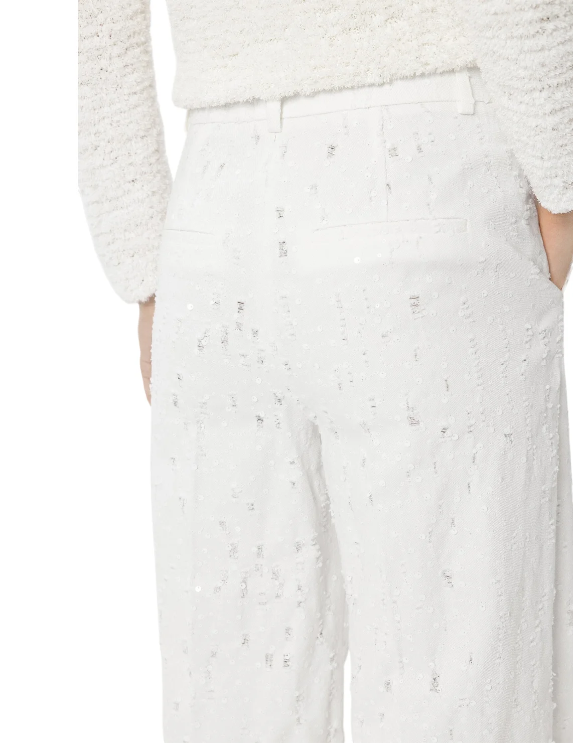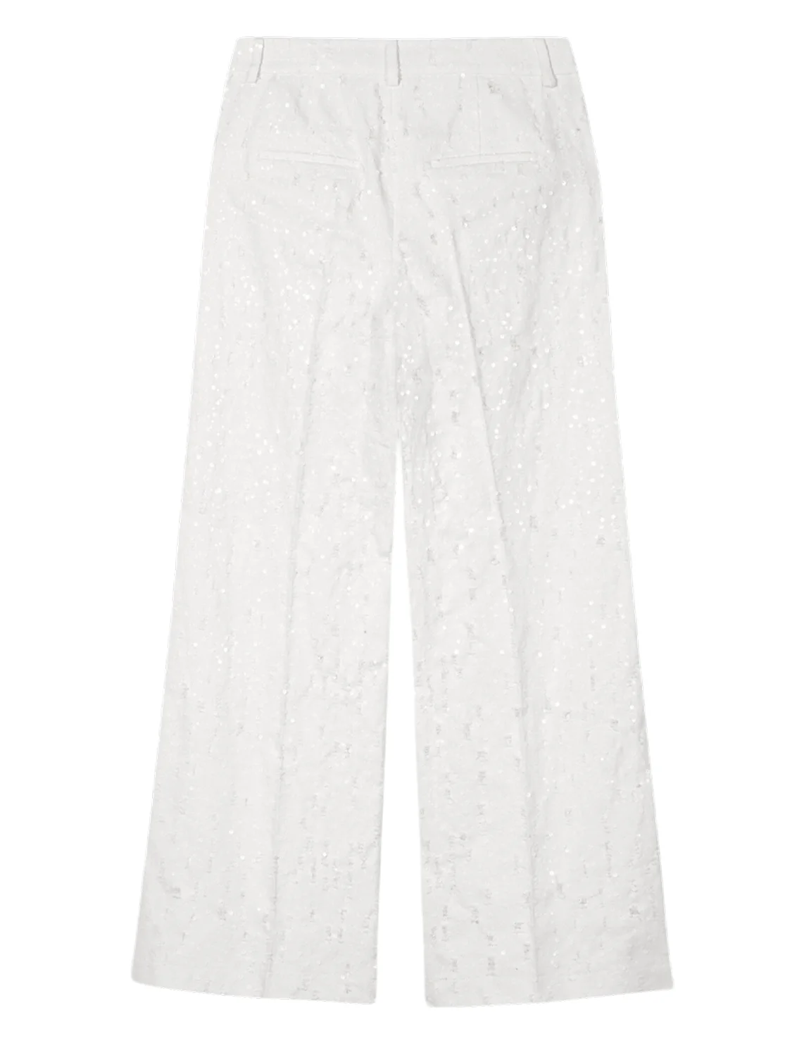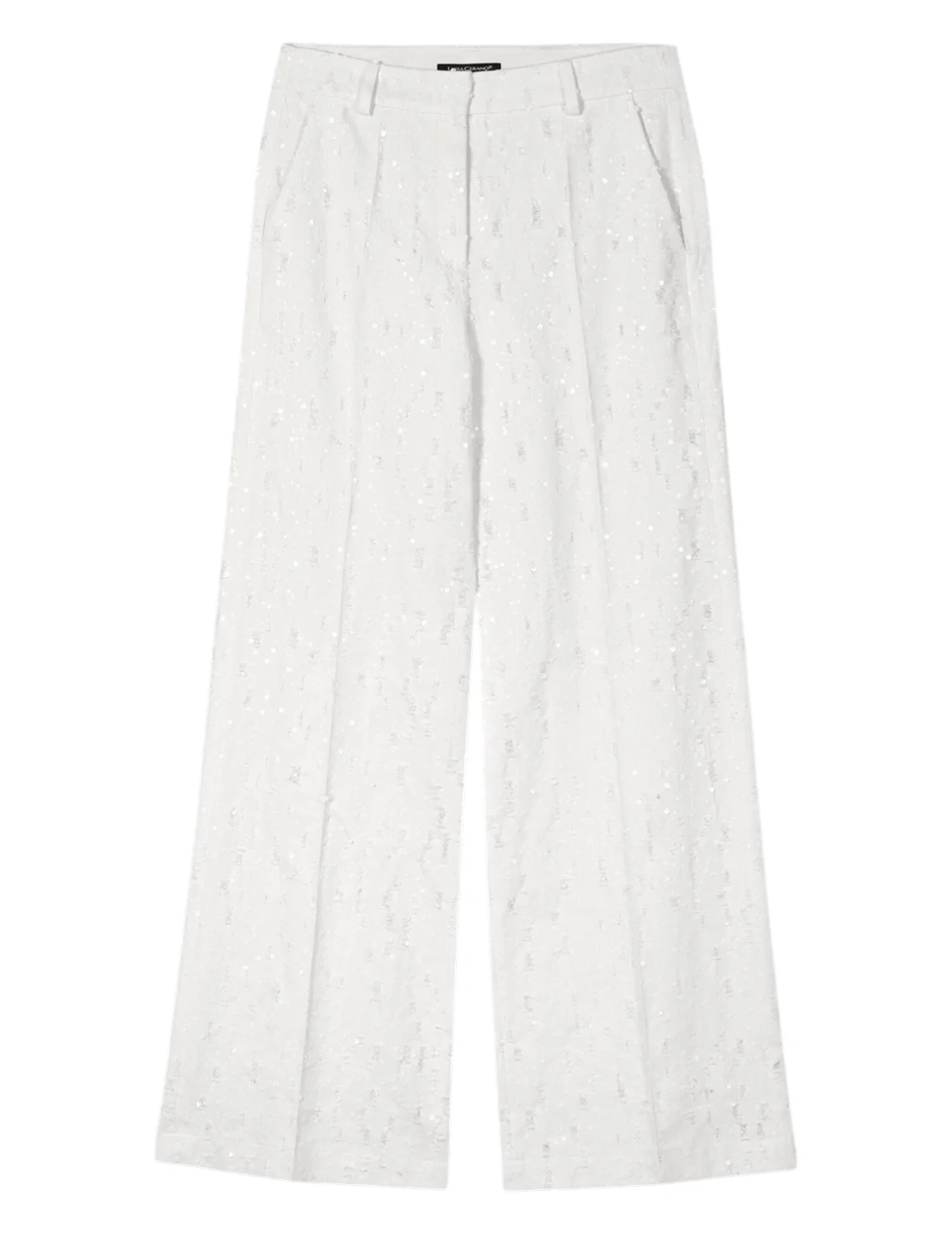 Брюки изготовлены из 100% хлопка. Модель выполнена в широком крое. Имеет шлевки для ремня, прорезные карманы, прессованные стрелки и скрытую застежку на пуговицу, крючок и молнию. Декорированные пайетками в тон.