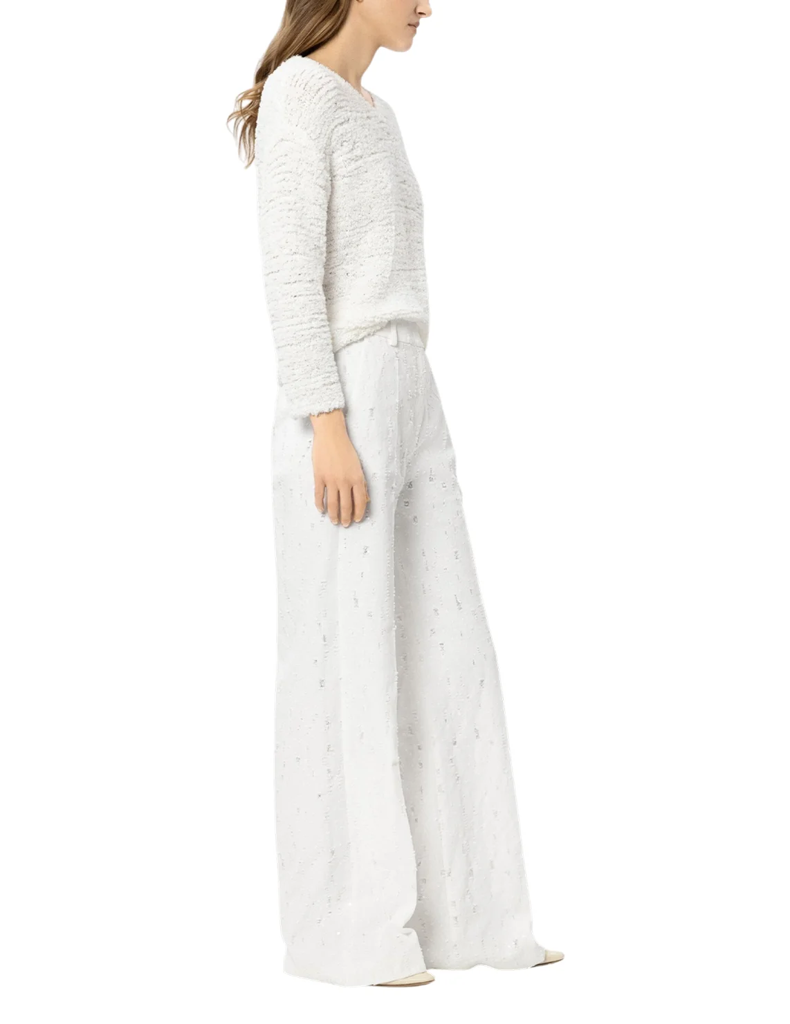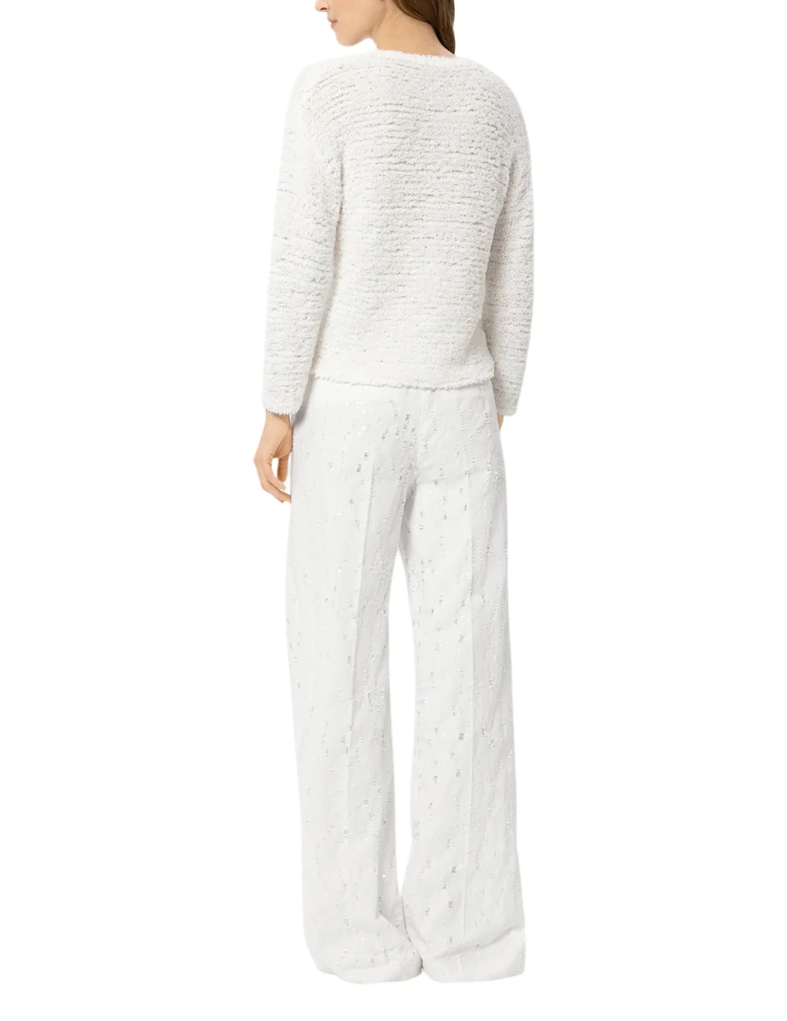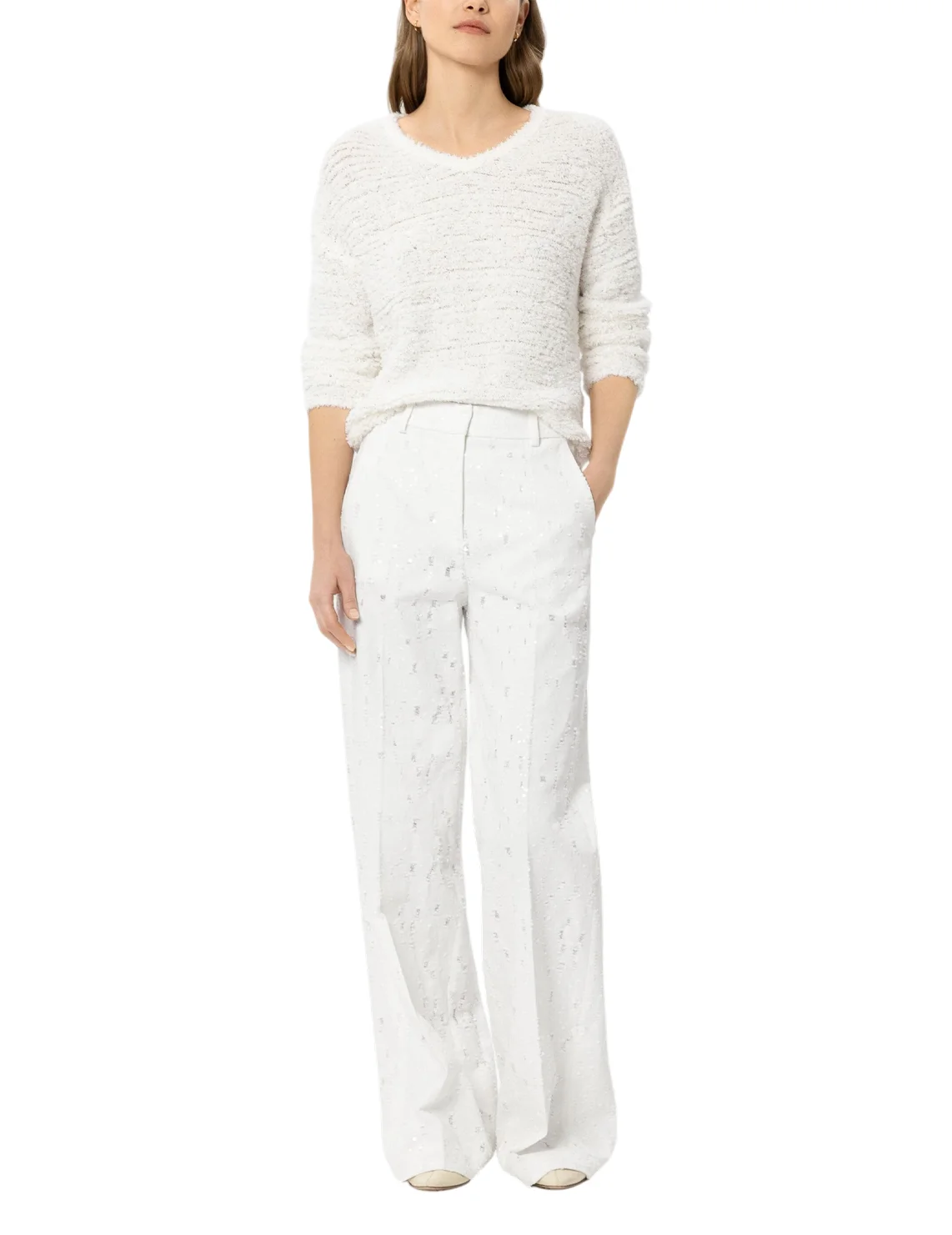 Брюки изготовлены из 100% хлопка. Модель выполнена в широком крое. Имеет шлевки для ремня, прорезные карманы, прессованные стрелки и скрытую застежку на пуговицу, крючок и молнию. Декорированные пайетками в тон.