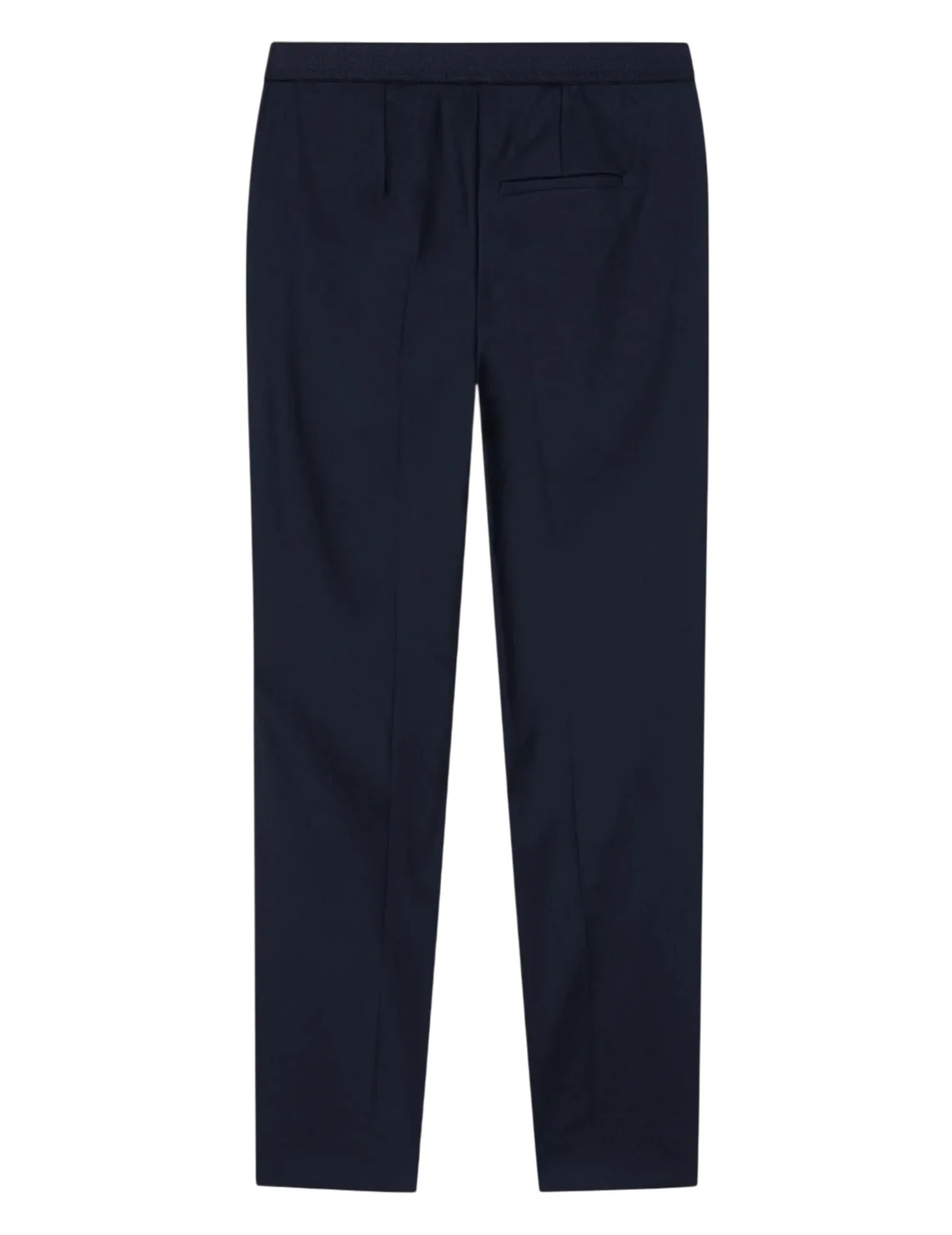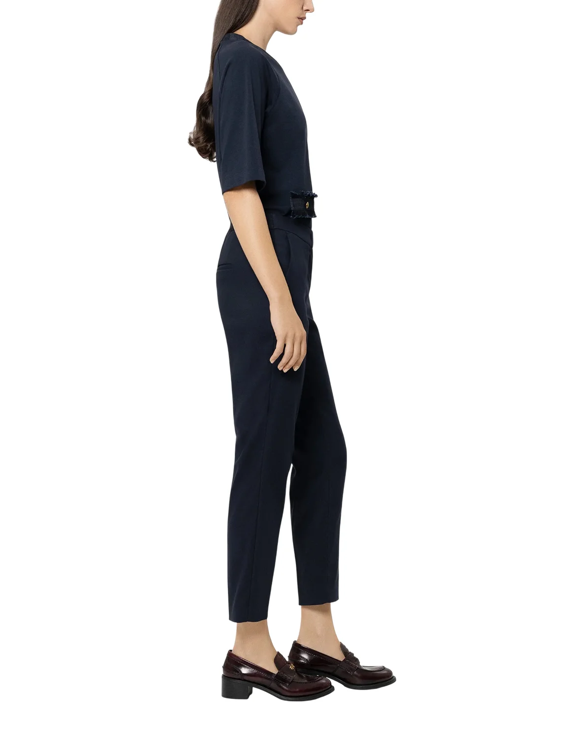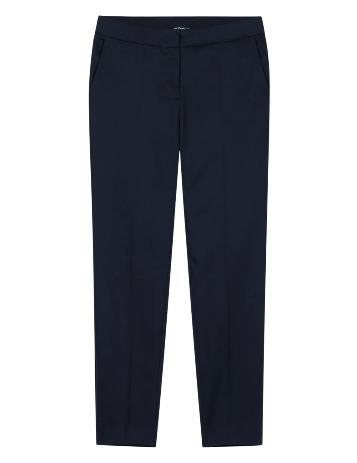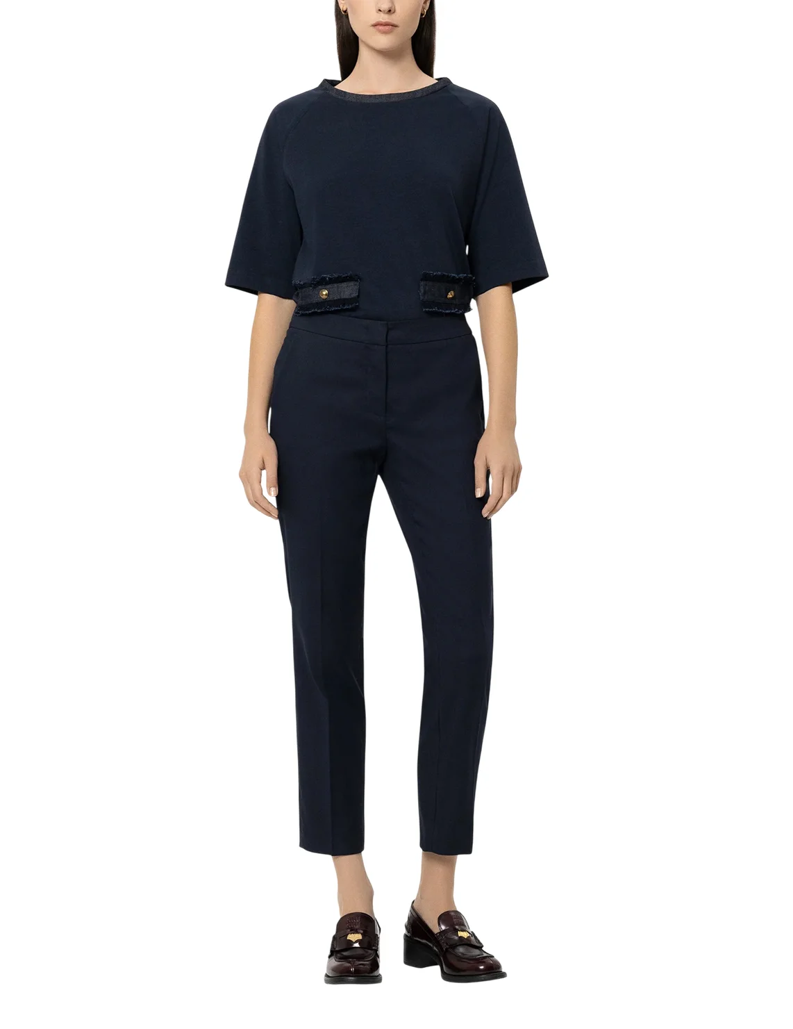 Брюки изготовлены из хлопка и эластана. Модель выполнена в зауженном крое. Имеет скрытую застежку-молнию с крючком, прессованные стрелки, декоративный карман сзади и прорезные боковые карманы.
