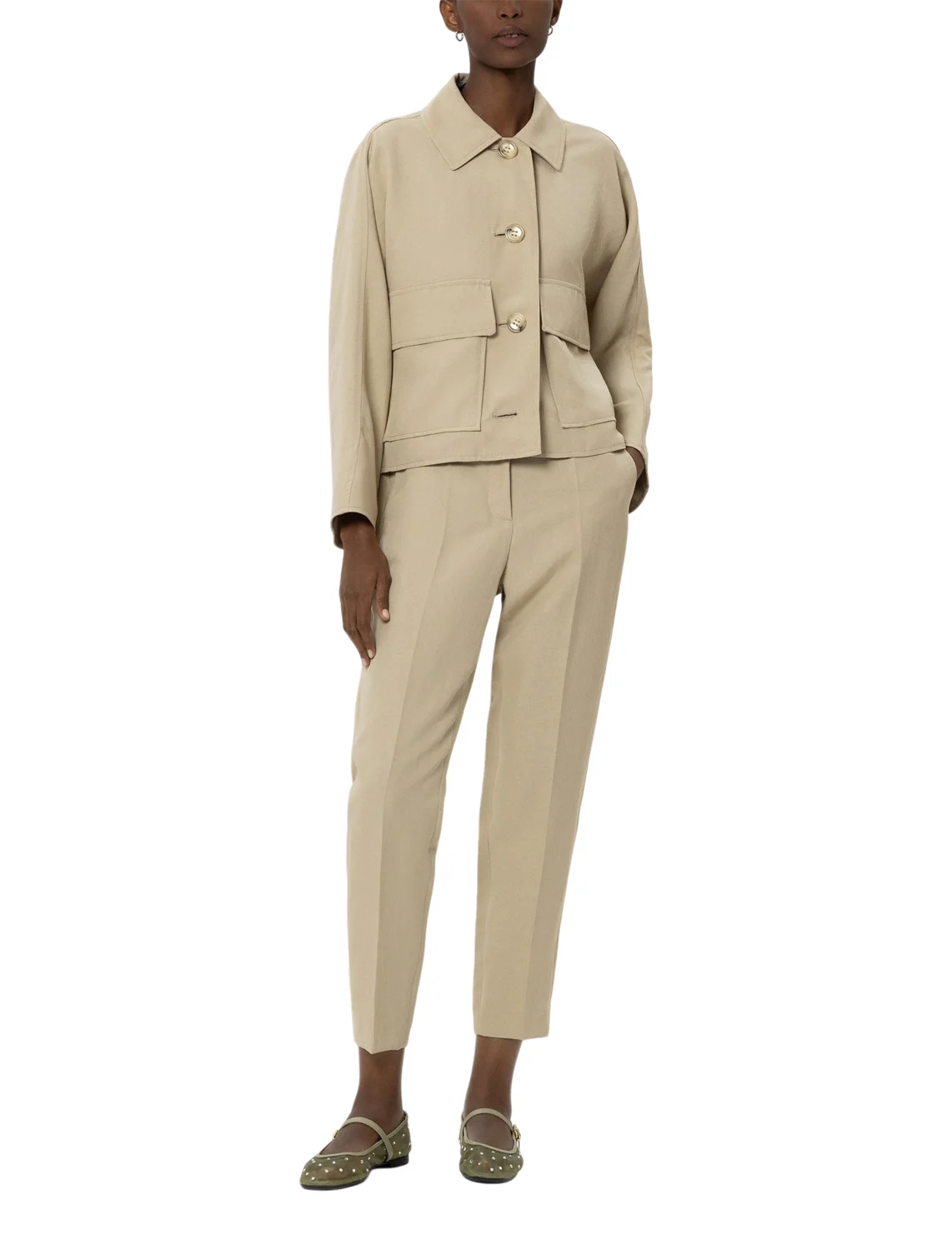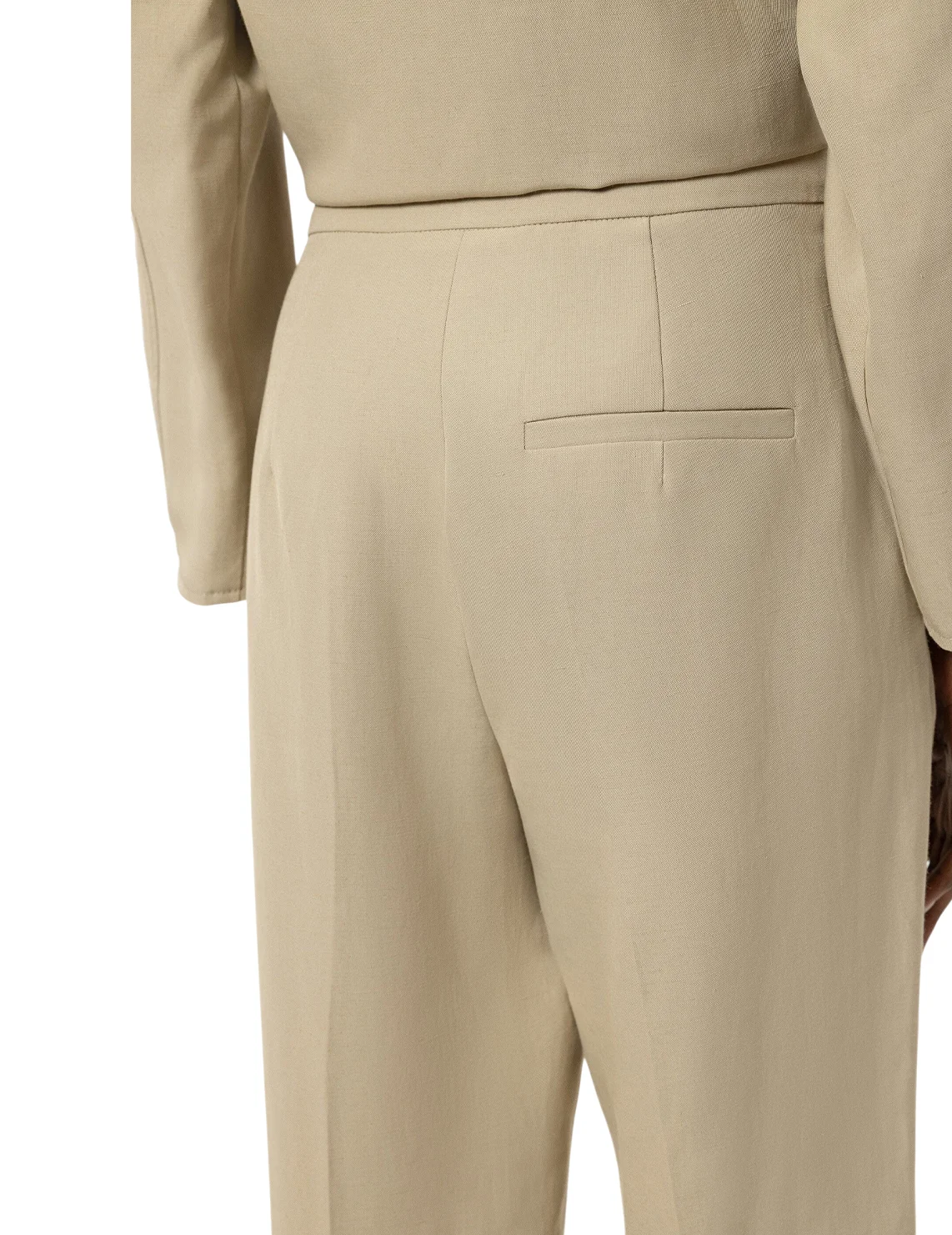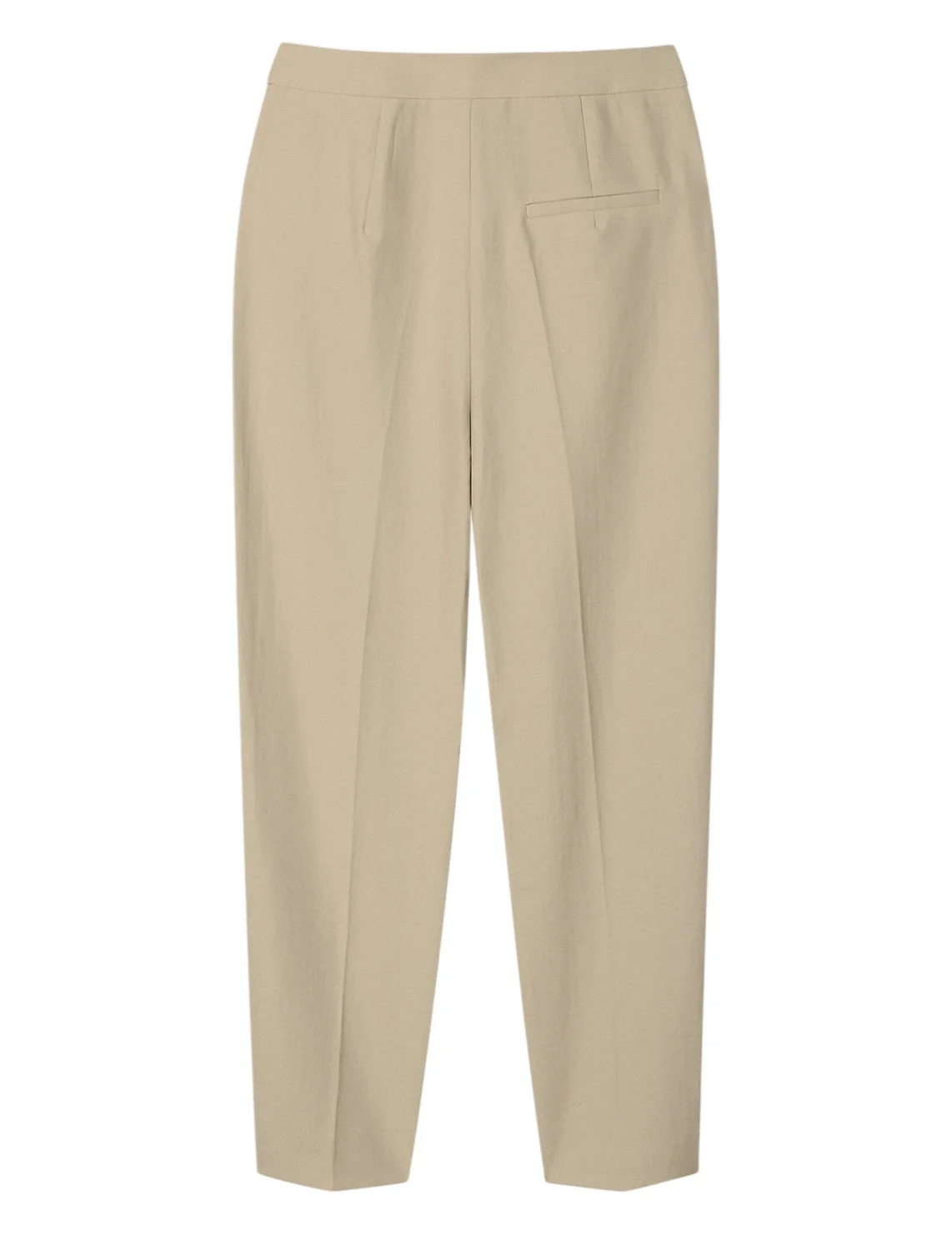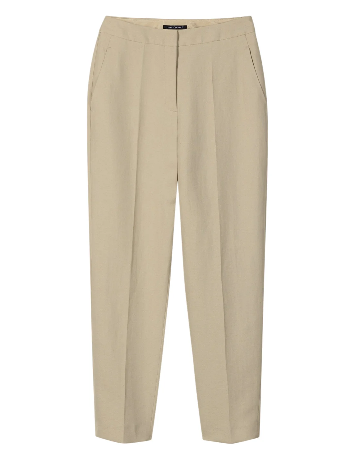 Брюки изготовлены из полиэстера и льна. Модель выполнена в зауженном крое. Имеет прессованные стрелки, скрытую застежку-молнию с крючком, прорезные боковые карманы и декоративный карман сзади.