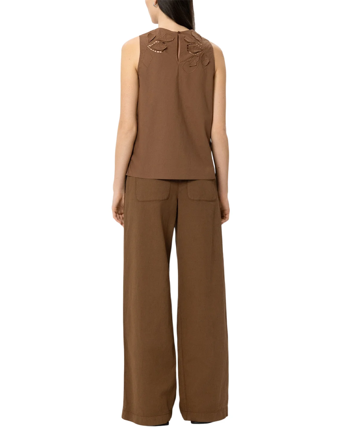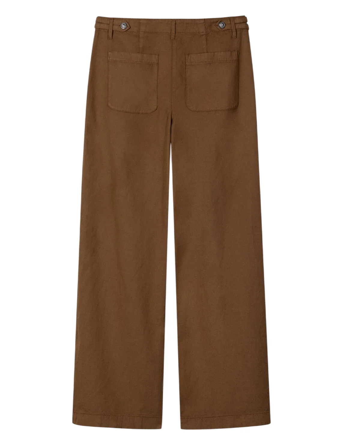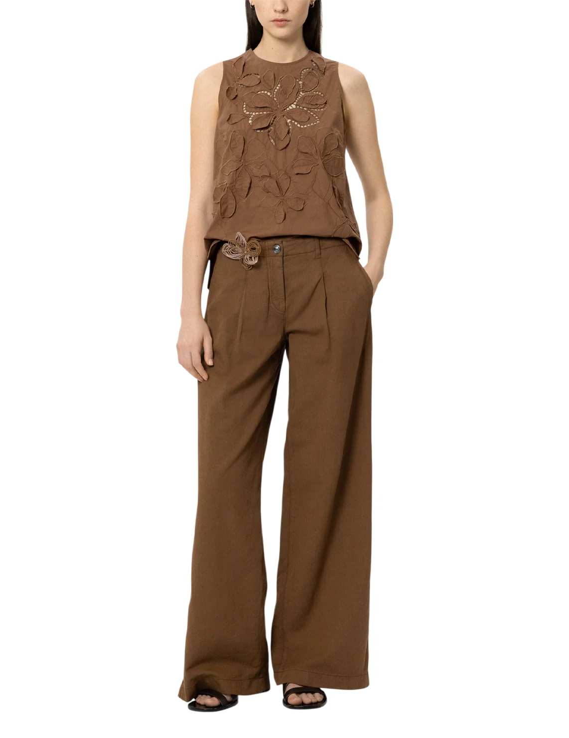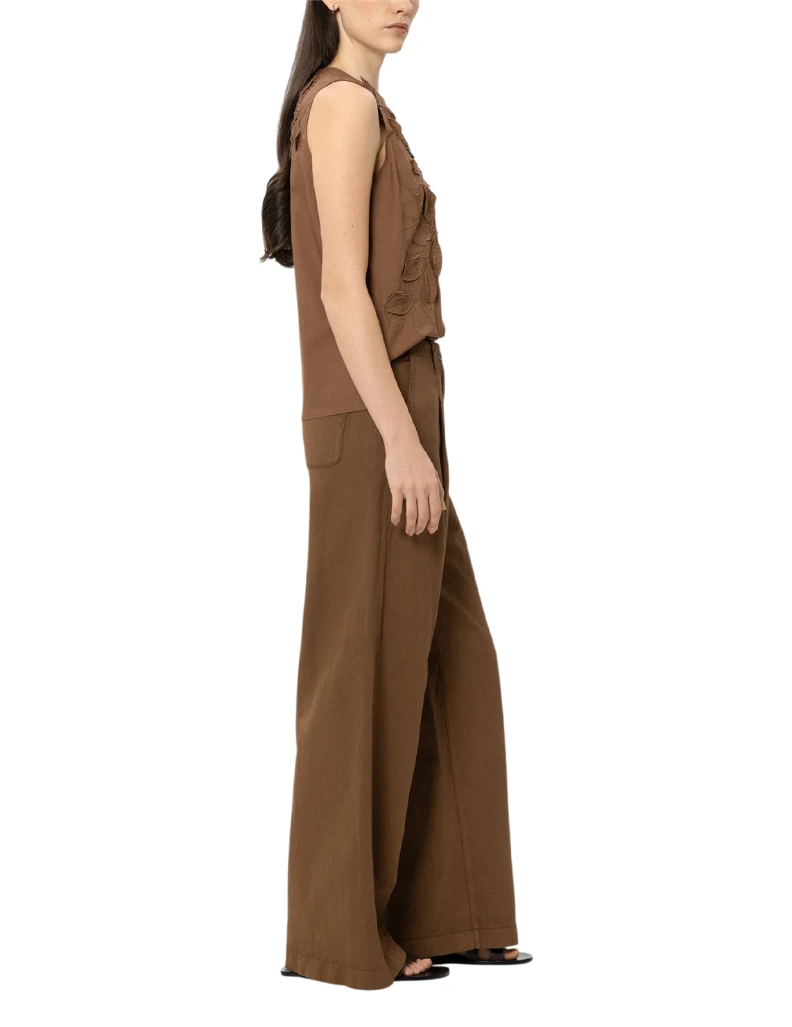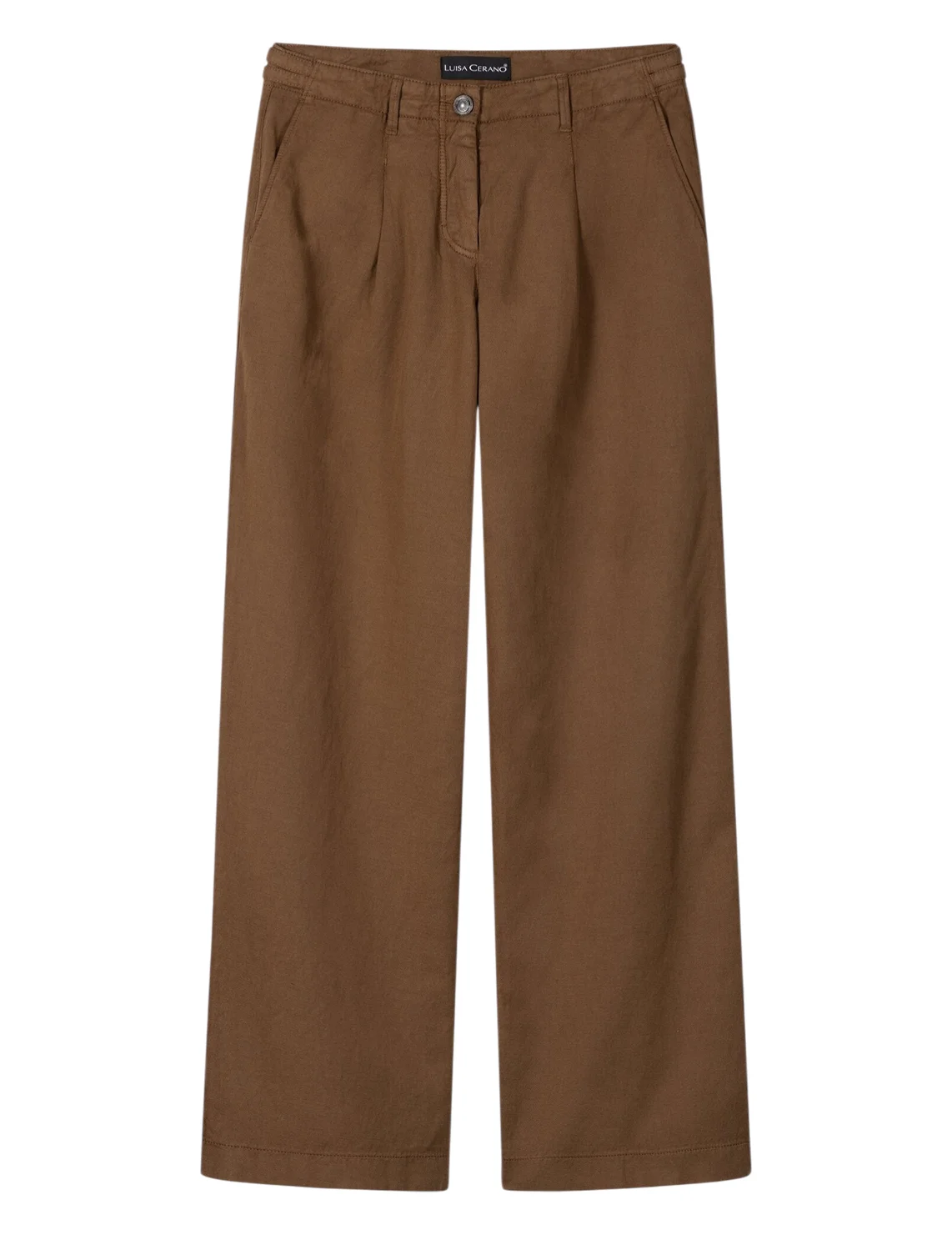 Брюки изготовлены из хлопка, льна, лиоцелла и эластана. Модель выполнена в свободном крое. Имеет шлёвки для ремня, складки, скрытую застежку-молнию с пуговицей, боковые прорезные и задние накладные карманы.