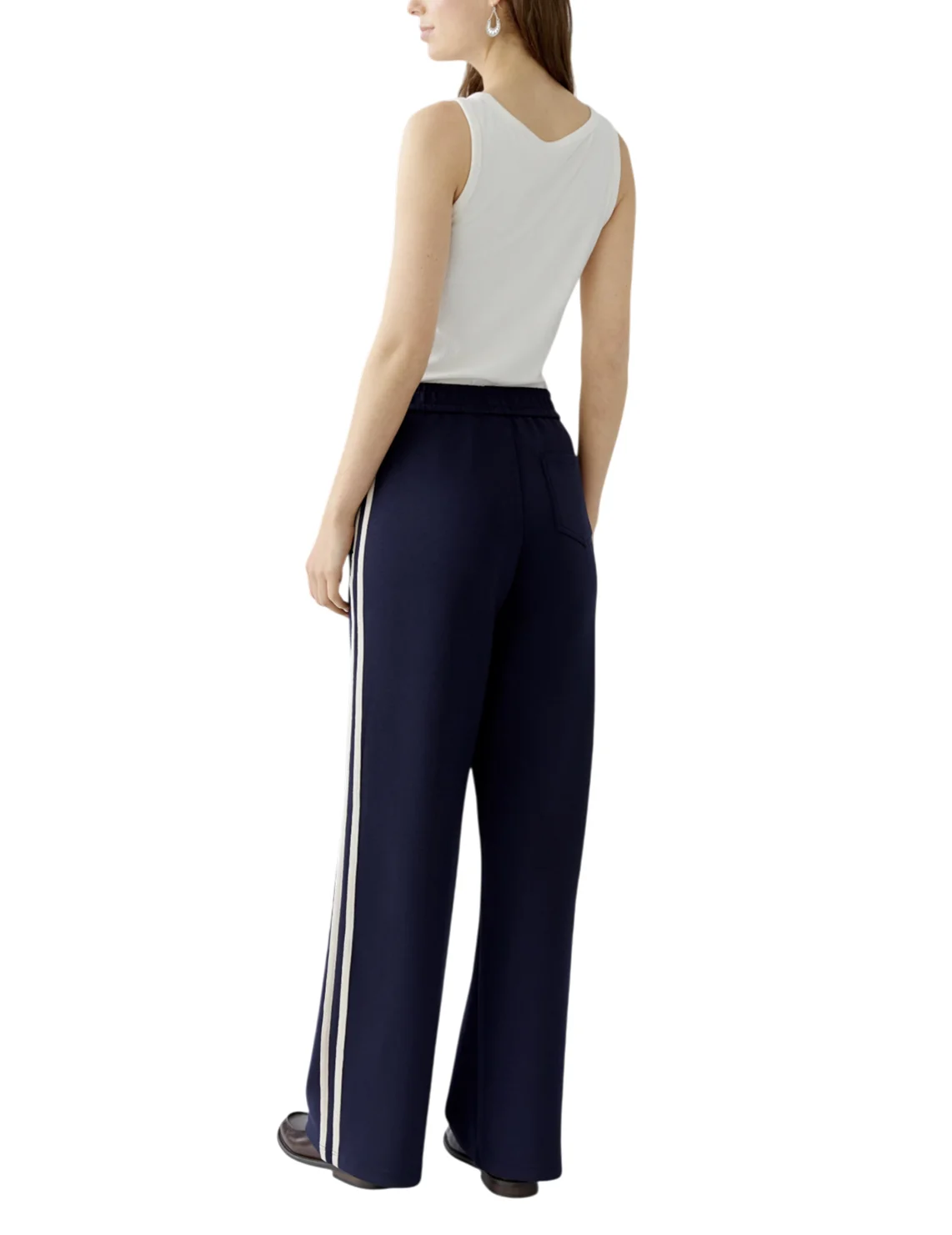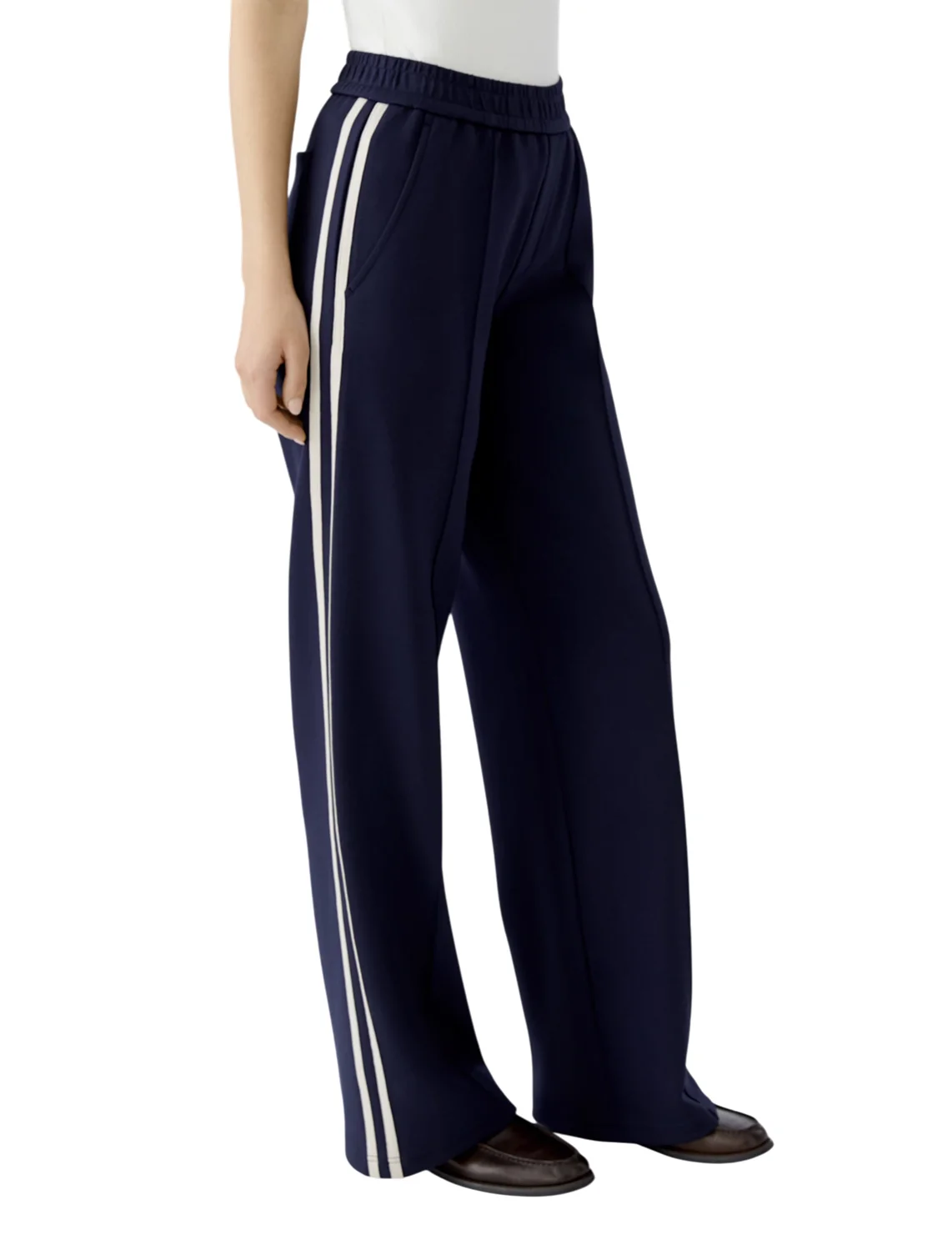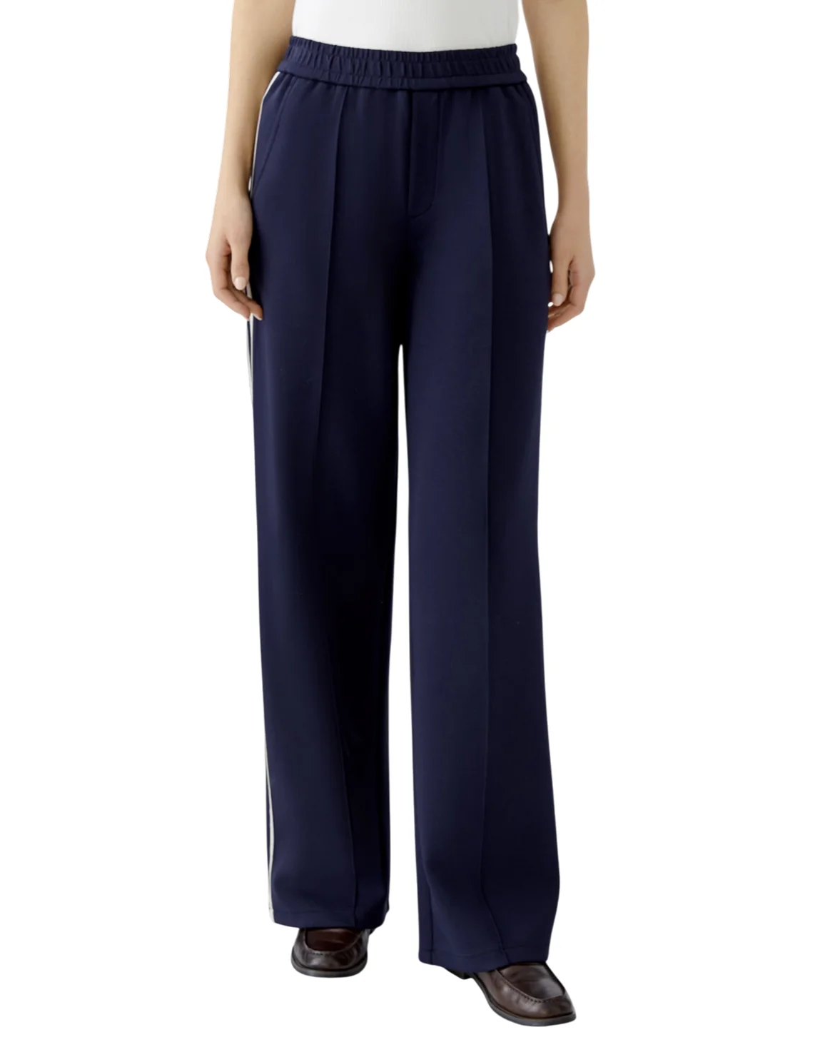 Брюки изготовлены из полиэстера, вискозы и эластана. Модель выполнена в свободном крое. Имеет эластичный пояс, накладной карман сзади, боковые прорезные карманы и простроченные стрелки. Декорированы лампасами