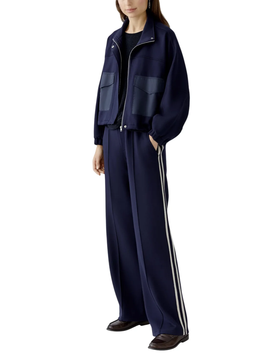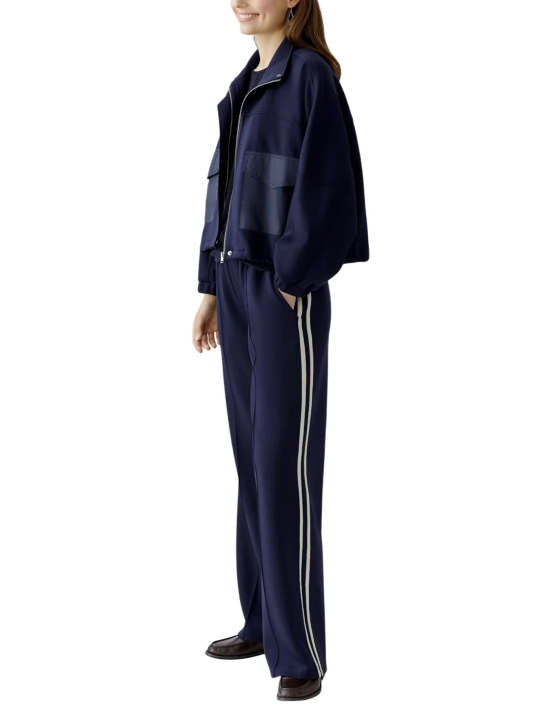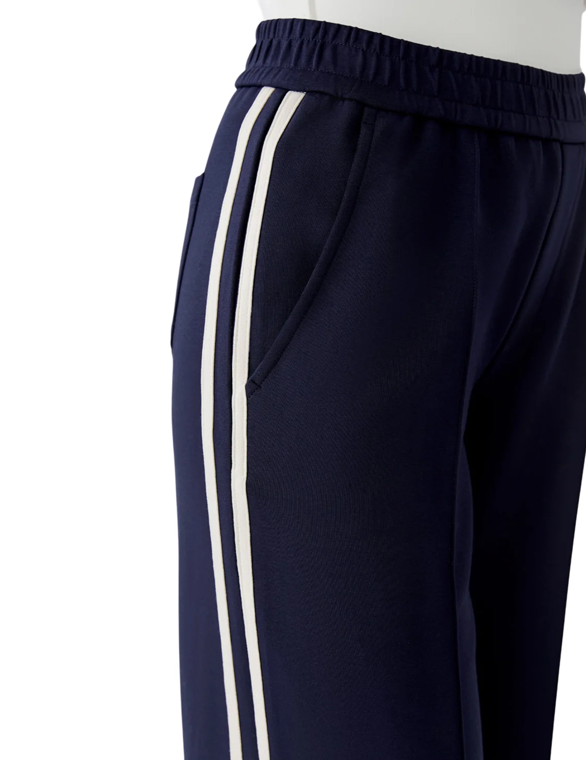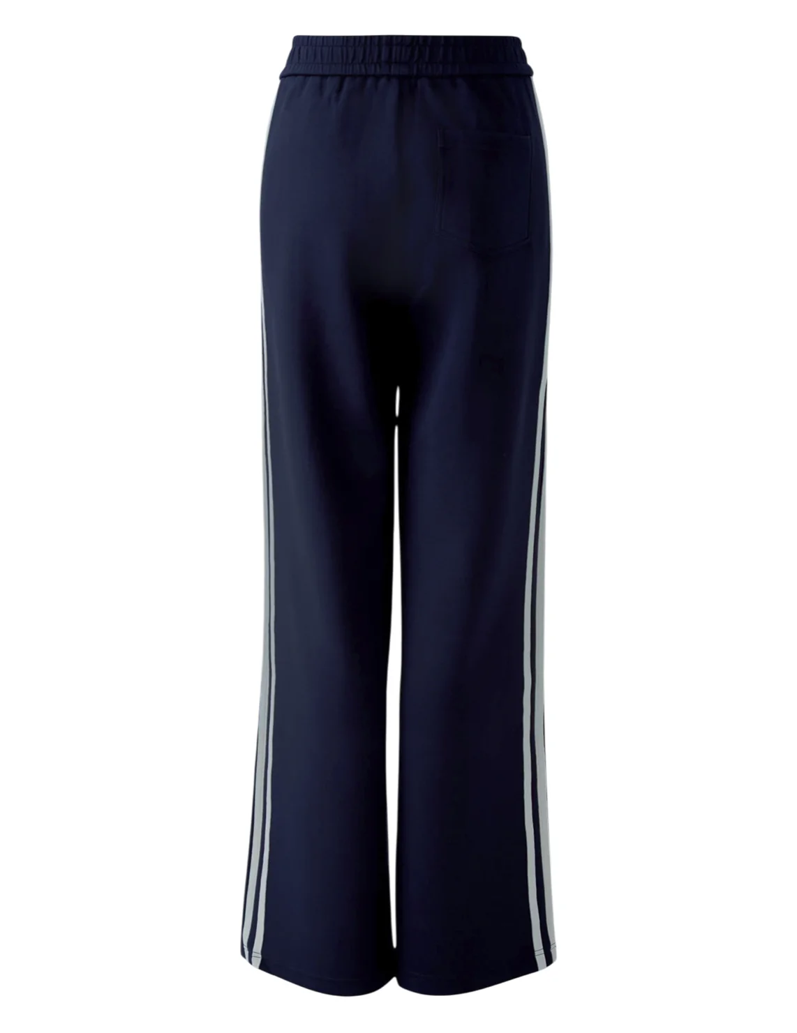Брюки изготовлены из полиэстера, вискозы и эластана. Модель выполнена в свободном крое. Имеет эластичный пояс, накладной карман сзади, боковые прорезные карманы и простроченные стрелки. Декорированы лампасами