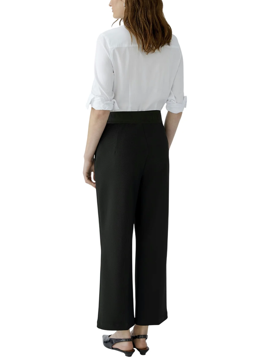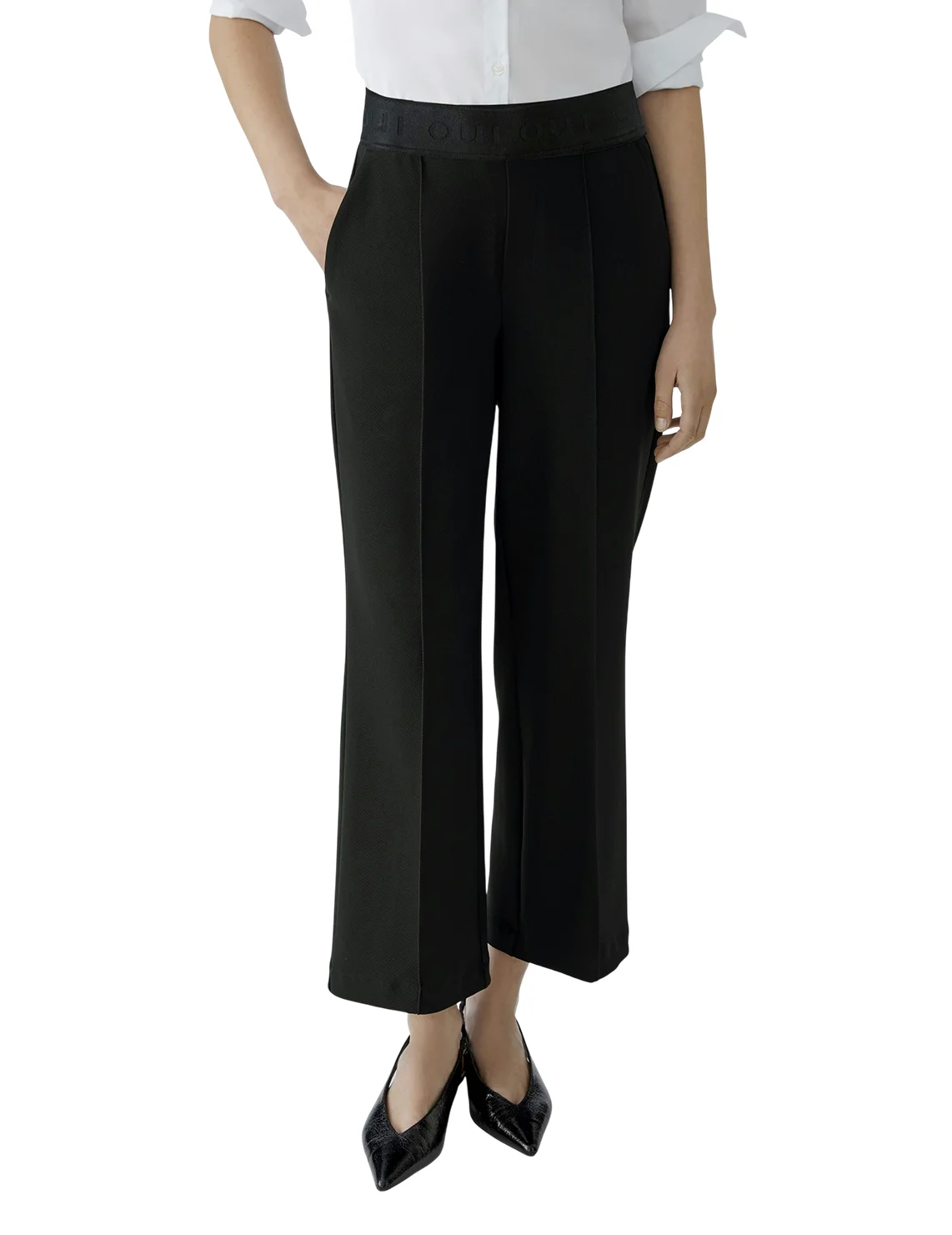 Брюки изготовлены из полиэстера и эластана. Модель выполнена в свободном крое. Имеет эластичный пояс с логотипом бренда, прорезные боковые карманы, простроченные стрелки спереди и прессованные стрелки сзади.