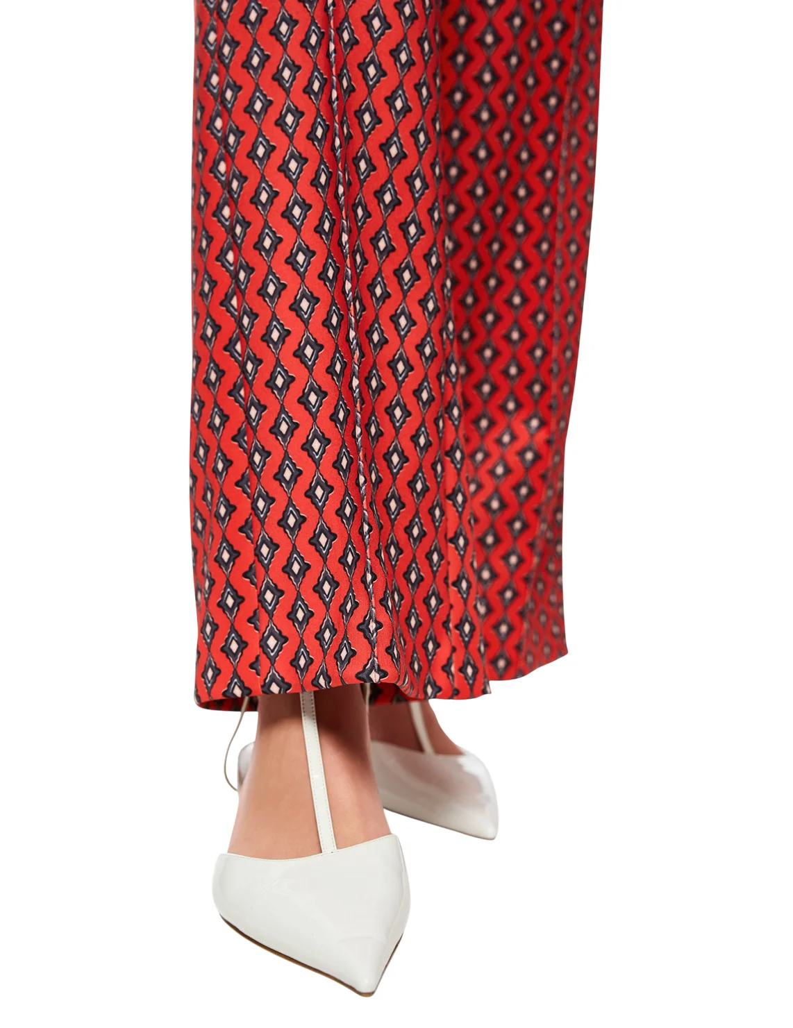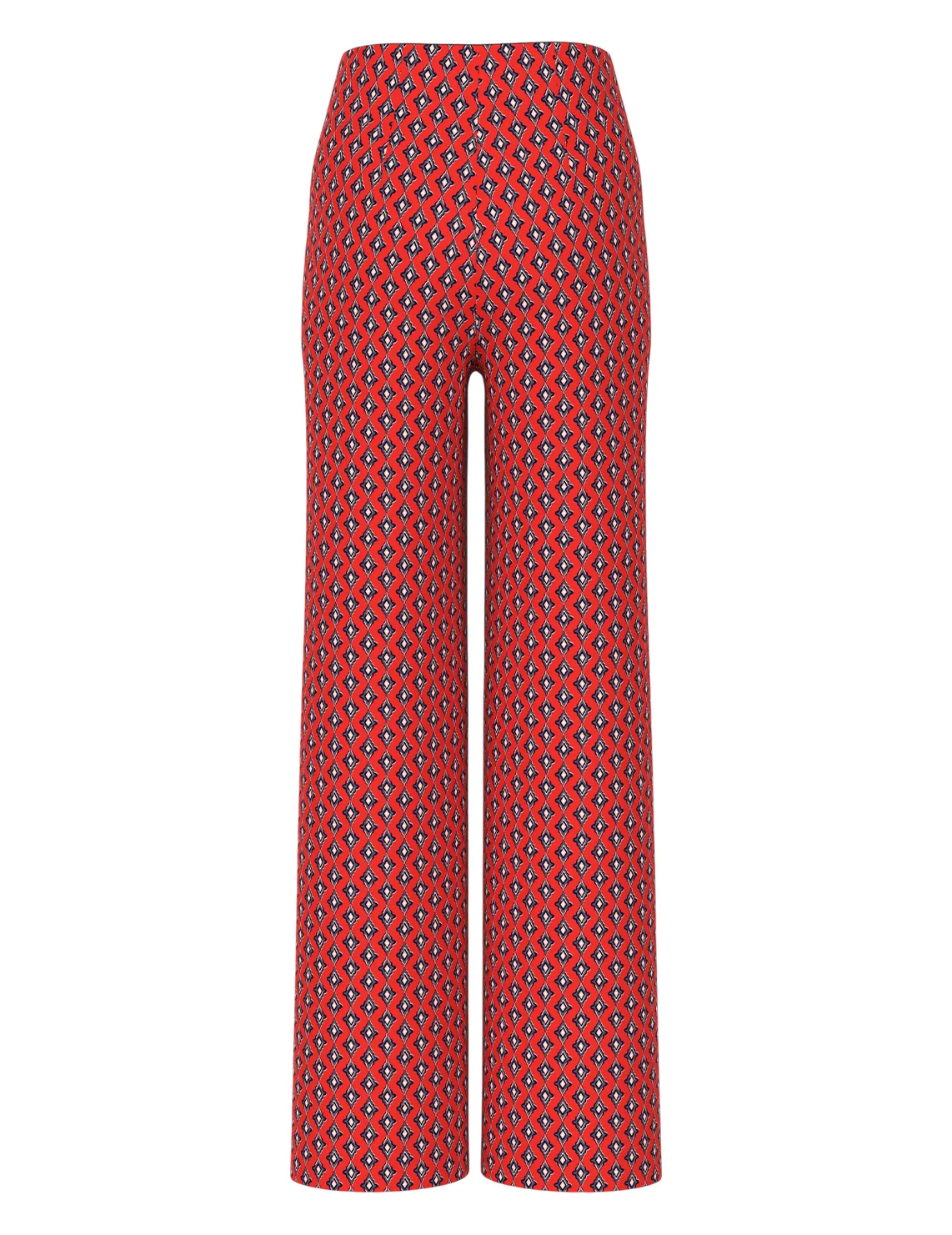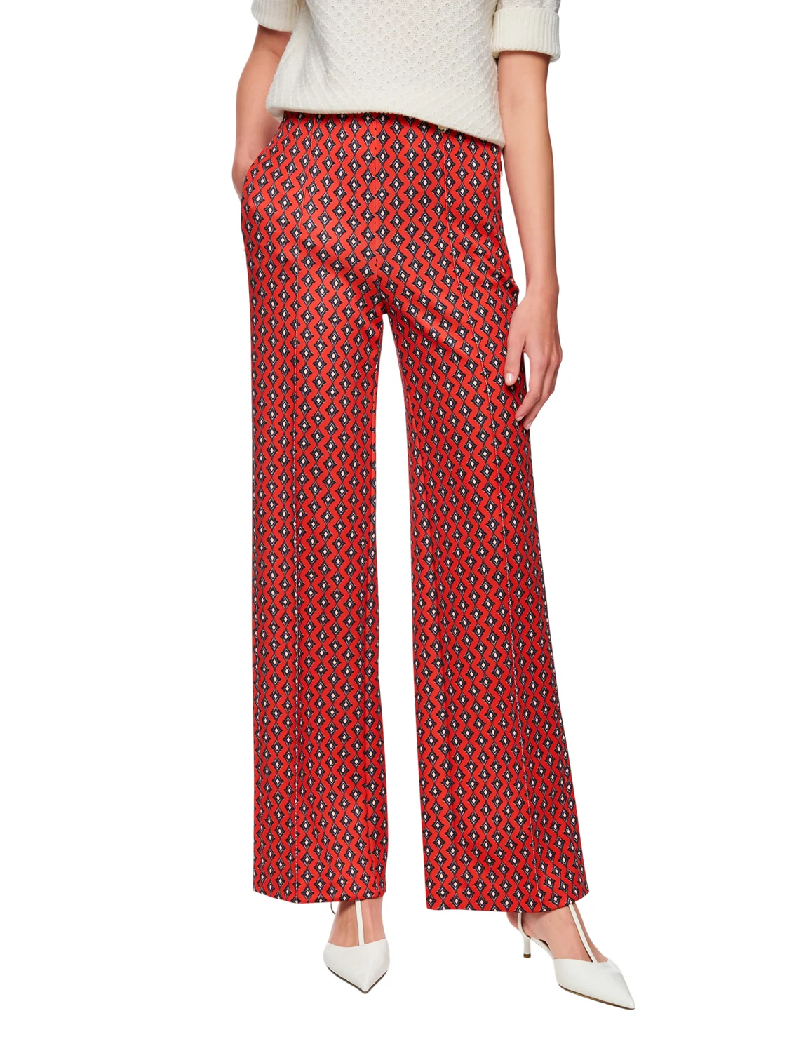 Брюки изготовлены из полиэстера и эластана. Модель выполнена в свободном крое. Имеет эластичный пояс, прорезные карманы на молнии и простроченные стрелки. Декорированы орнаментным принтом.