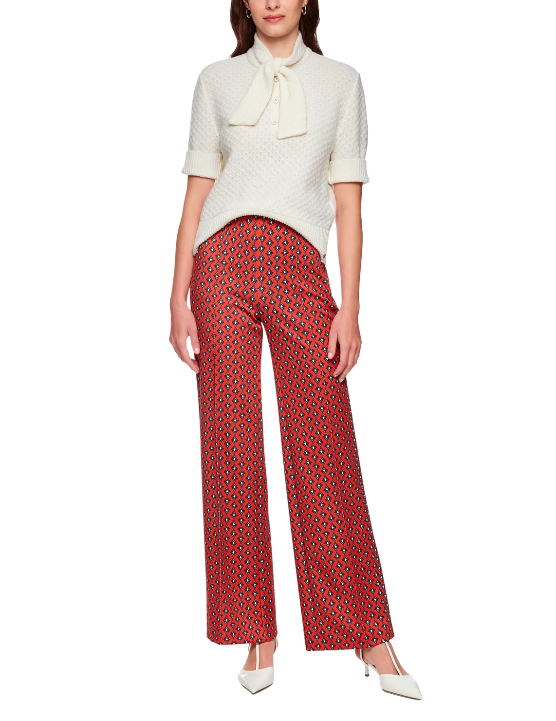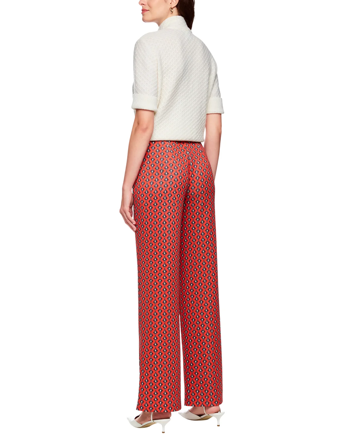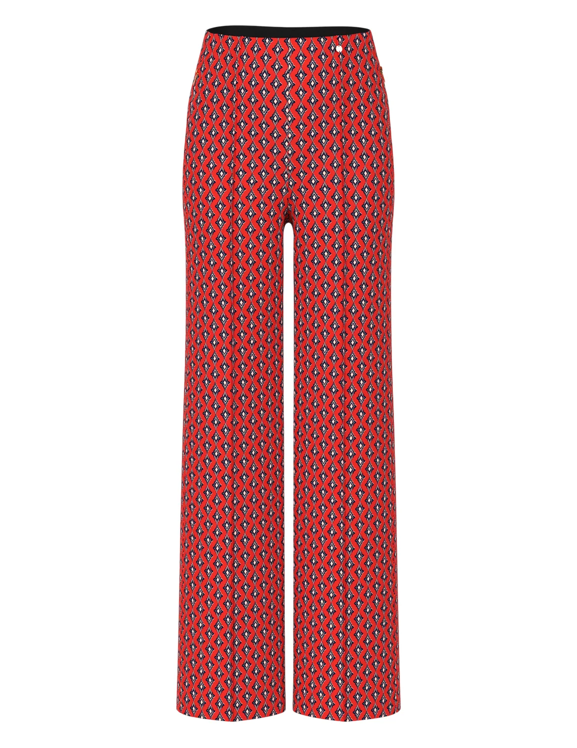 Брюки изготовлены из полиэстера и эластана. Модель выполнена в свободном крое. Имеет эластичный пояс, прорезные карманы на молнии и простроченные стрелки. Декорированы орнаментным принтом.