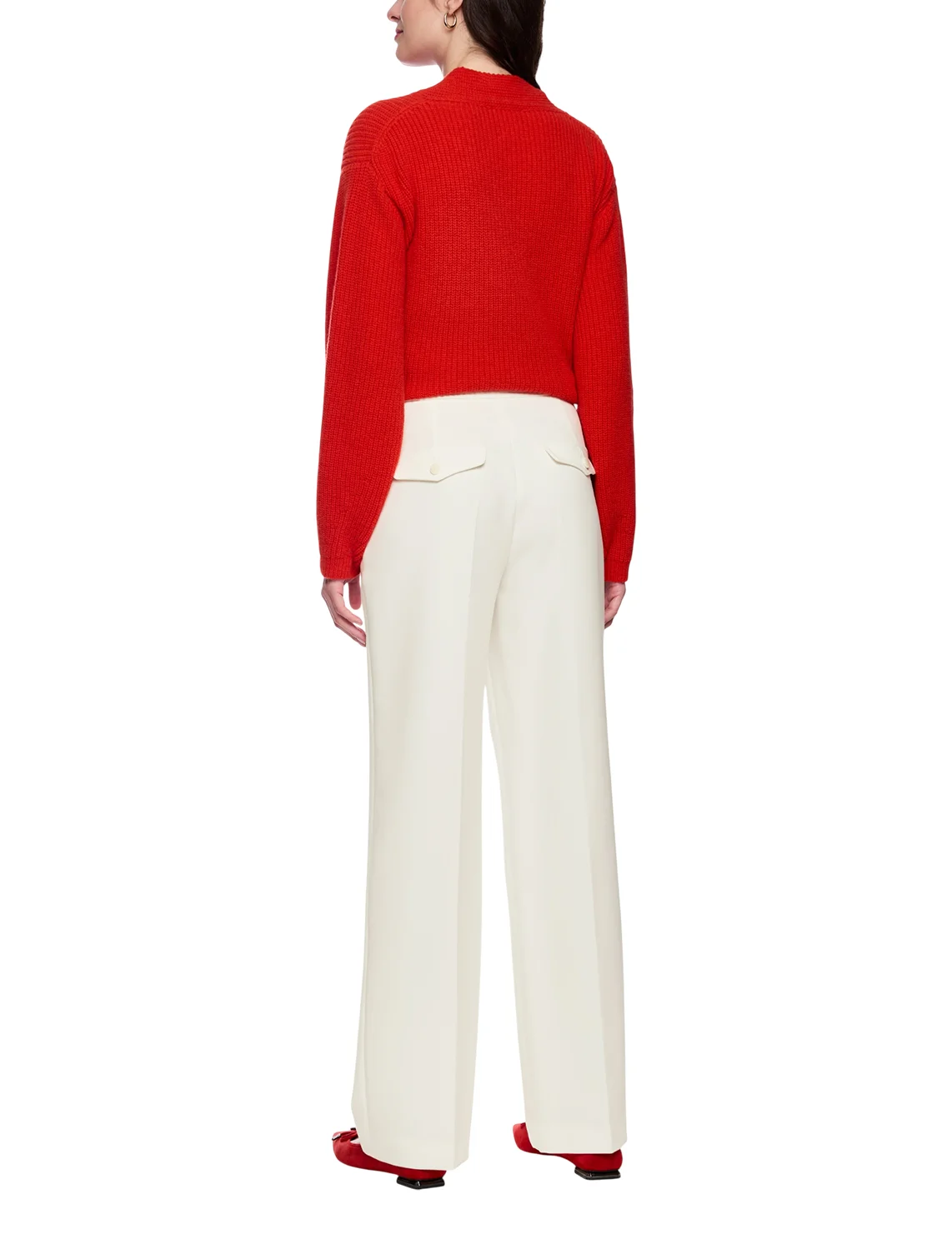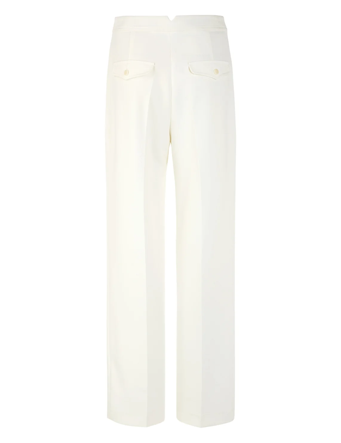 Брюки изготовлены из полиэстера, вискозы и эластана. Модель выполнена в свободном крое. Имеет скрытую застежку-молнию с пуговицей, прорезные боковые карманы, прессованные стрелки и декоративные клапаны сзади.
