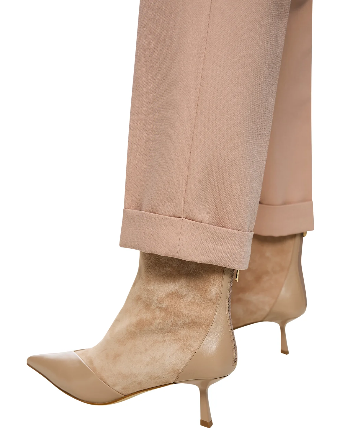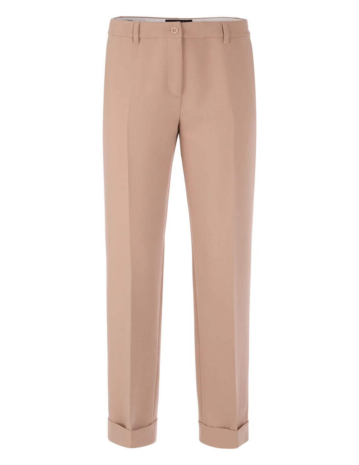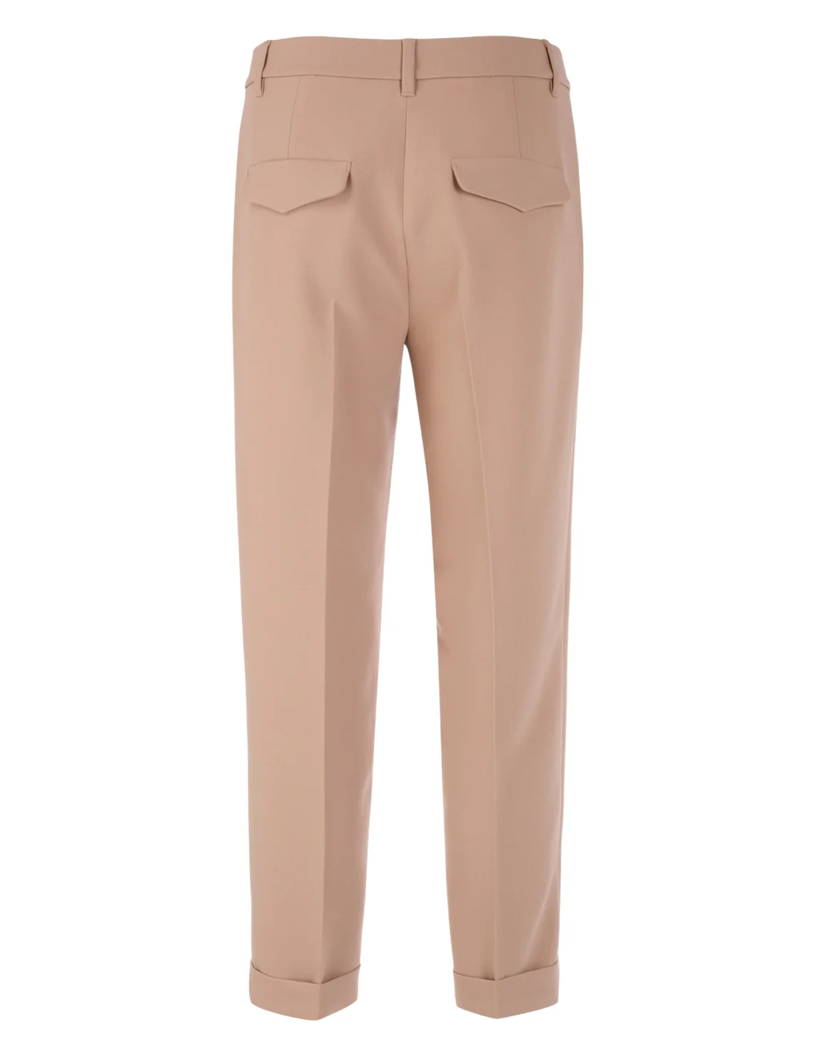 Брюки изготовлены из полиэстера, вискозы и эластана. Модель выполнена в прямом крое. Имеет петли для ремня, скрытую застежку-молнию с крючком, отвороты, прессованные стрелки, прорезные боковые карманы и декоративные клапаны сзади.