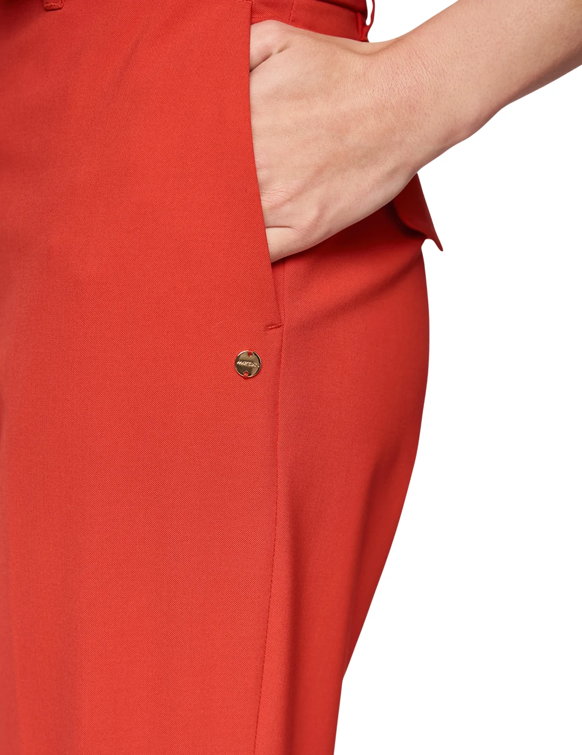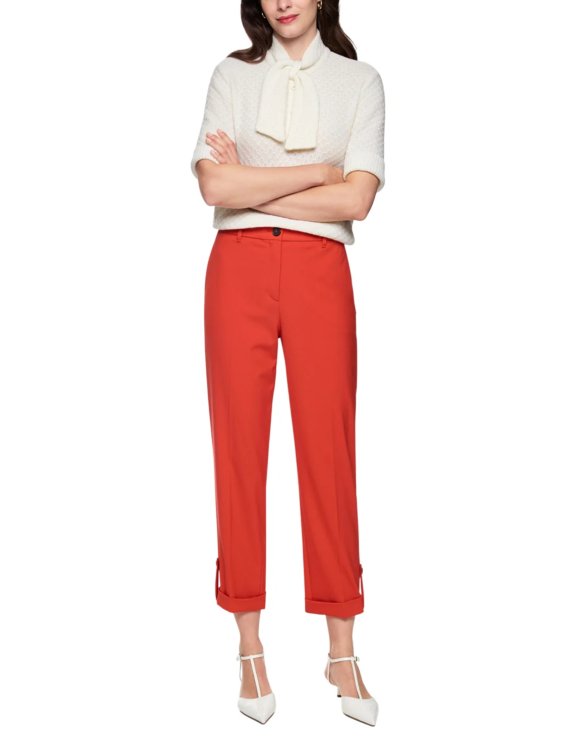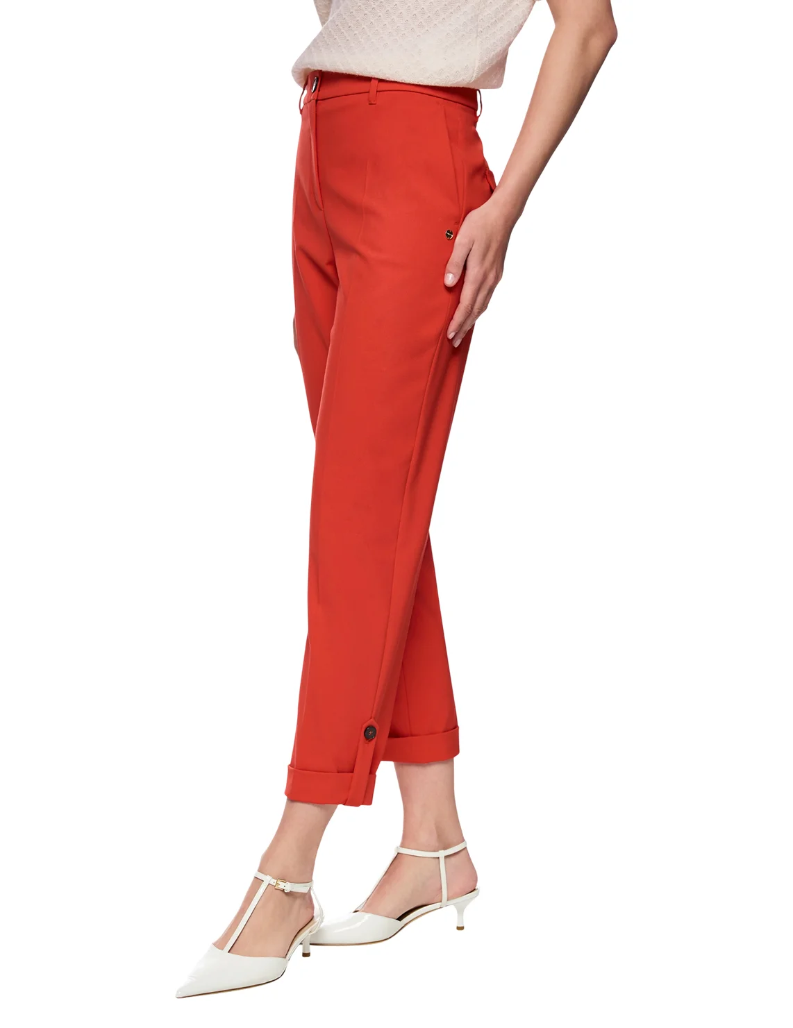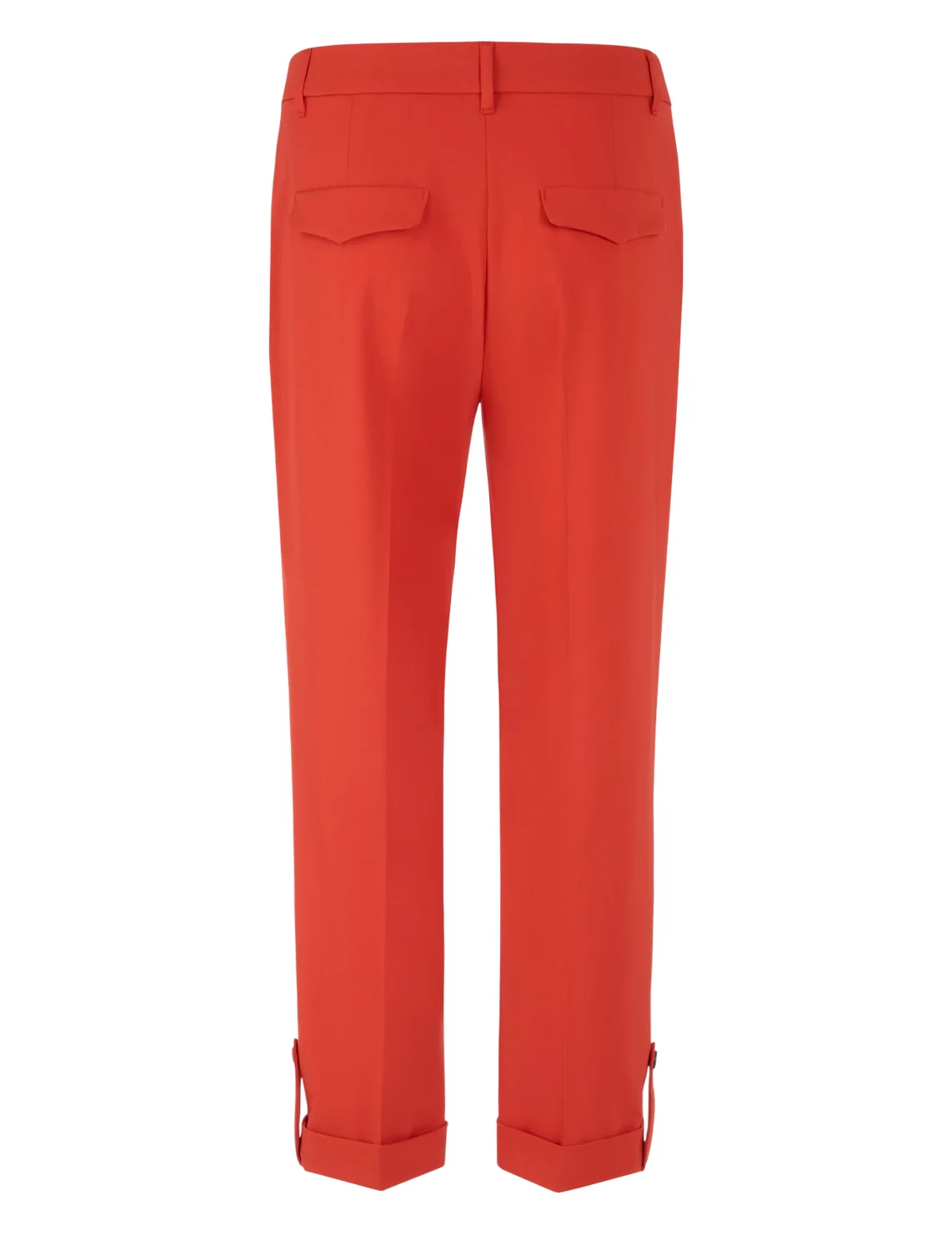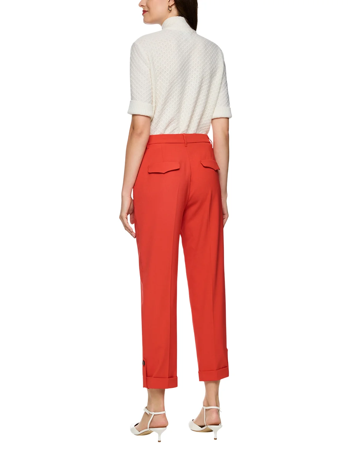 Брюки изготовлены из вискозы, полиэстера и эластана. Модель выполнена в прямом крое. Имеет шлёвки для ремня, скрытую застежку-молнию с пуговицей, прорезные боковые карманы, прессованные стрелки, отвороты и карманы с клапанами сзади.