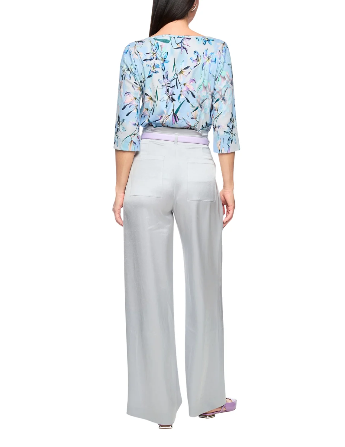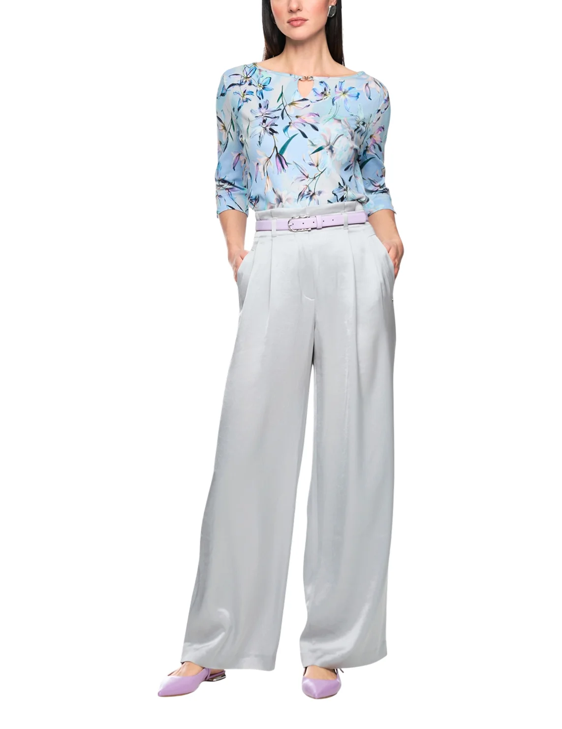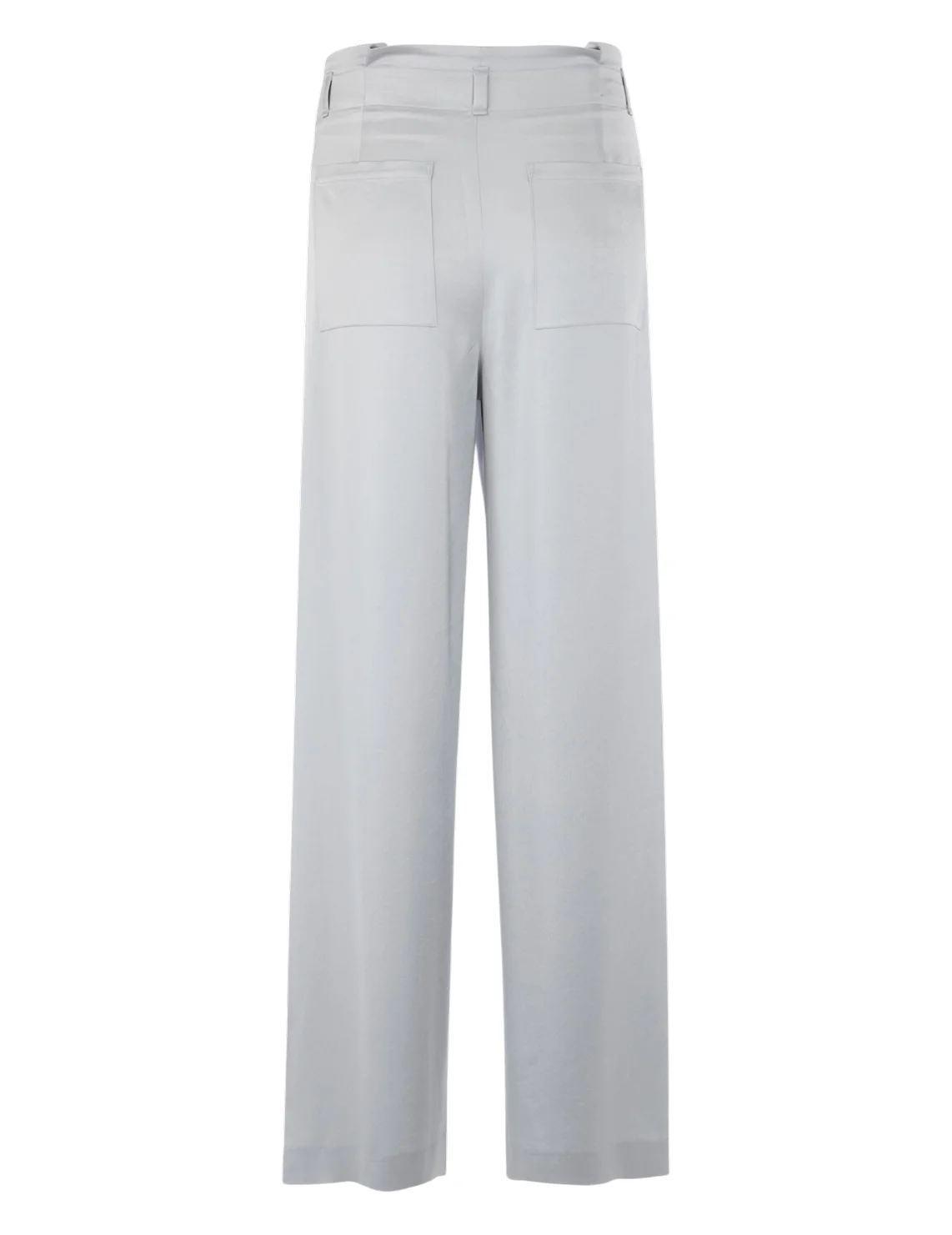 Брюки изготовлены из ацетата и полиэстера. Модель выполнена в свободном крое. Имеет шлёвки для ремня, скрытую застежку-молнию с крючком, прорезные боковые карманы, складки и накладные карманы сзади.