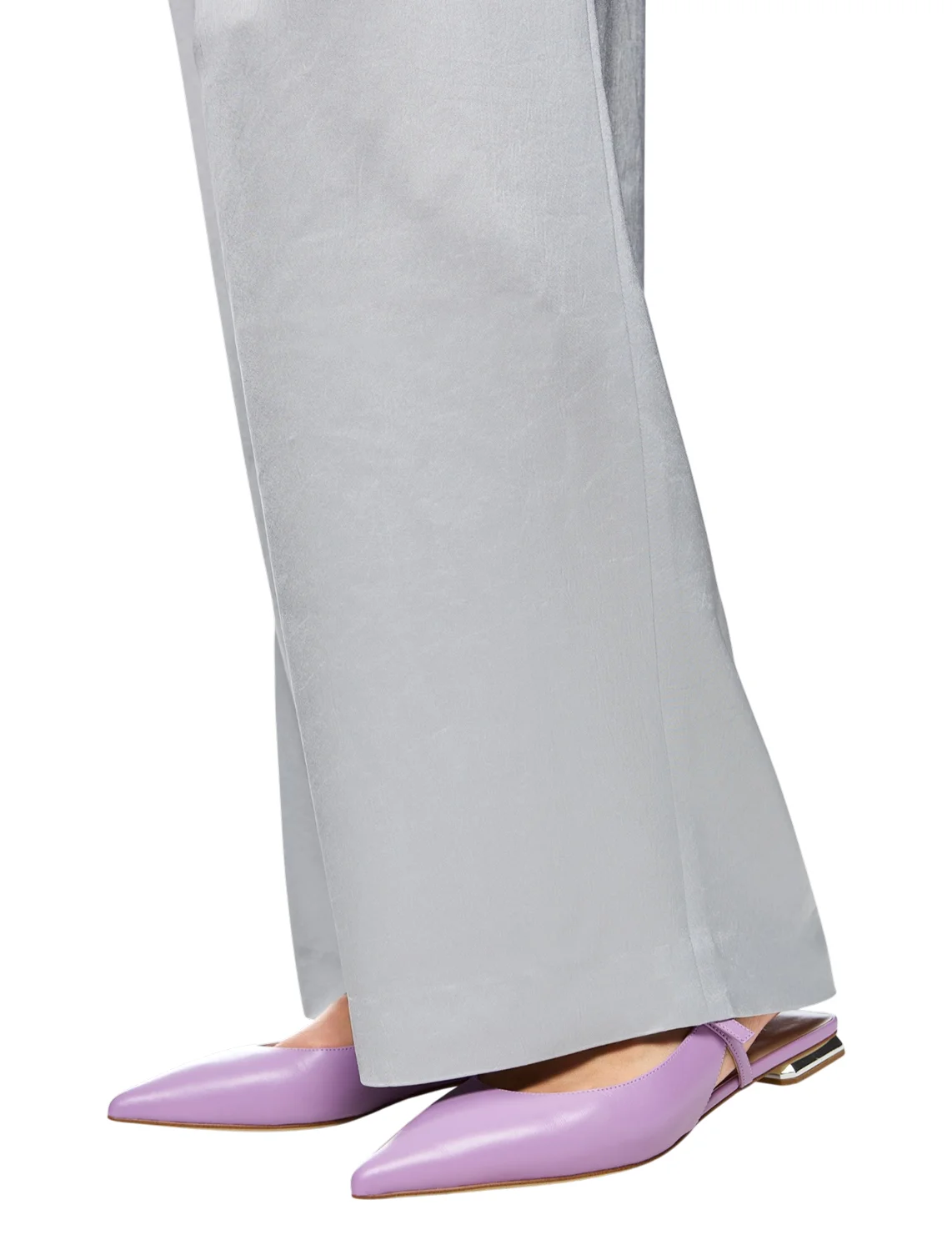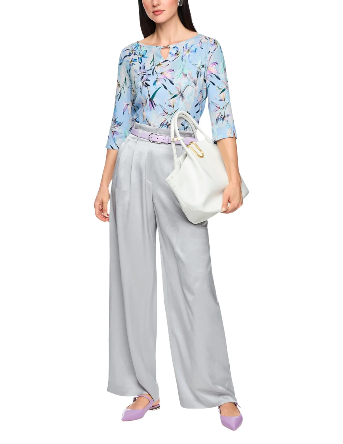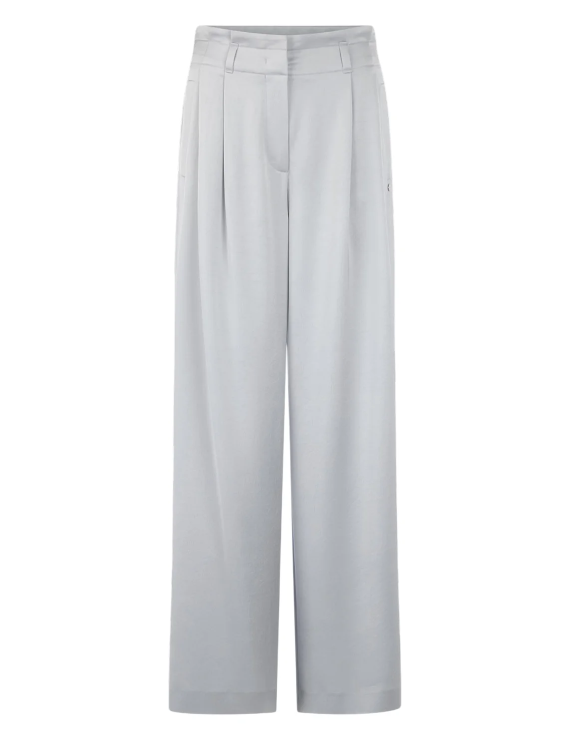 Брюки изготовлены из ацетата и полиэстера. Модель выполнена в свободном крое. Имеет шлёвки для ремня, скрытую застежку-молнию с крючком, прорезные боковые карманы, складки и накладные карманы сзади.