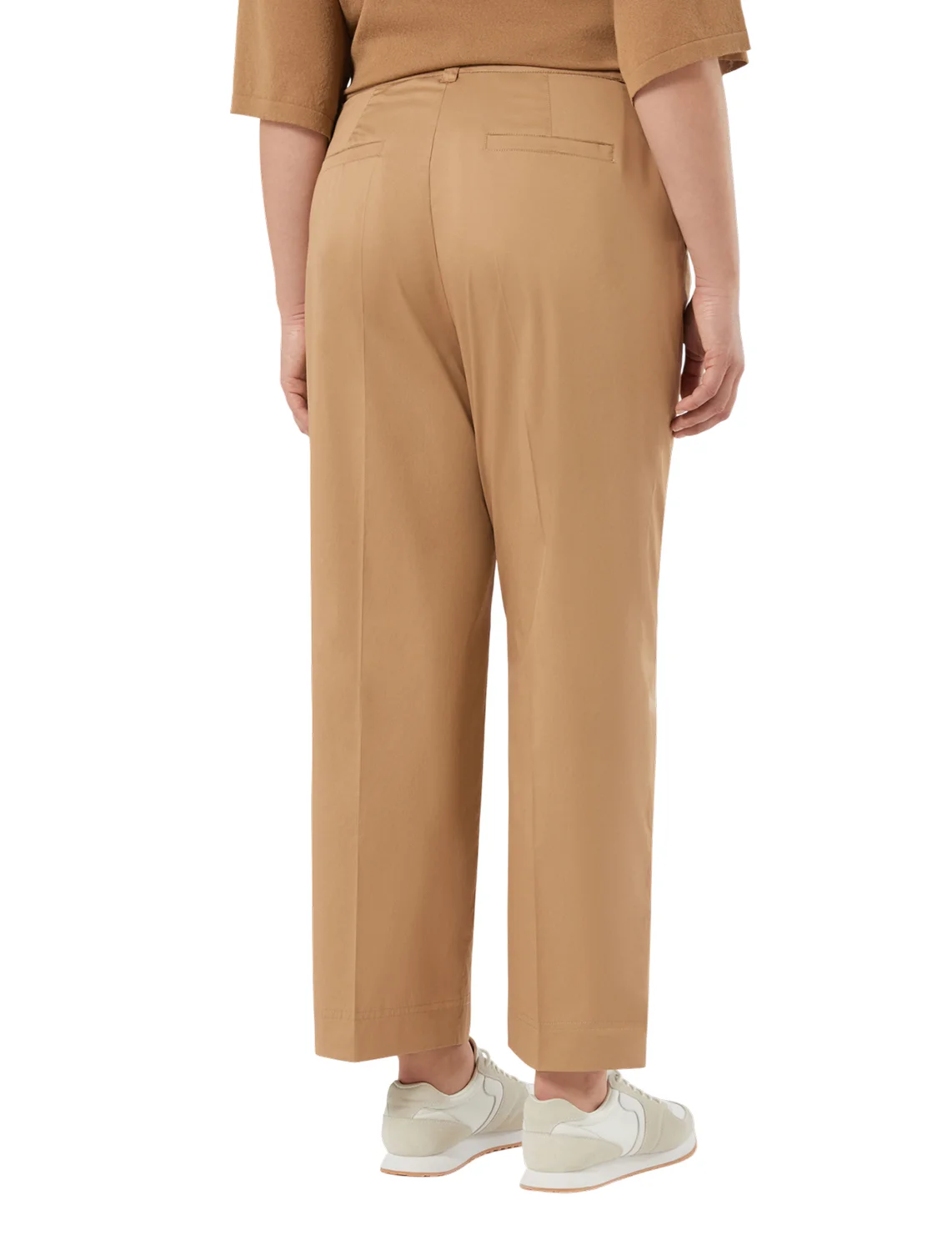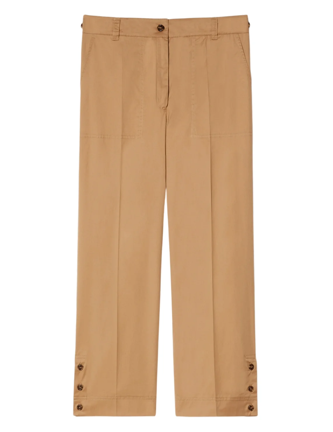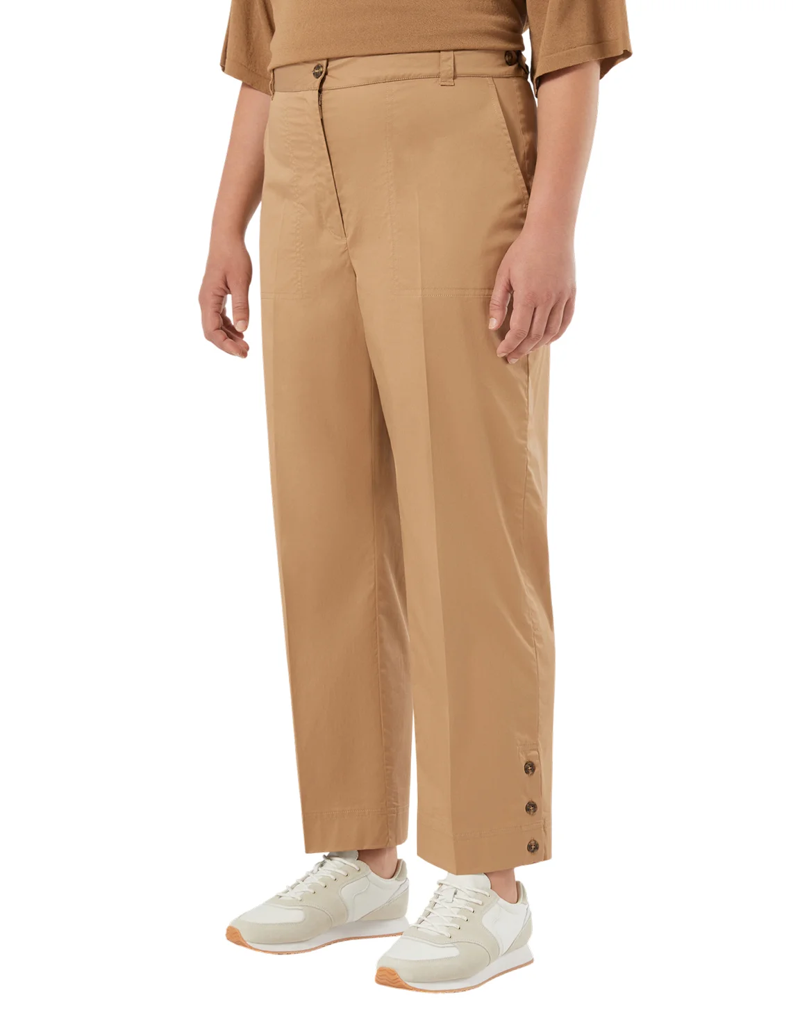 Брюки изготовлены из хлопка и эластана. Модель выполнена в прямом крое. Имеет петли для ремня, прессованные стрелки, скрытую застежку-молнию с пуговицей, разрезы по низу штанин на пуговицах, боковые накладные и задние прорезные карманы.