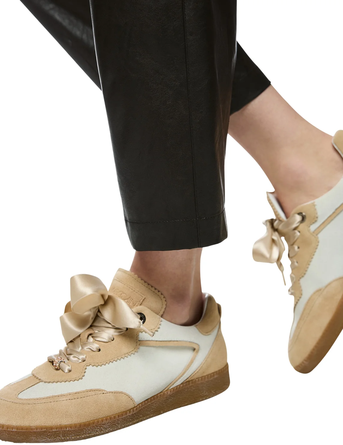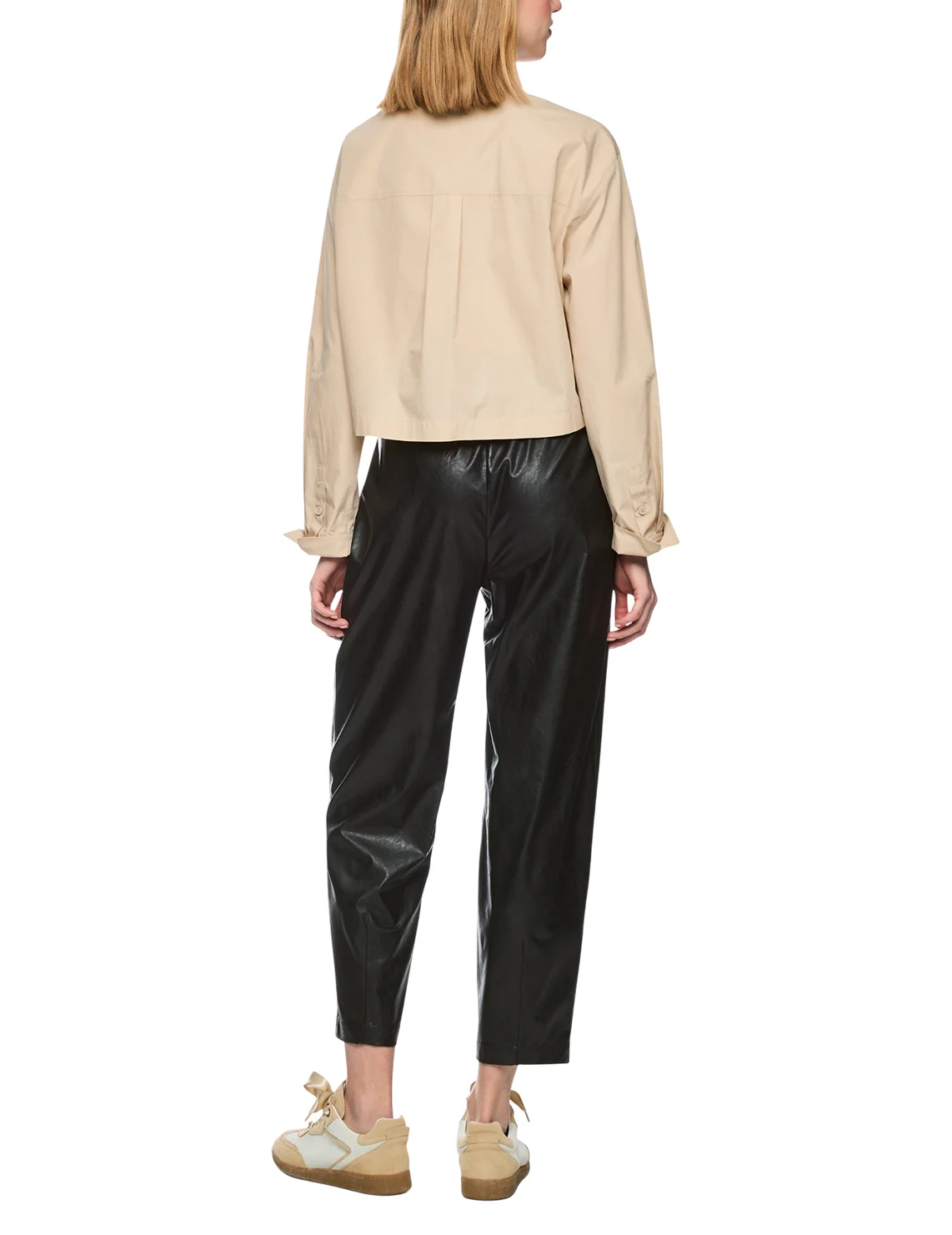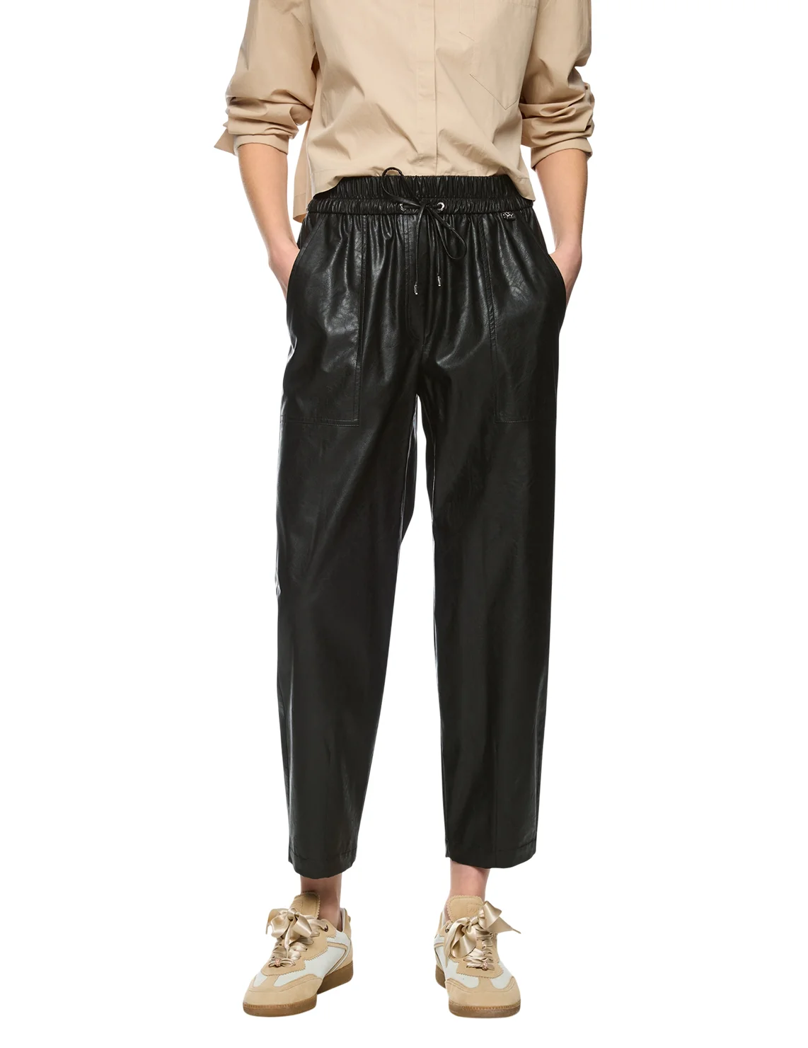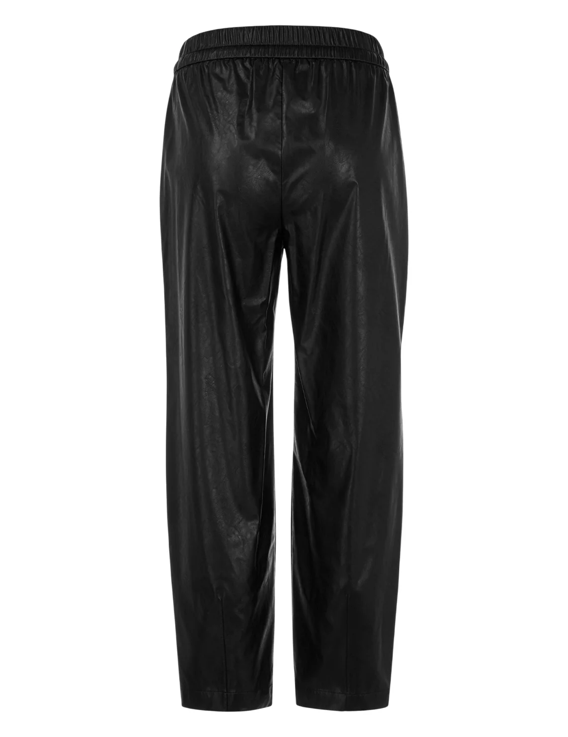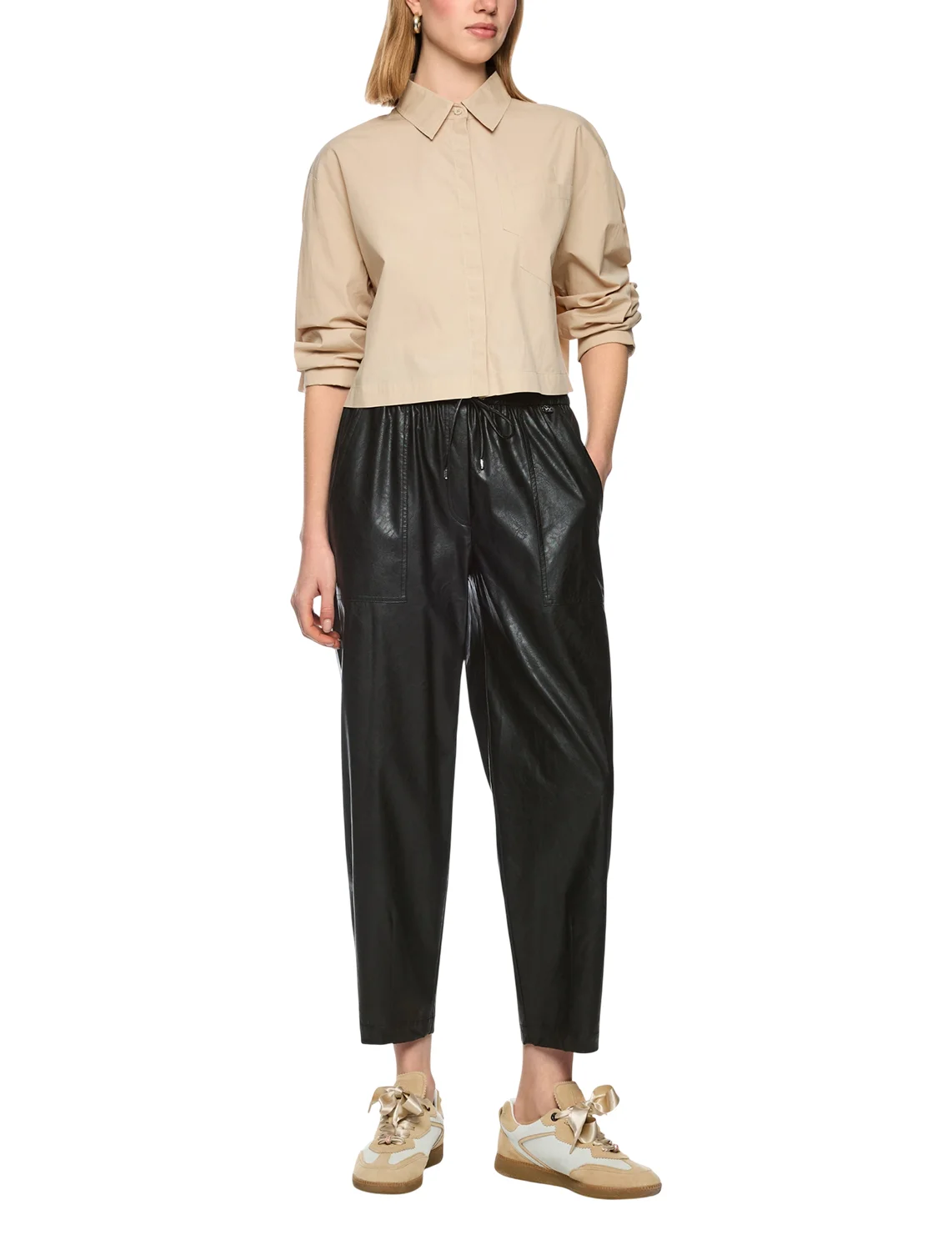 Брюки изготовлены из вискозы и полиэстера с полиуретановым покрытием. Модель выполнена в прямом крое. Имеет эластичный пояс с кулиской и накладные карманы.