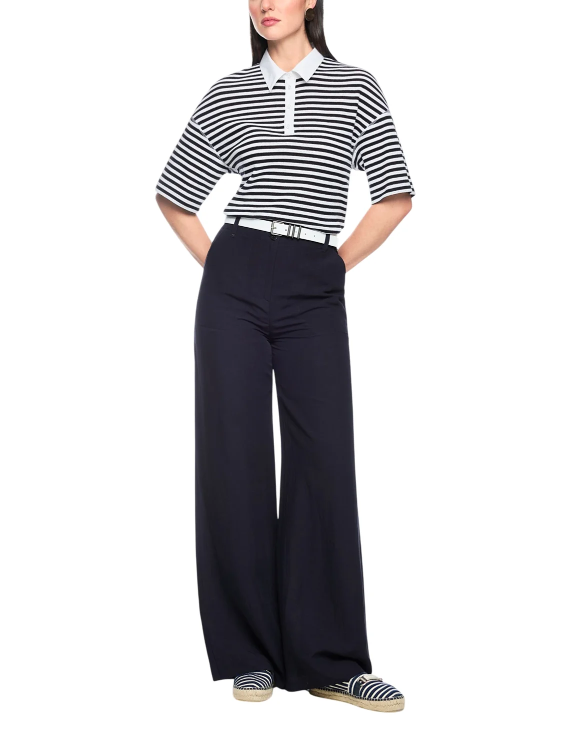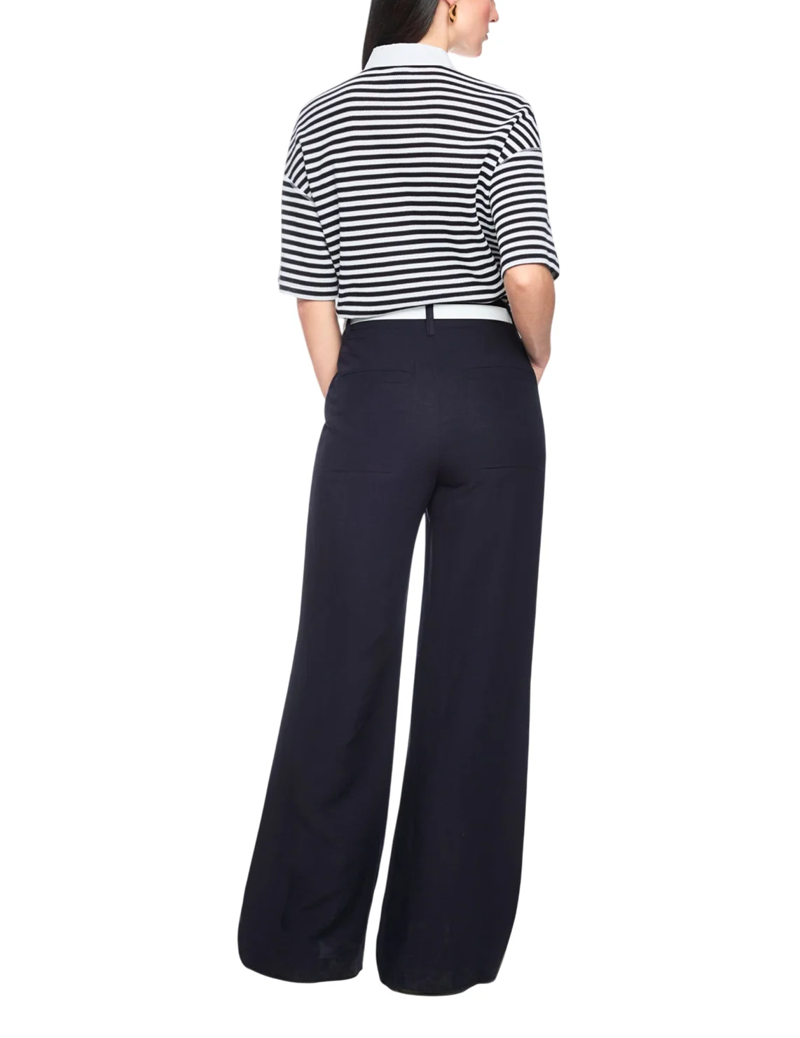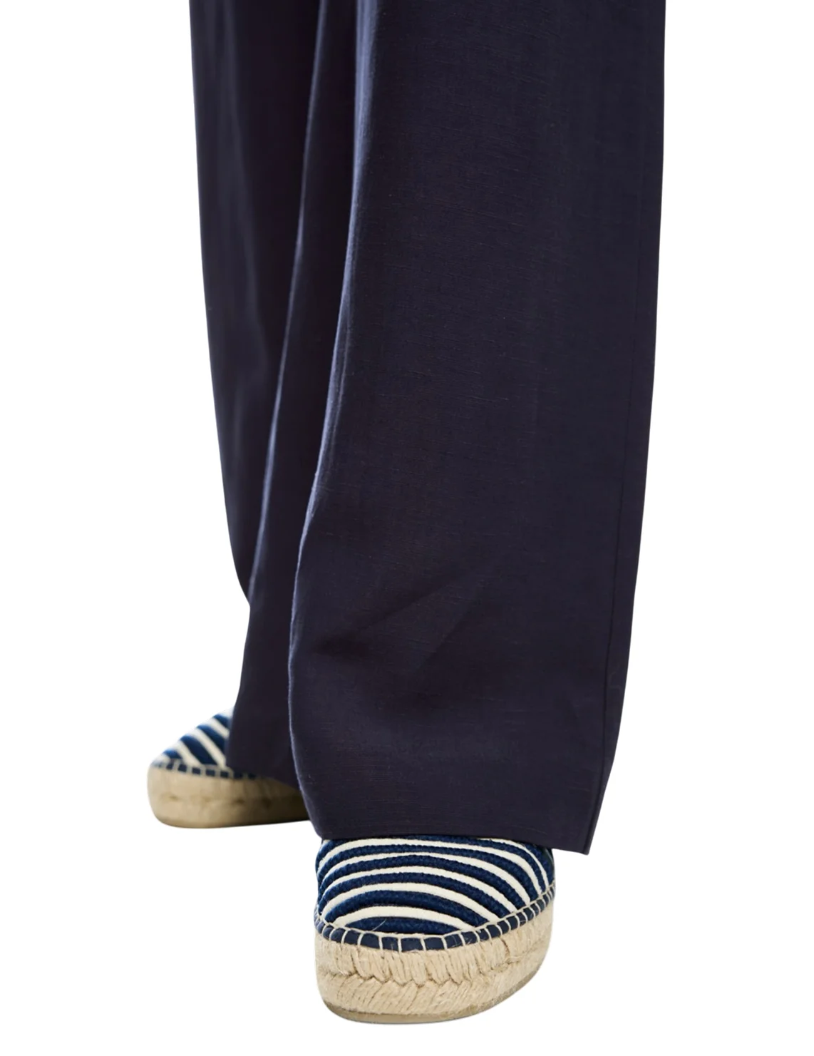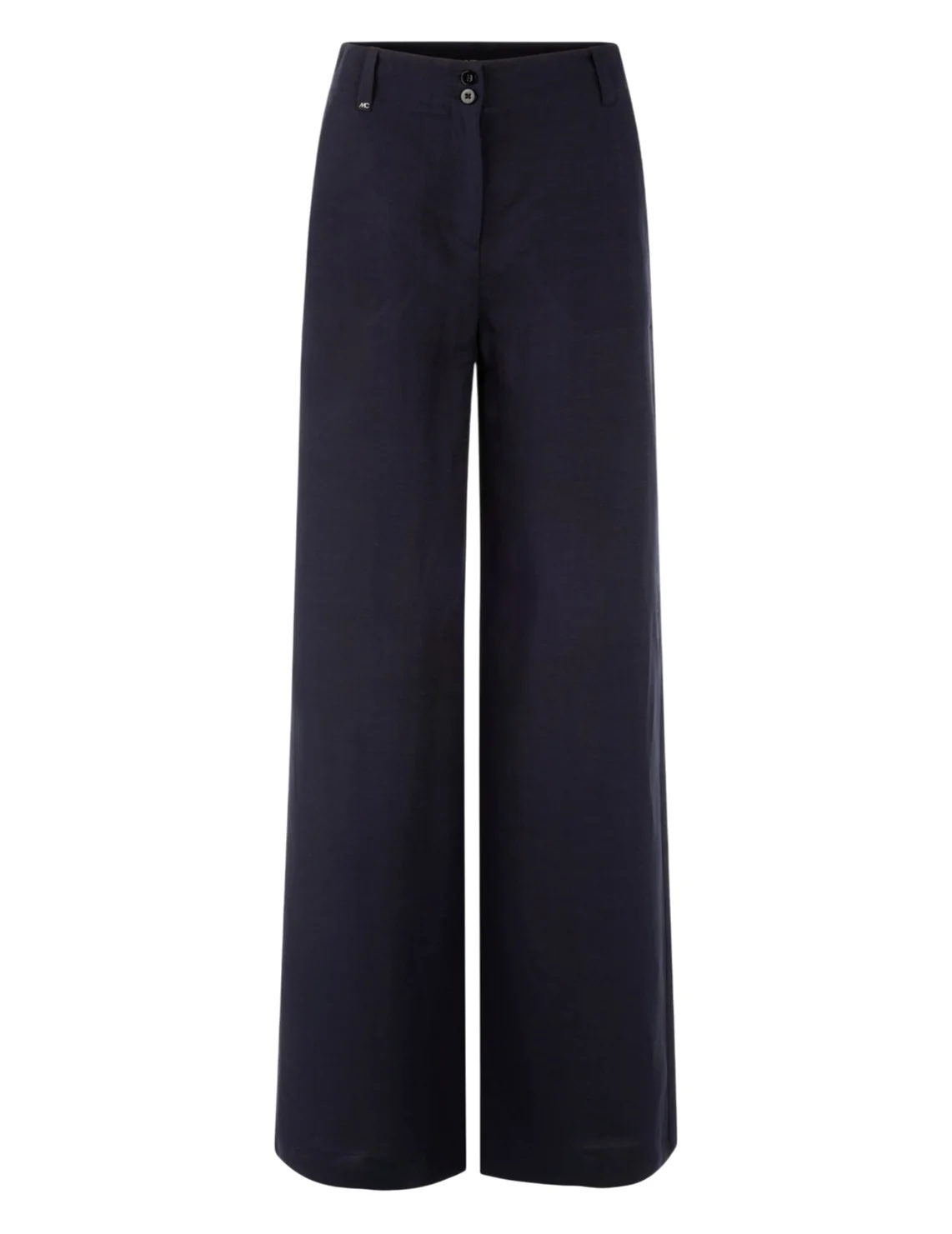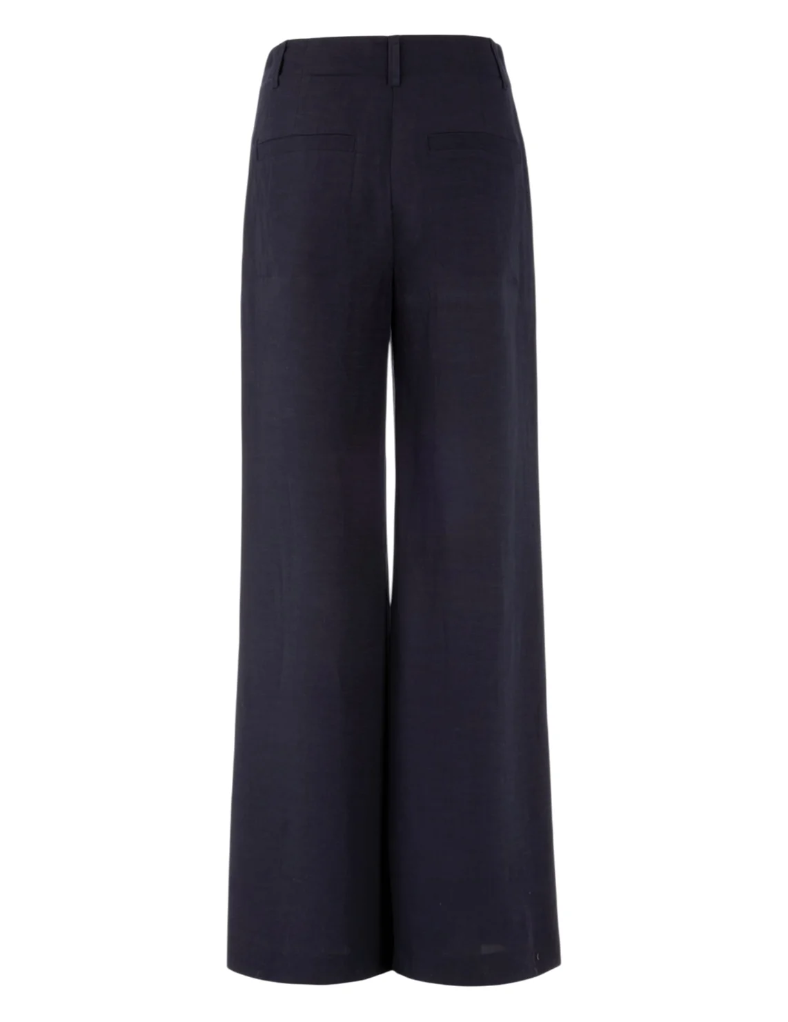 Брюки изготовлены из вискозы и льна. Модель выполнена в свободном крое. Имеет петли для ремня, скрытую застежку-молнию с пуговицами, прорезные боковые и накладные задние карманы.