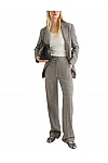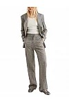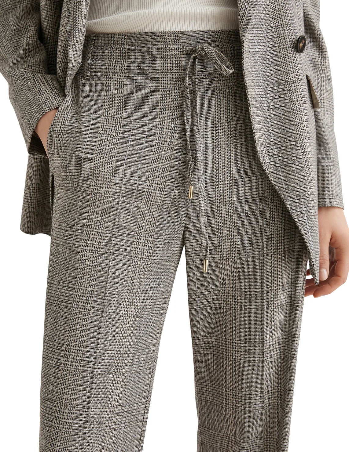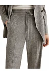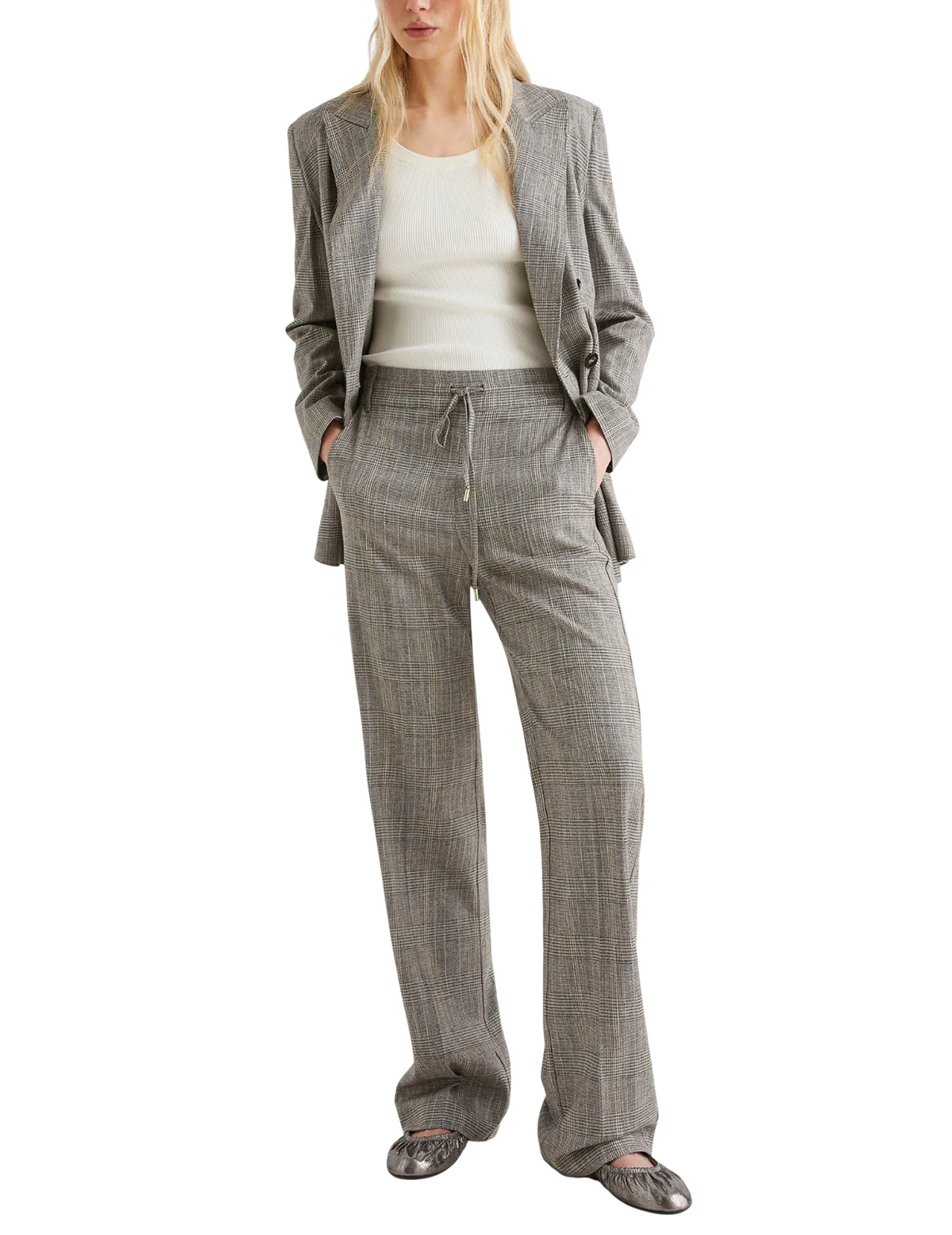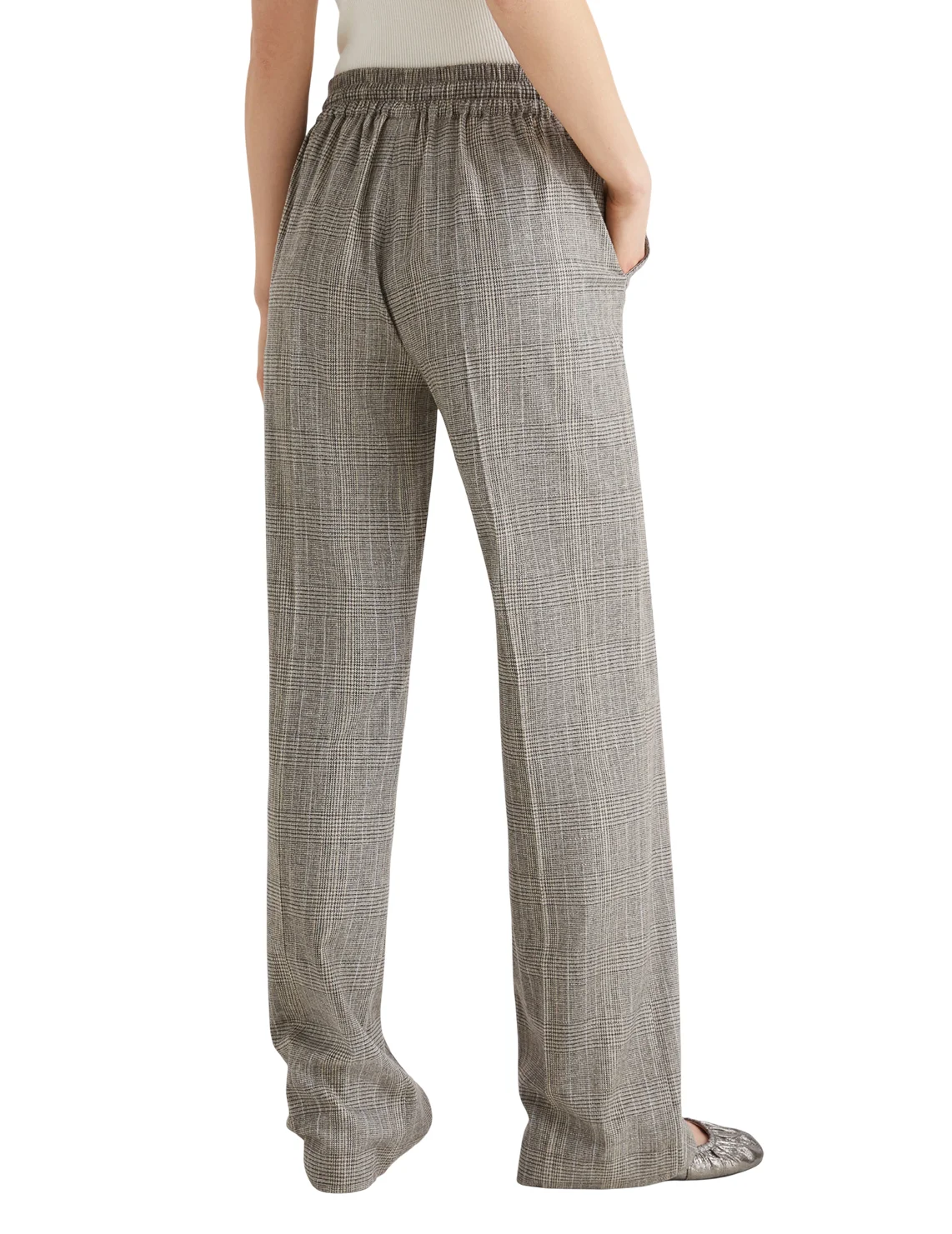 Брюки изготовлены из вискозы, шерсти, полиэстера и эластана. Модель выполнена в свободном крое. Имеет петли для ремня, эластичный пояс, кулиску, прессованные стрелки и два боковых прорезных кармана. Декорированы принтом в клетку.