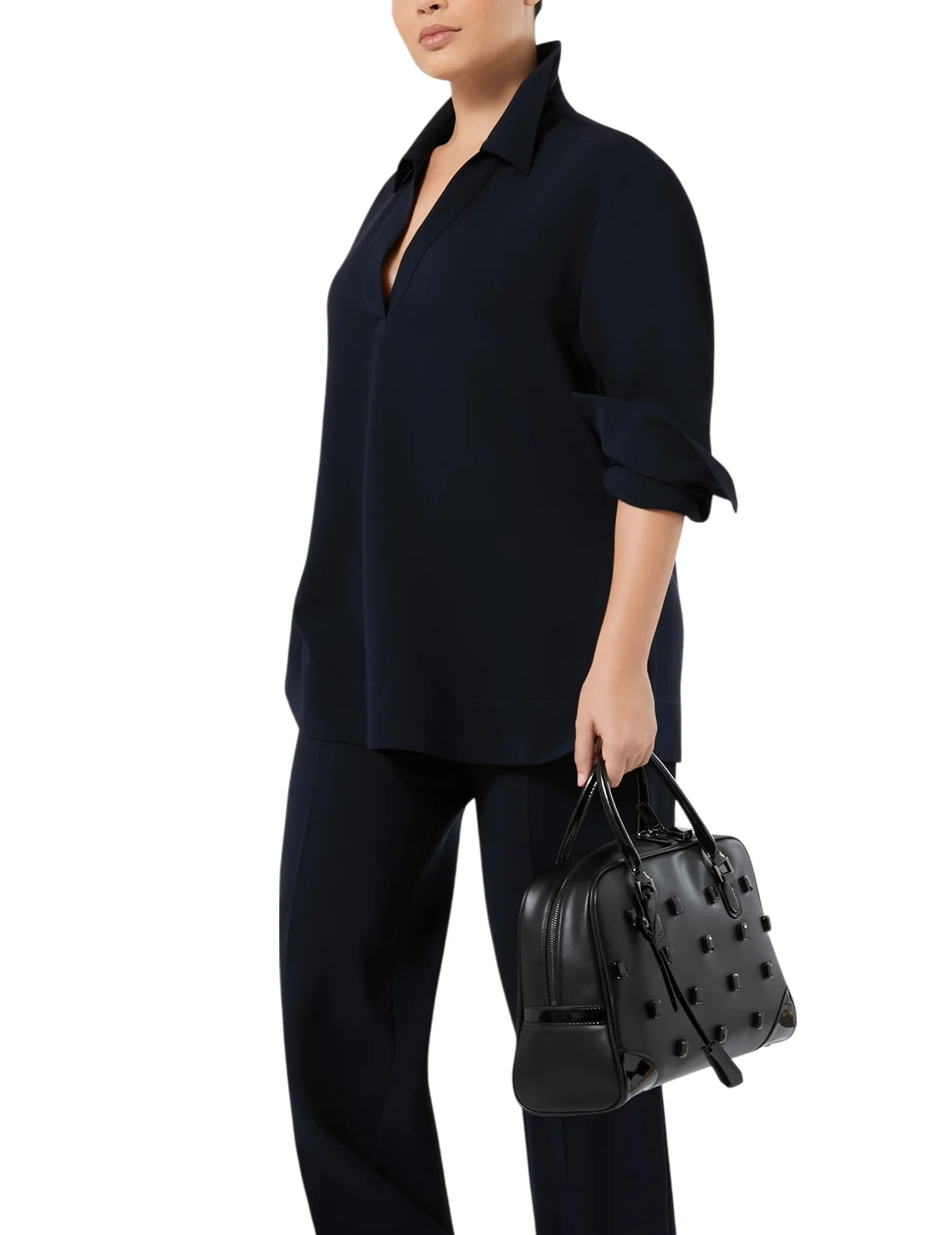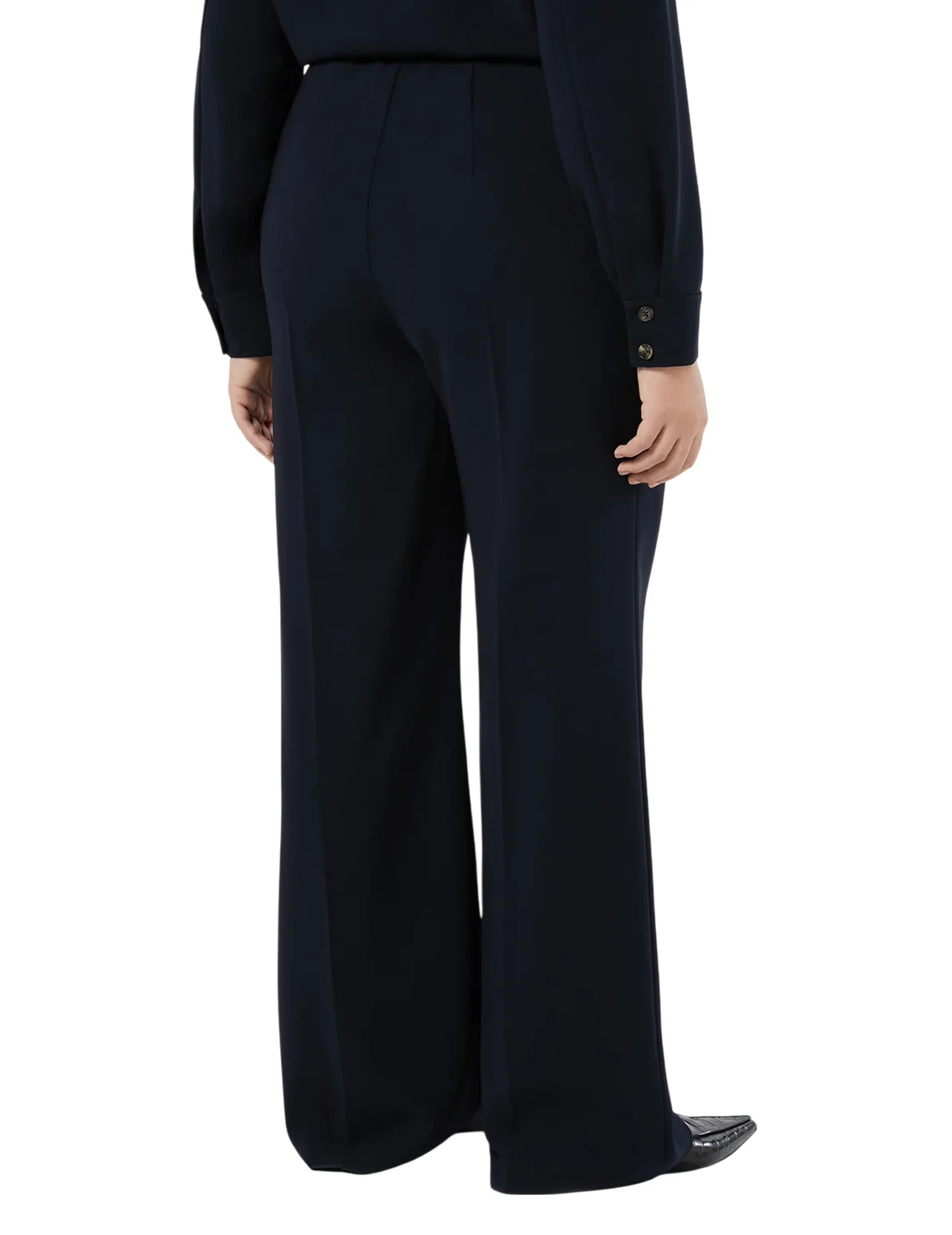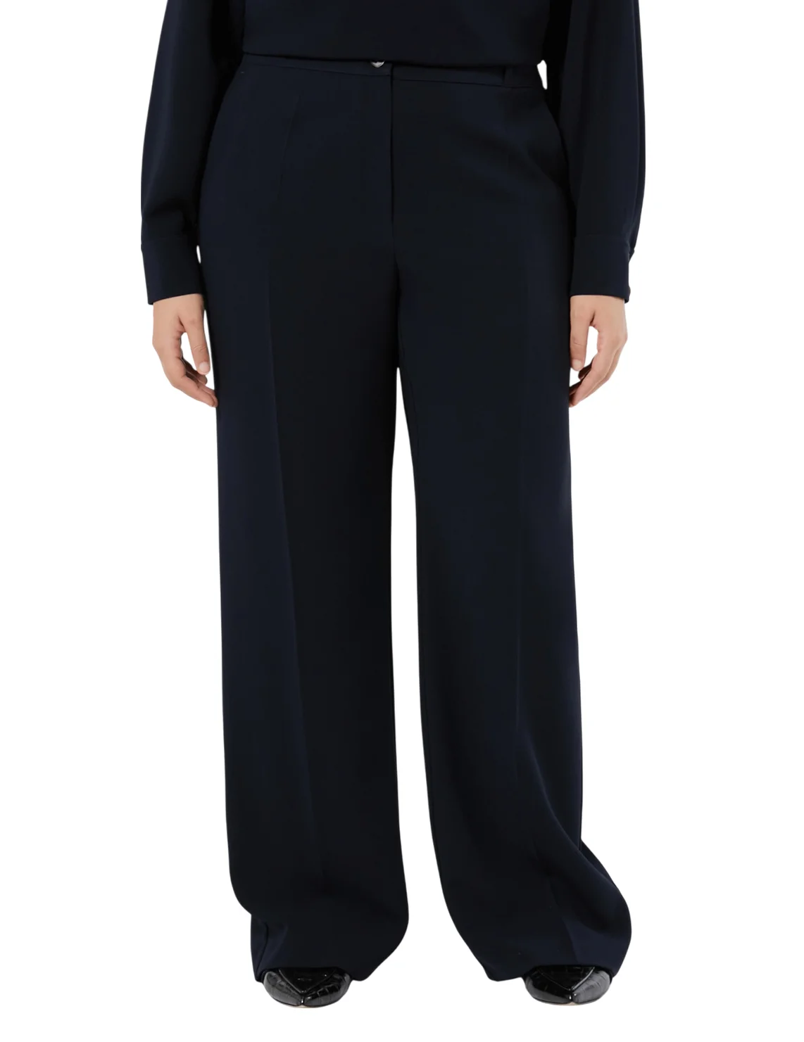 Брюки изготовлены из триацетата и полиэстера. Модель выполнена в свободном крое. Имеет эластичную вставку сзади на поясе, скрытую застежку-молнию с пуговицей, прорезные карманы и прессованные стрелки.