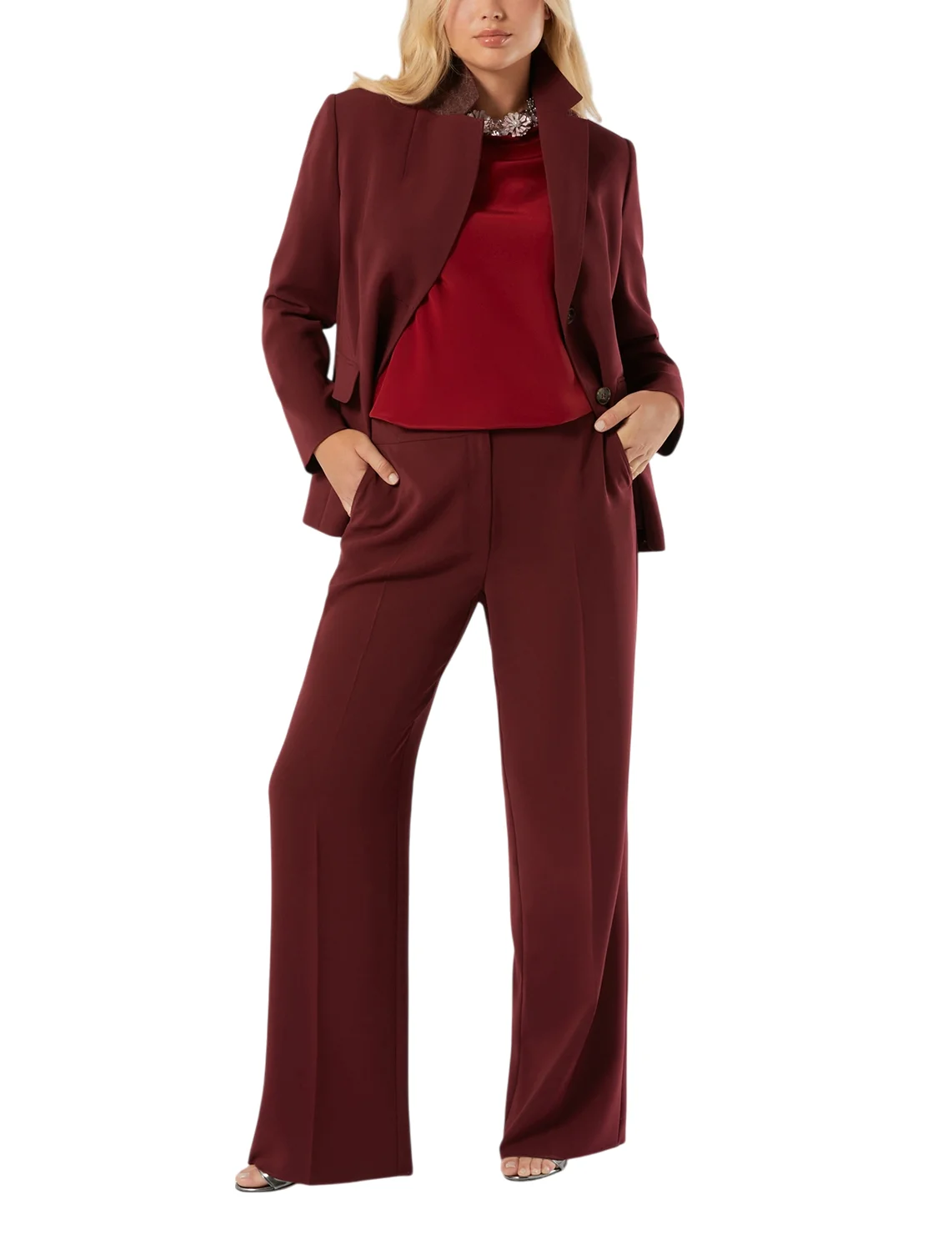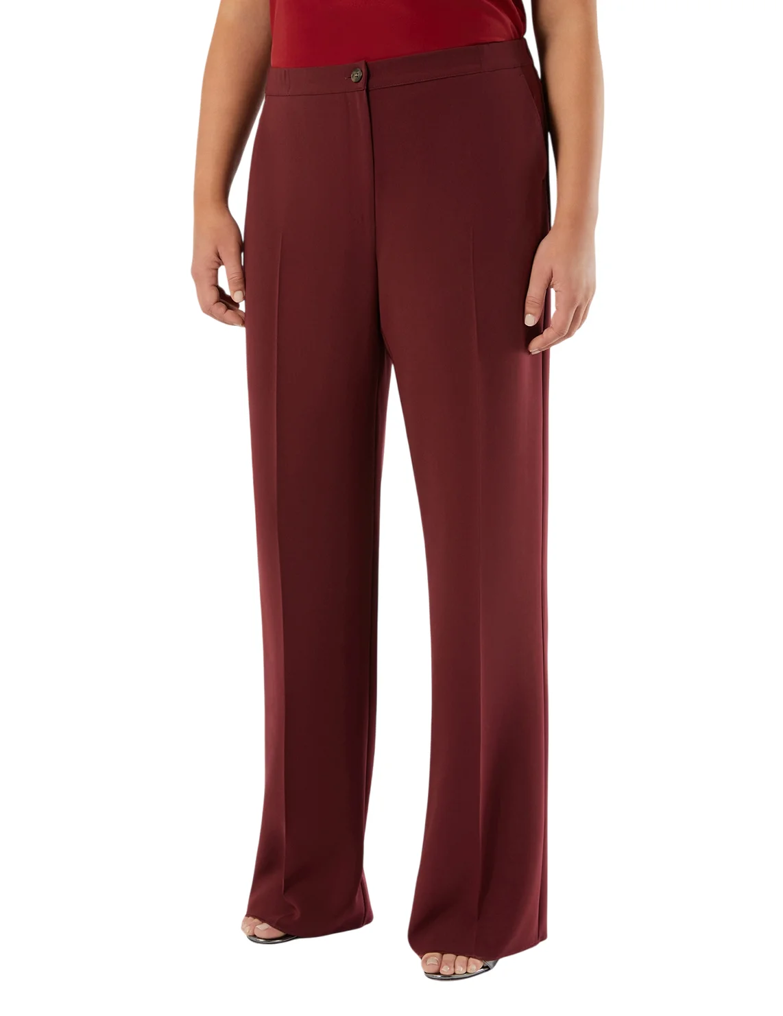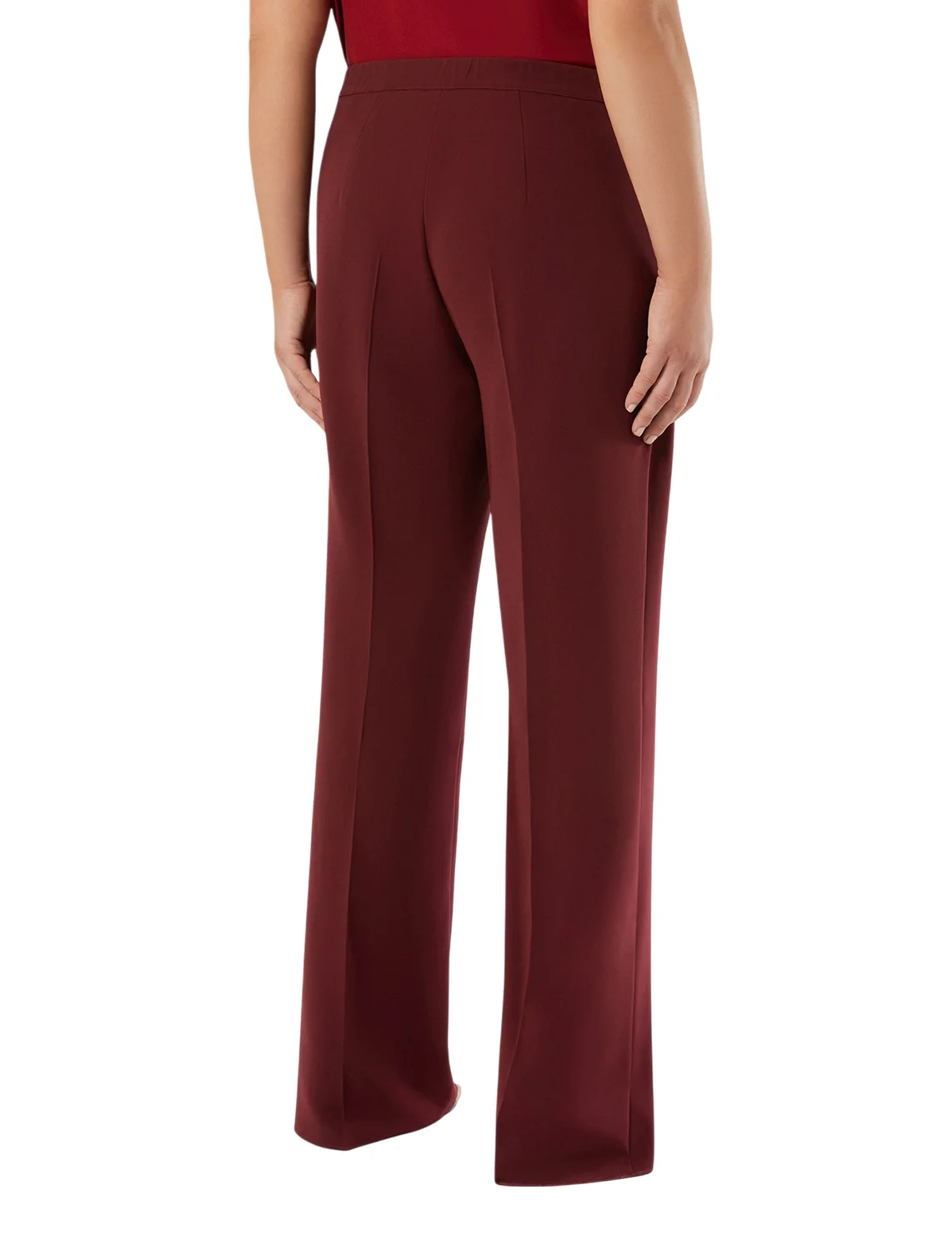 Брюки изготовлены из триацетата и полиэстера. Модель выполнена в свободном крое. Имеет эластичную вставку сзади на поясе, скрытую застежку-молнию с пуговицей, прорезные карманы и прессованные стрелки.