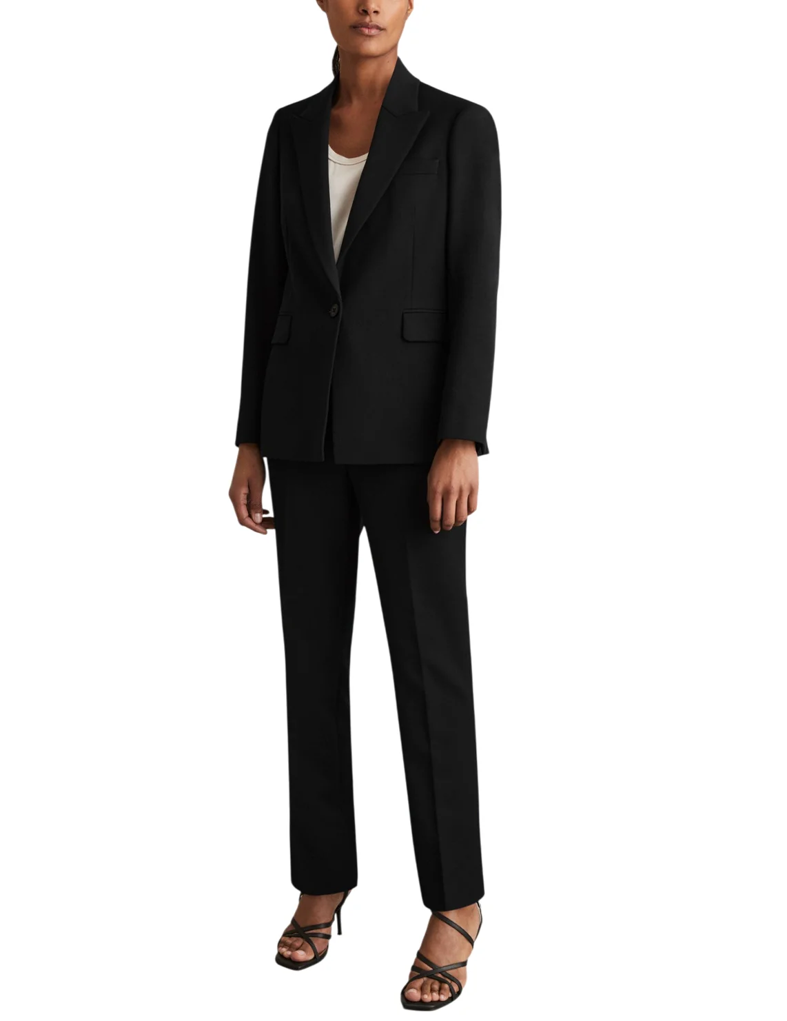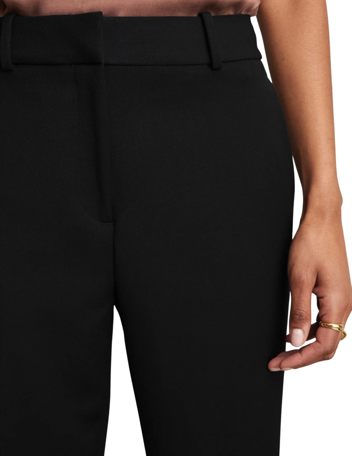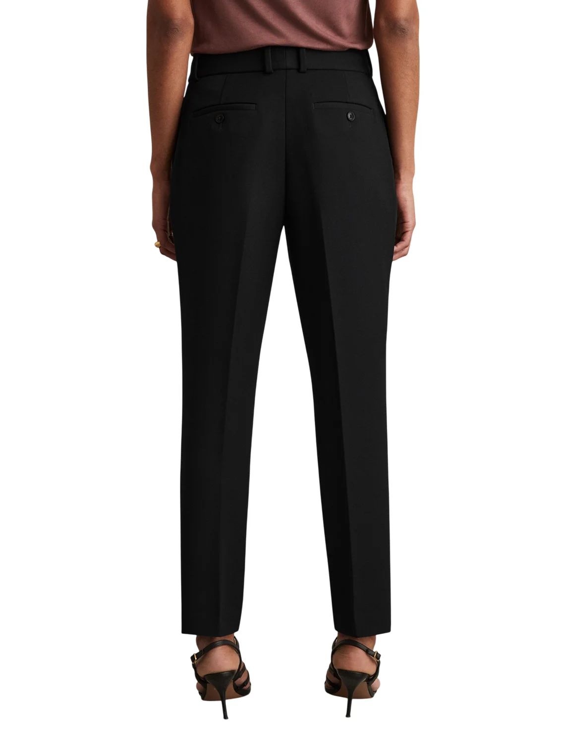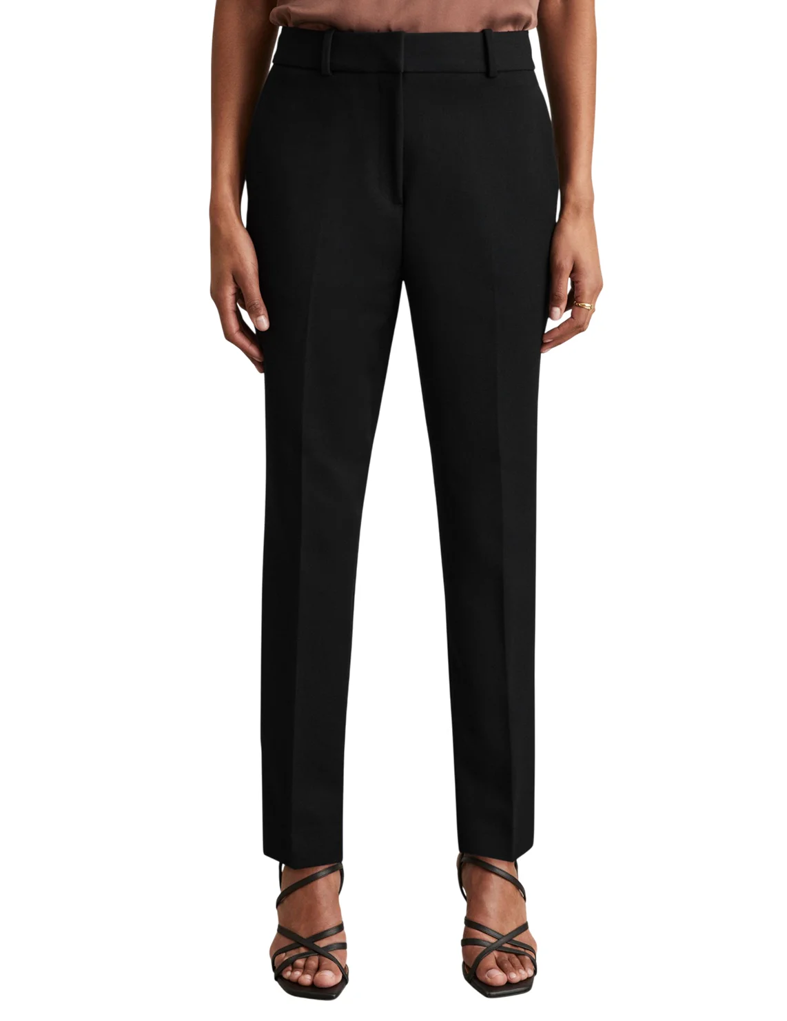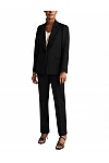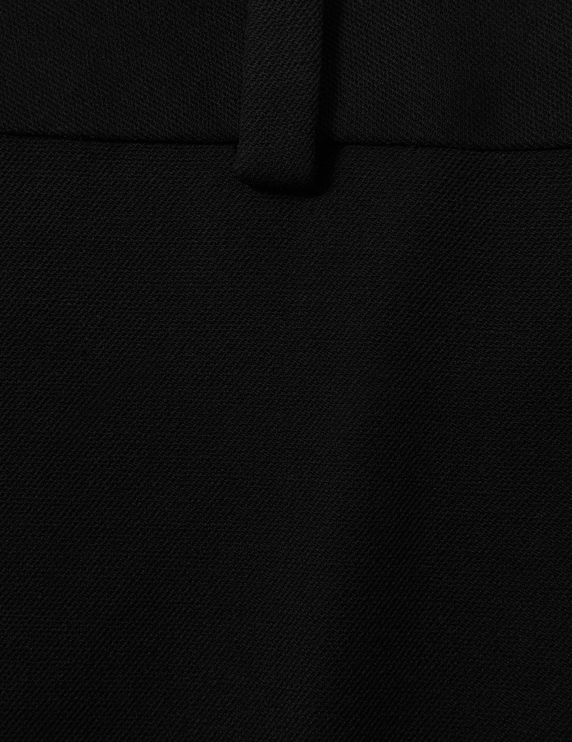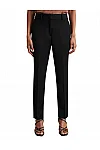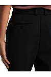 Брюки изготовлены из полиэстера, вискозы и эластана. Выполнены в зауженном крое. Имеют боковые прорезные карманы, застежку на молнии с крючком, петли для ремня и прессованные стрелки.