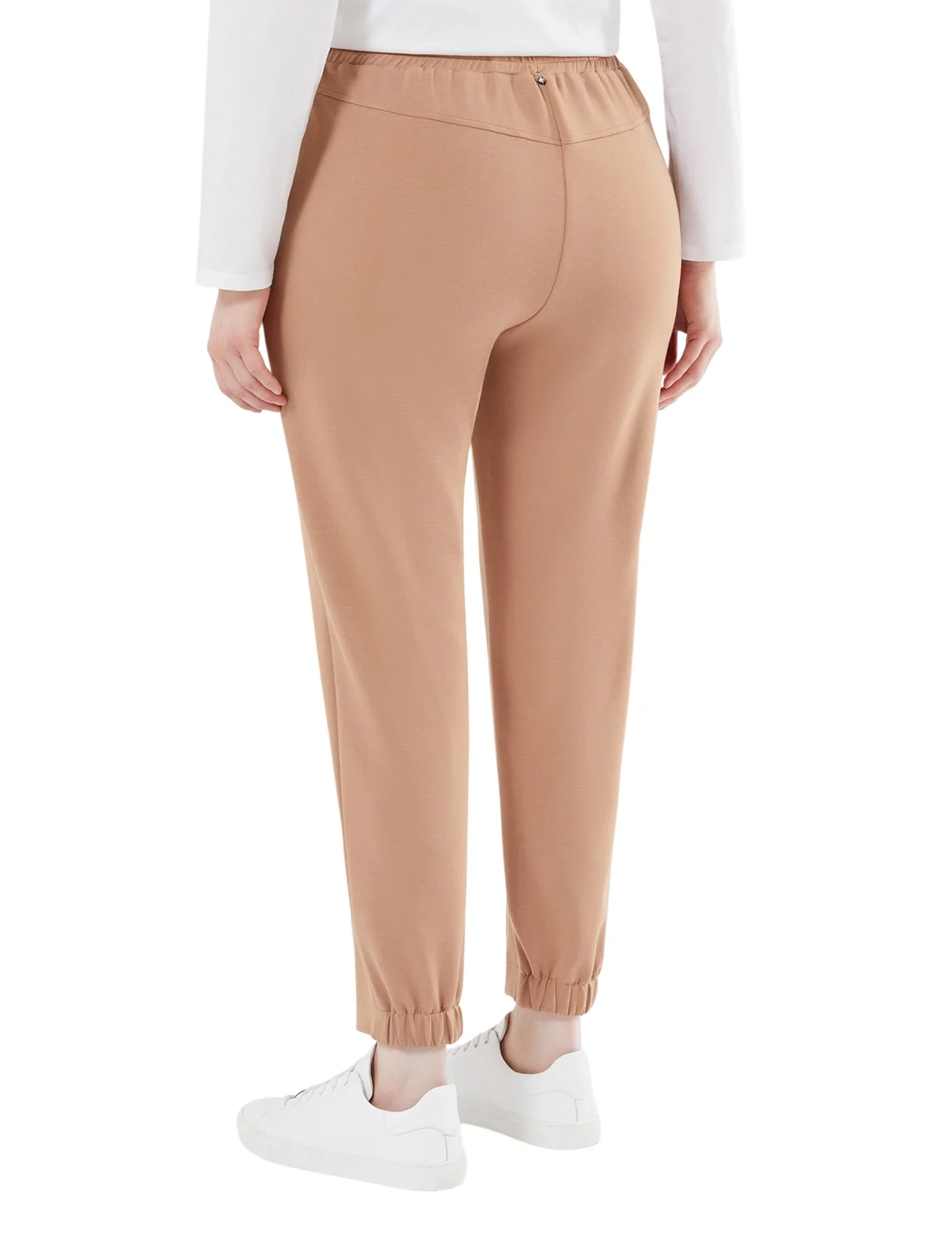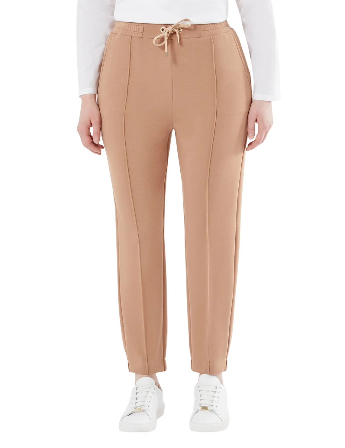 Брюки изготовлены из полиамида, вискозы и эластана. Модель выполнена в зауженном крое. Имеет эластичный пояс с кулиской, простроченные стрелки спереди и прорезные карманы.