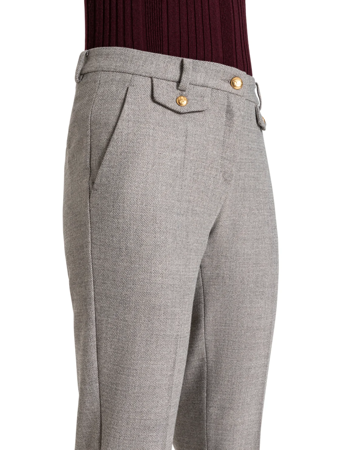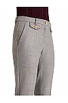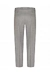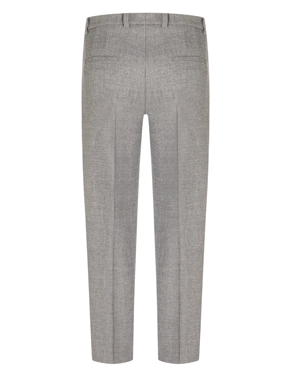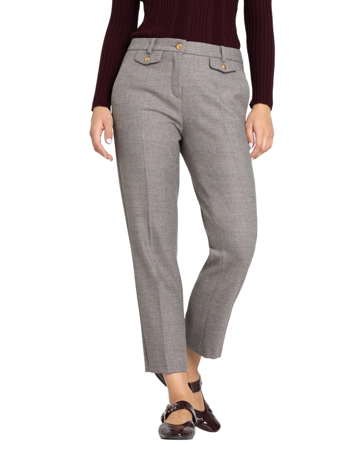 Брюки изготовлены из полиэстера, вискозы, шерсти и эластана. Модель выполнена в прямом крое. Имеет петли для ремня, декоративные клапаны, скрытую застежку-молнию с пуговицей, прессованные стрелки и прорезные карманы.