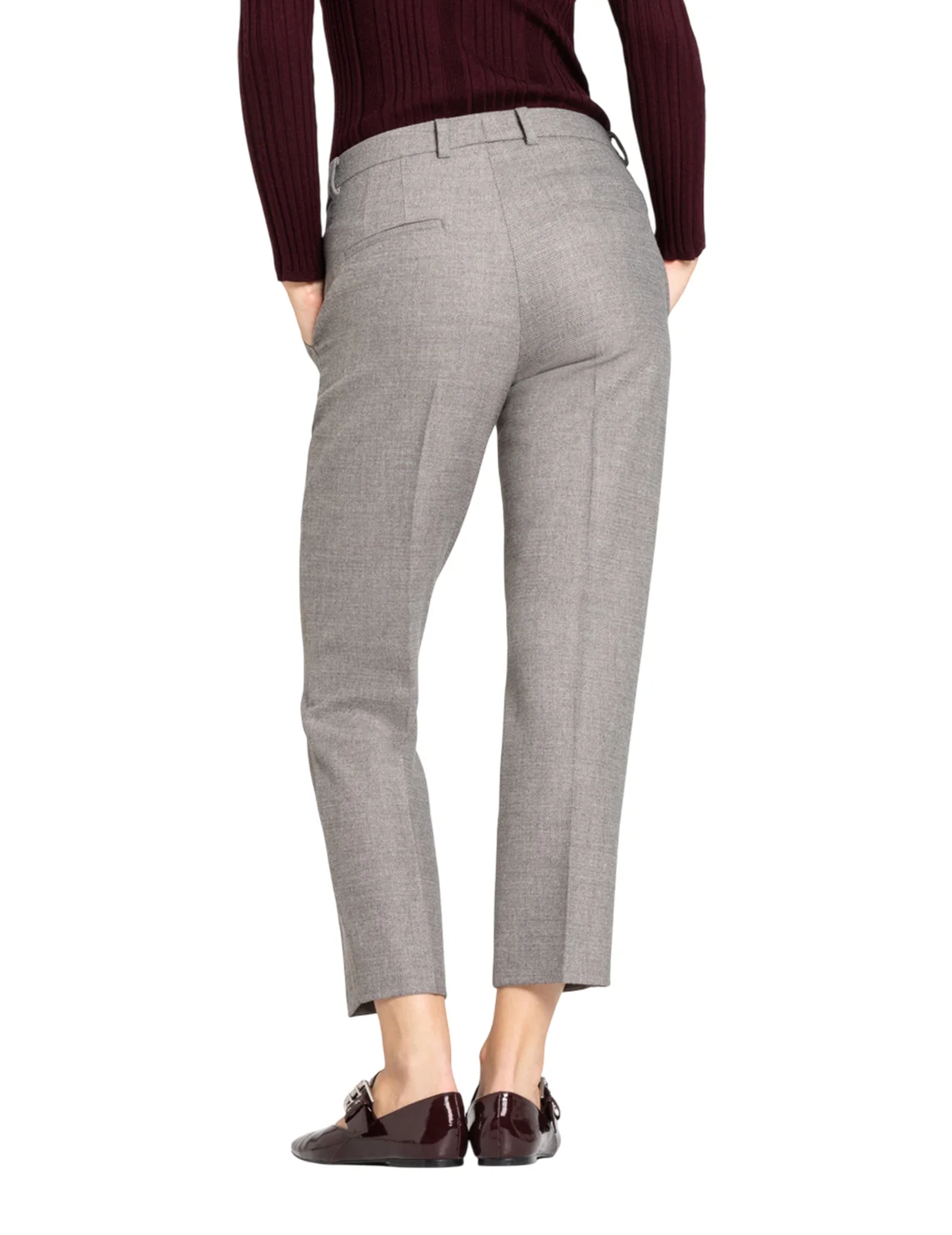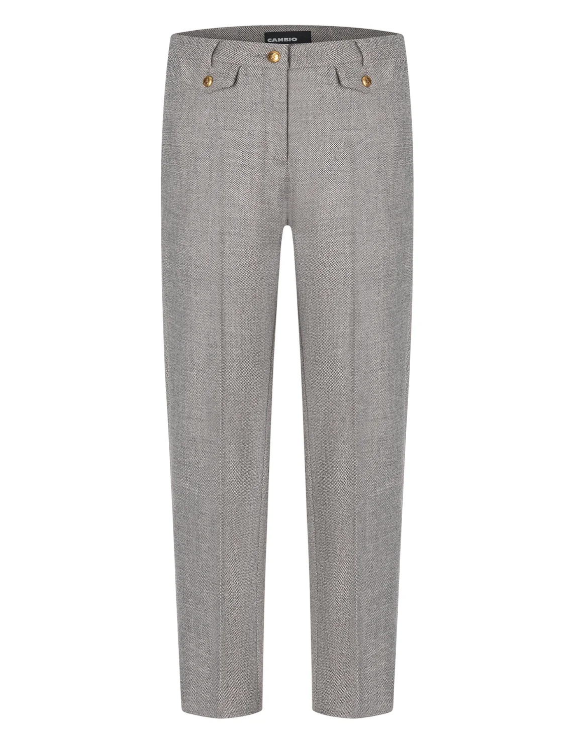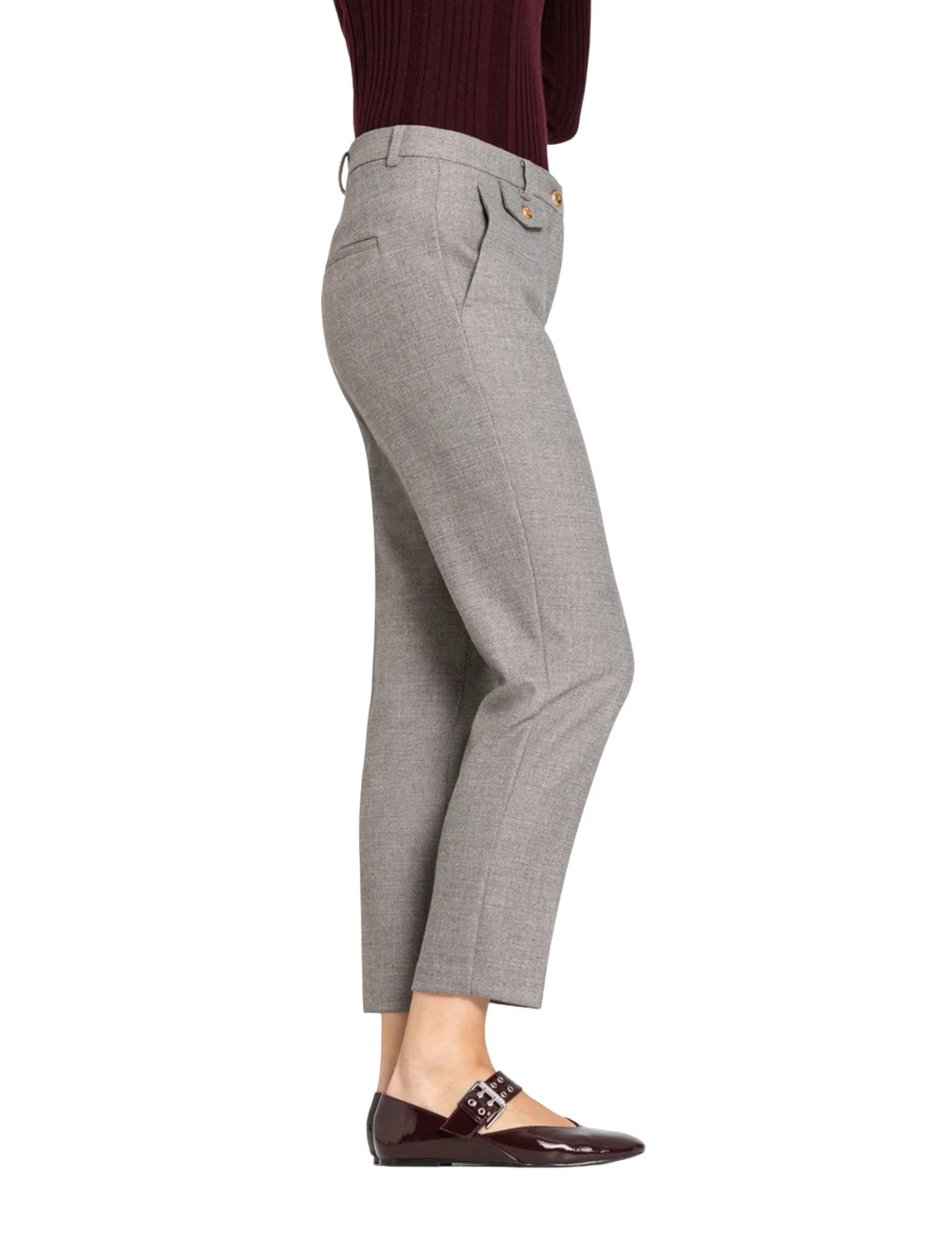 Брюки изготовлены из полиэстера, вискозы, шерсти и эластана. Модель выполнена в прямом крое. Имеет петли для ремня, декоративные клапаны, скрытую застежку-молнию с пуговицей, прессованные стрелки и прорезные карманы.