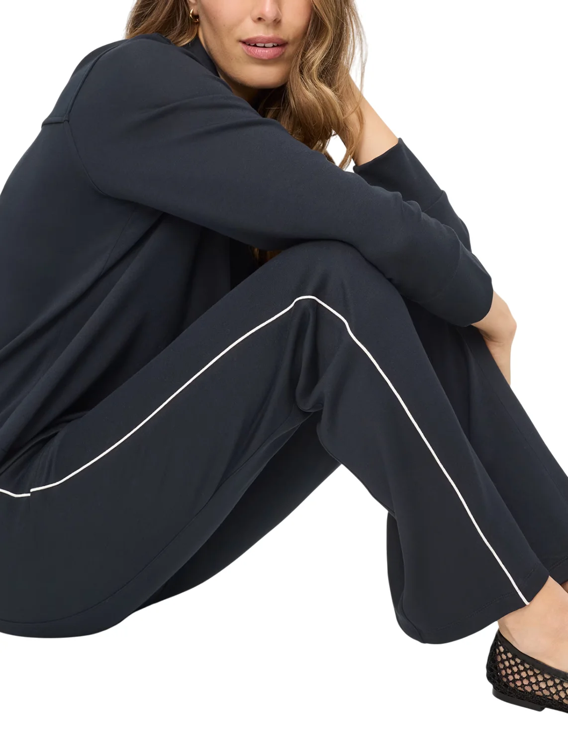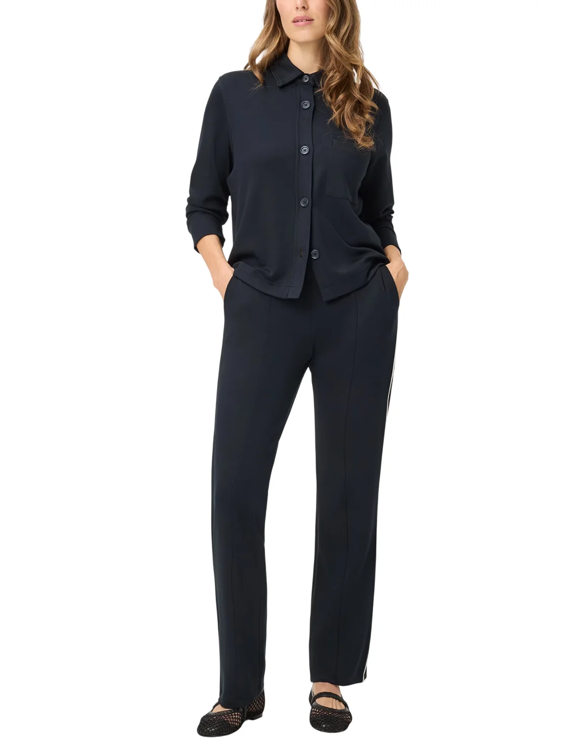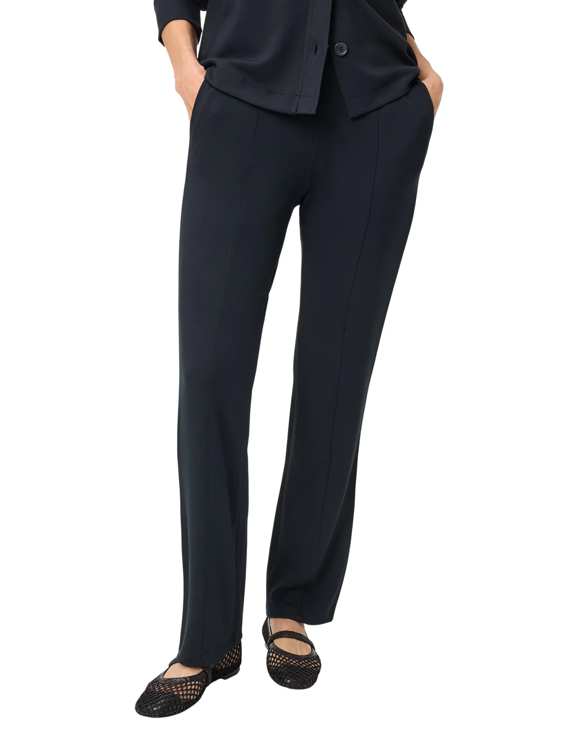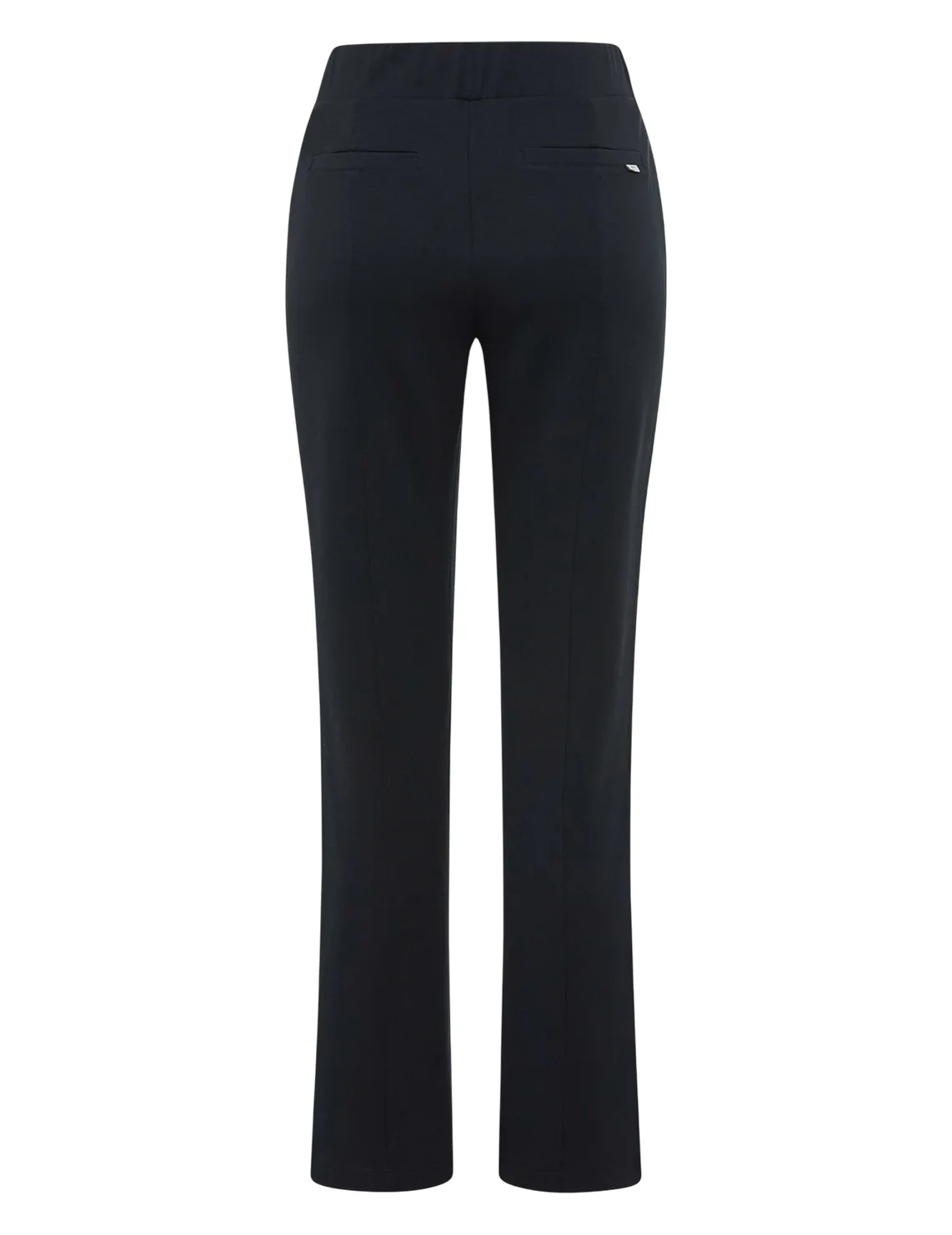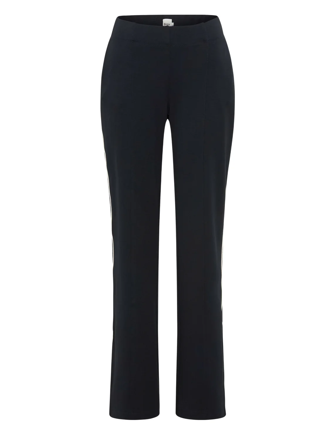 Брюки изготовлены из вискозы, полиэстера и эластана. Модель выполнена в прямом крое. Имеет эластичный пояс, простроченные стрелки, прорезные карманы по бокам и декоративные карманы сзади. Декорированы контрастным кантом по бокам штанин.