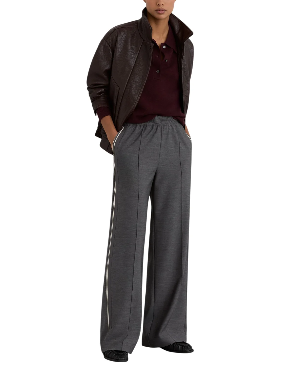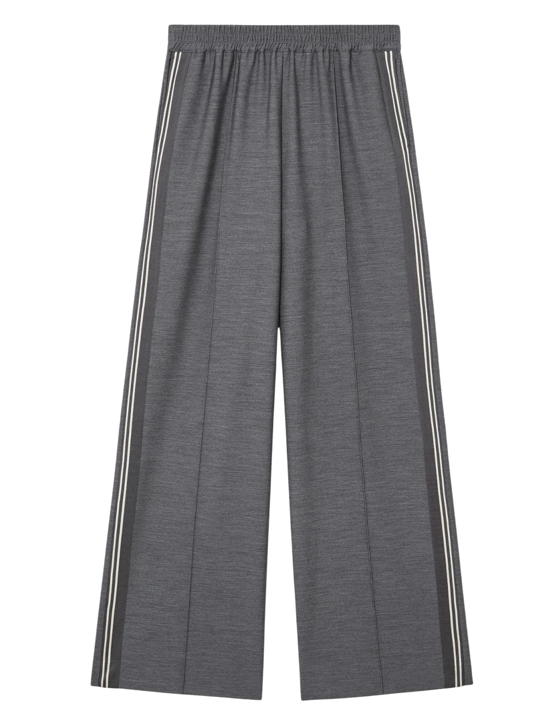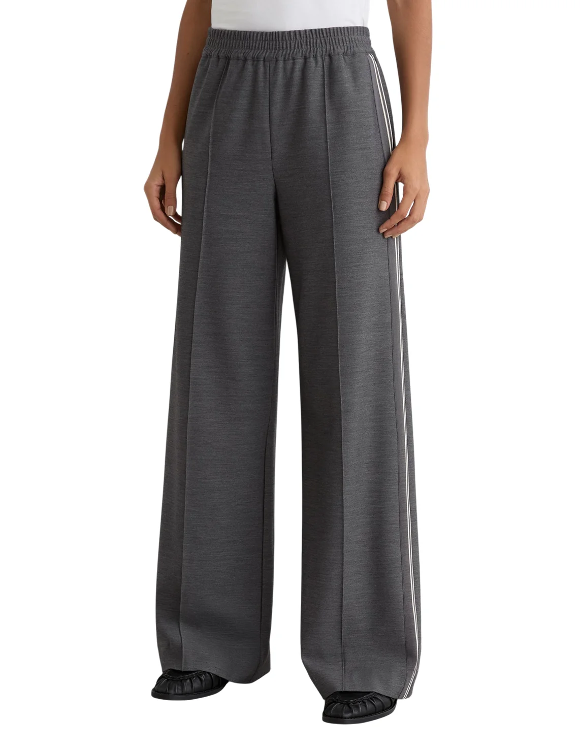 Брюки изготовлены из полиэстера, вискозы и эластана. Модель выполнена в свободном крое. Имеет эластичный пояс, лампасы, простроченные стрелки спереди, прорезные боковые карманы и один накладной карман сзади.