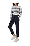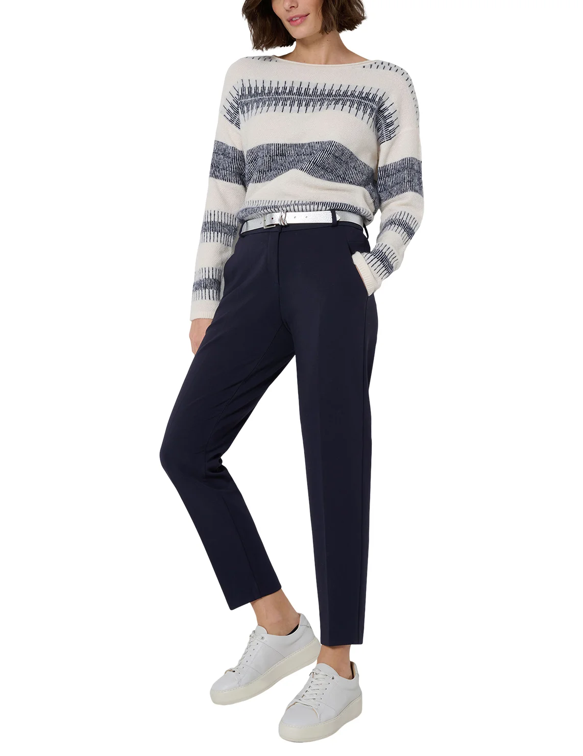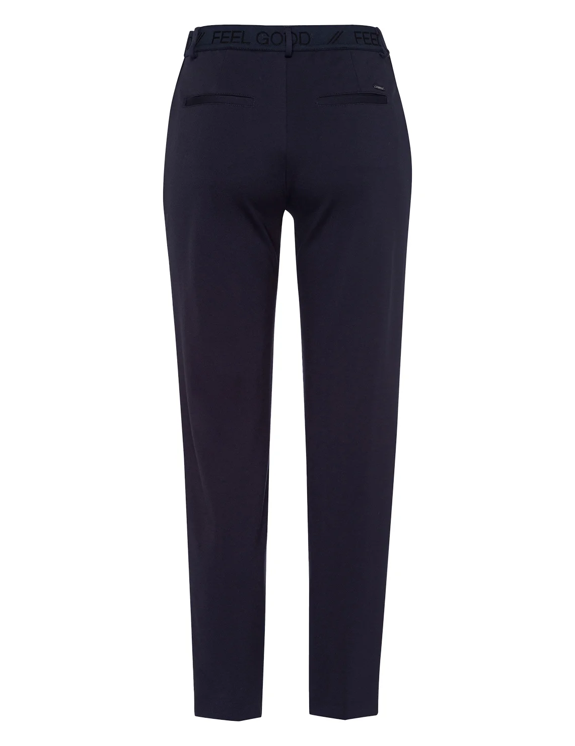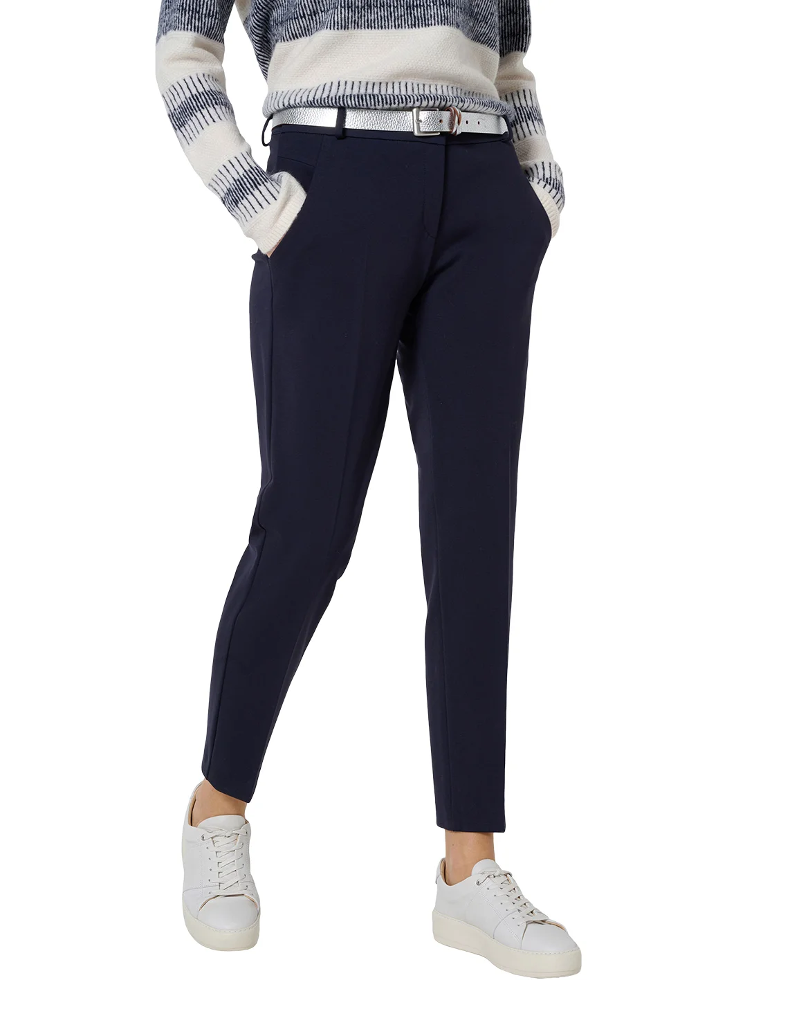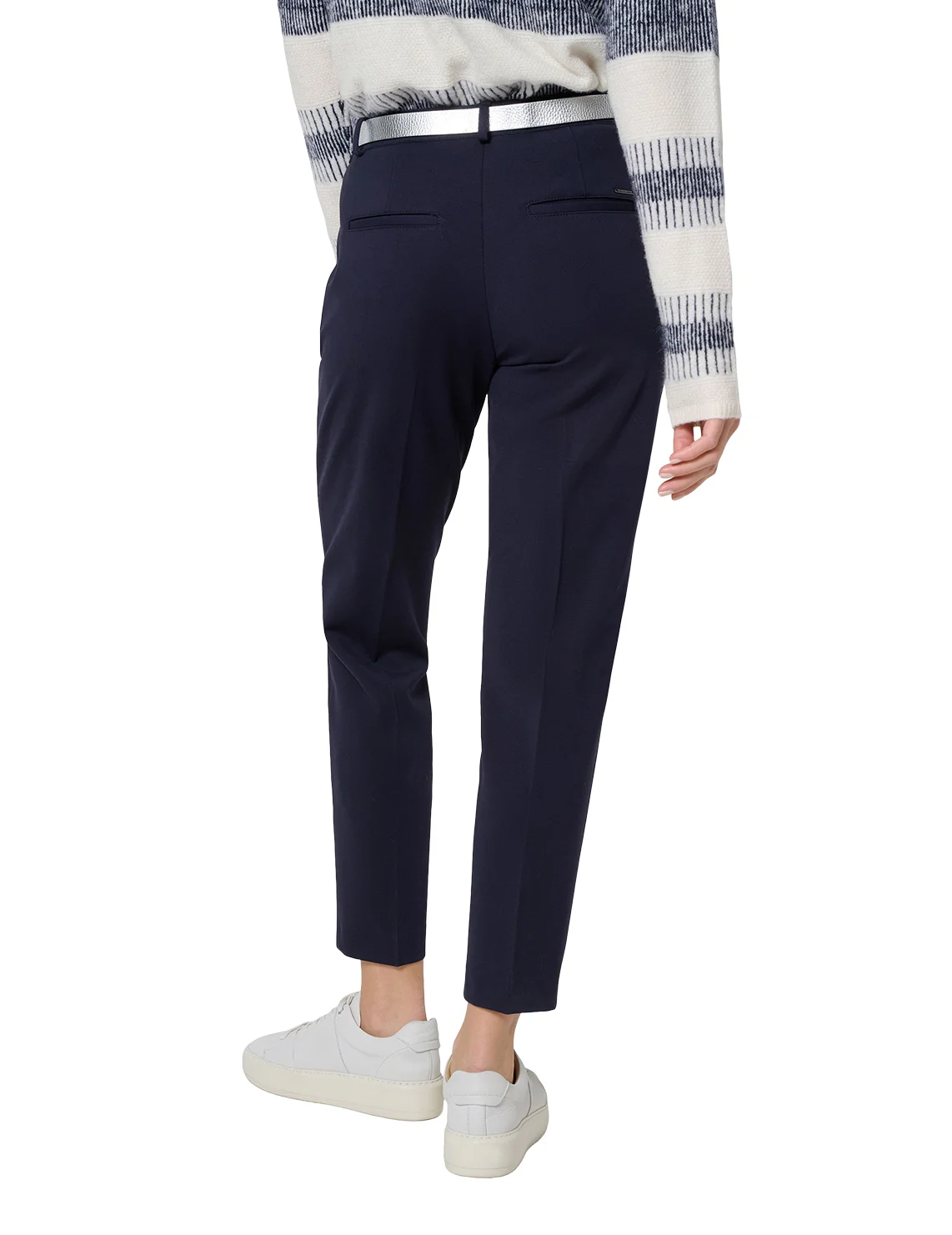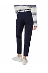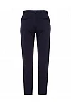 Брюки изготовлены из вискозы, полиамида и эластана. Модель выполнена в прямом крое. Имеет шлёвки для ремня, прессованные стрелки, скрытую застежку-молнию, а также пару боковый и пару задних прорезных карманов.