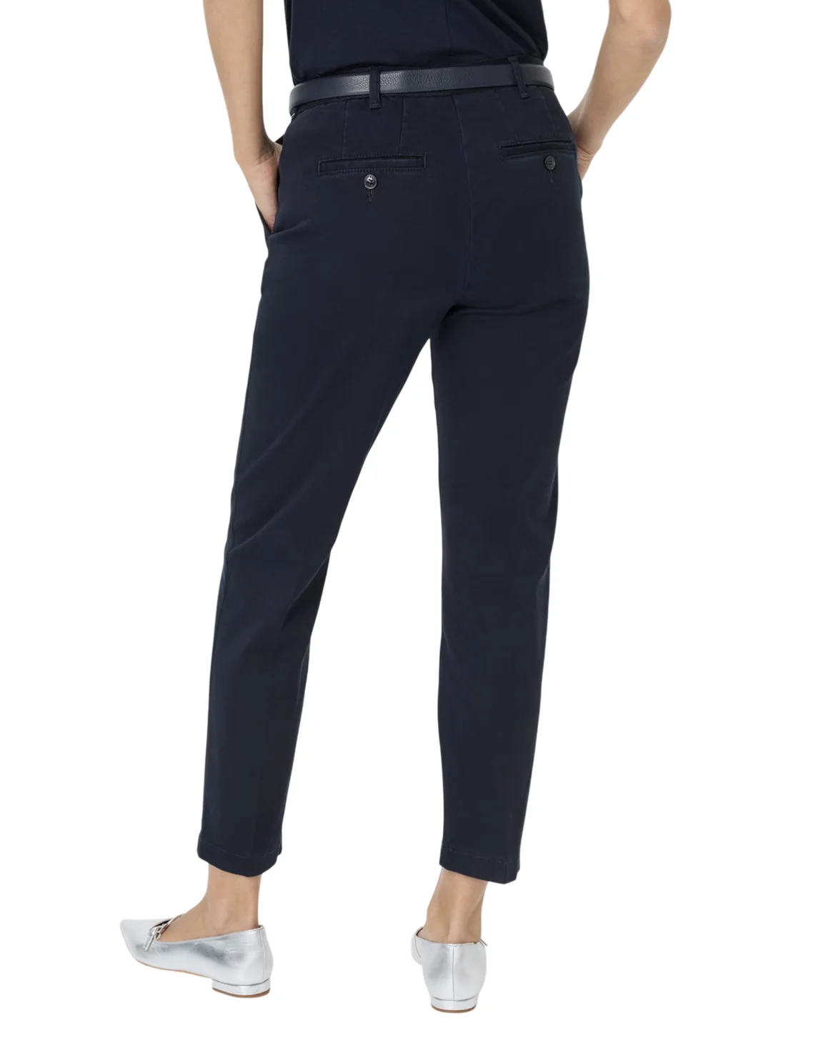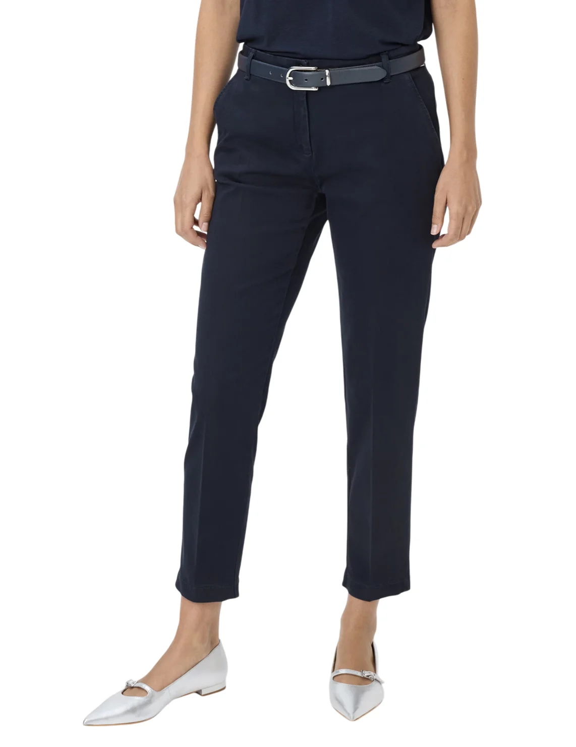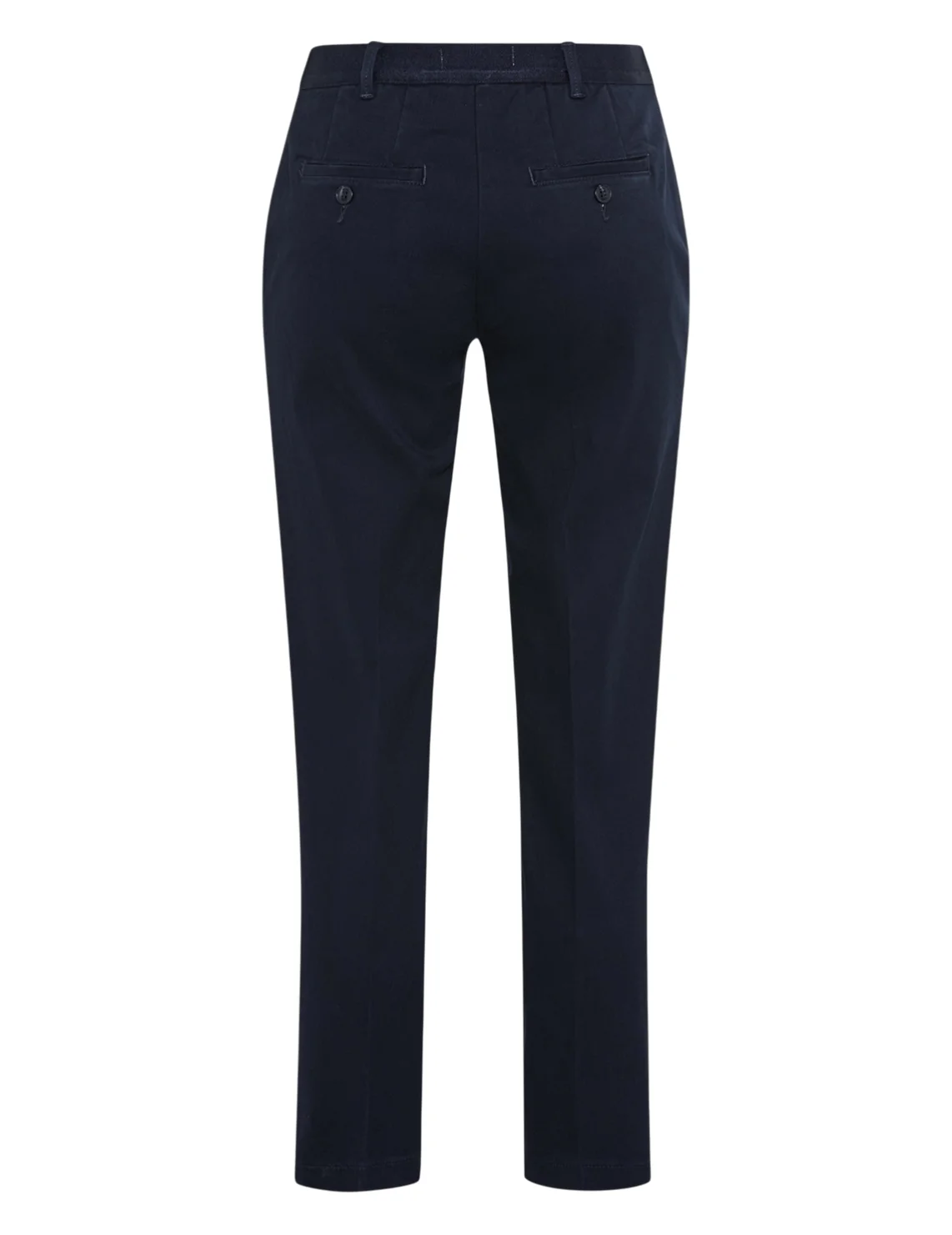 Брюки изготовлены из лиоцелла, модала, хлопка и эластомультиэстера. Модель выполнена в прямом крое. Имеет петли для ремня, прессованные стрелки, скрытую застежку-молнию с пуговицей и прорезные карманы.