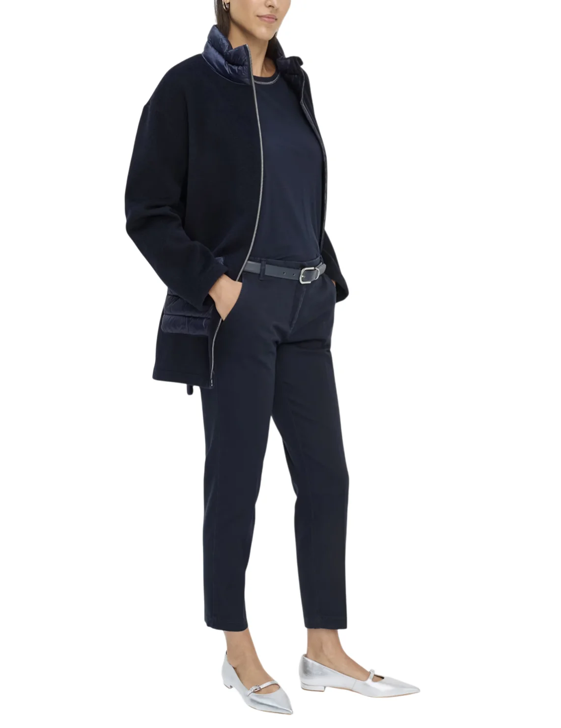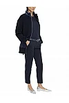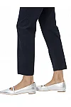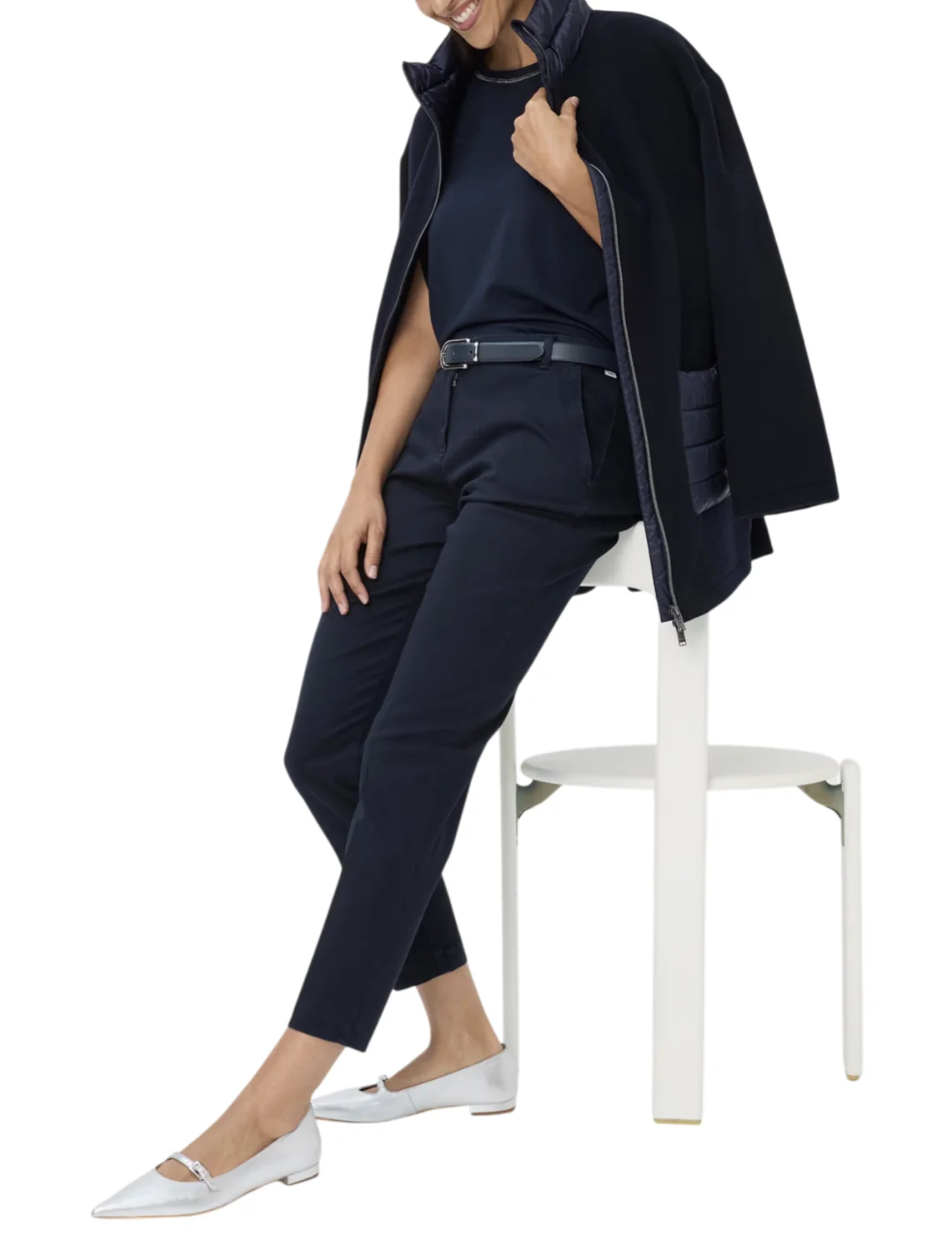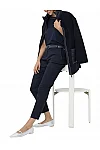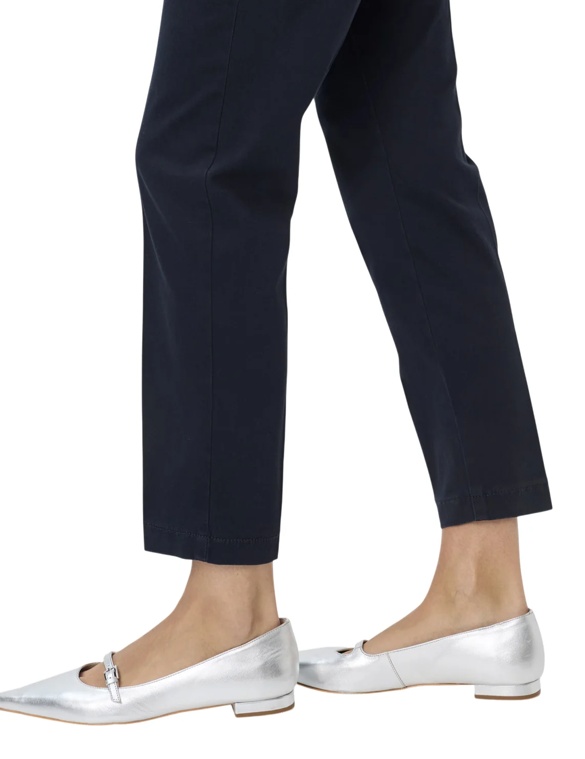 Брюки изготовлены из лиоцелла, модала, хлопка и эластомультиэстера. Модель выполнена в прямом крое. Имеет петли для ремня, прессованные стрелки, скрытую застежку-молнию с пуговицей и прорезные карманы.